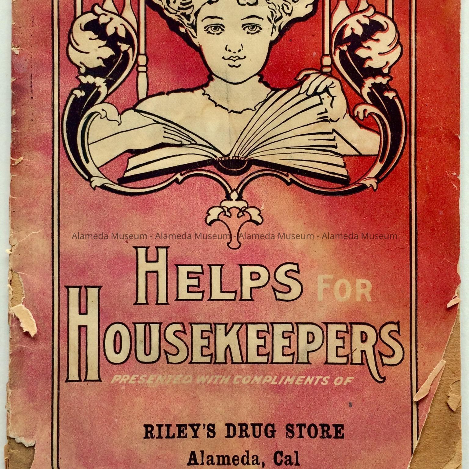 HISTORY OF OBJECT: PAMPHLET, HELPS FOR HOUSEKEEPERS, PRESENTED WITH COMPLIMENTS OF RILEYS DRUG STORE (SOUTHEAST CORNER PARK STREET AND SANTA CLARA AVENUE), ALAMEDA, CAL. PROBABLY AN ADVERTISING GIVE AWAY.