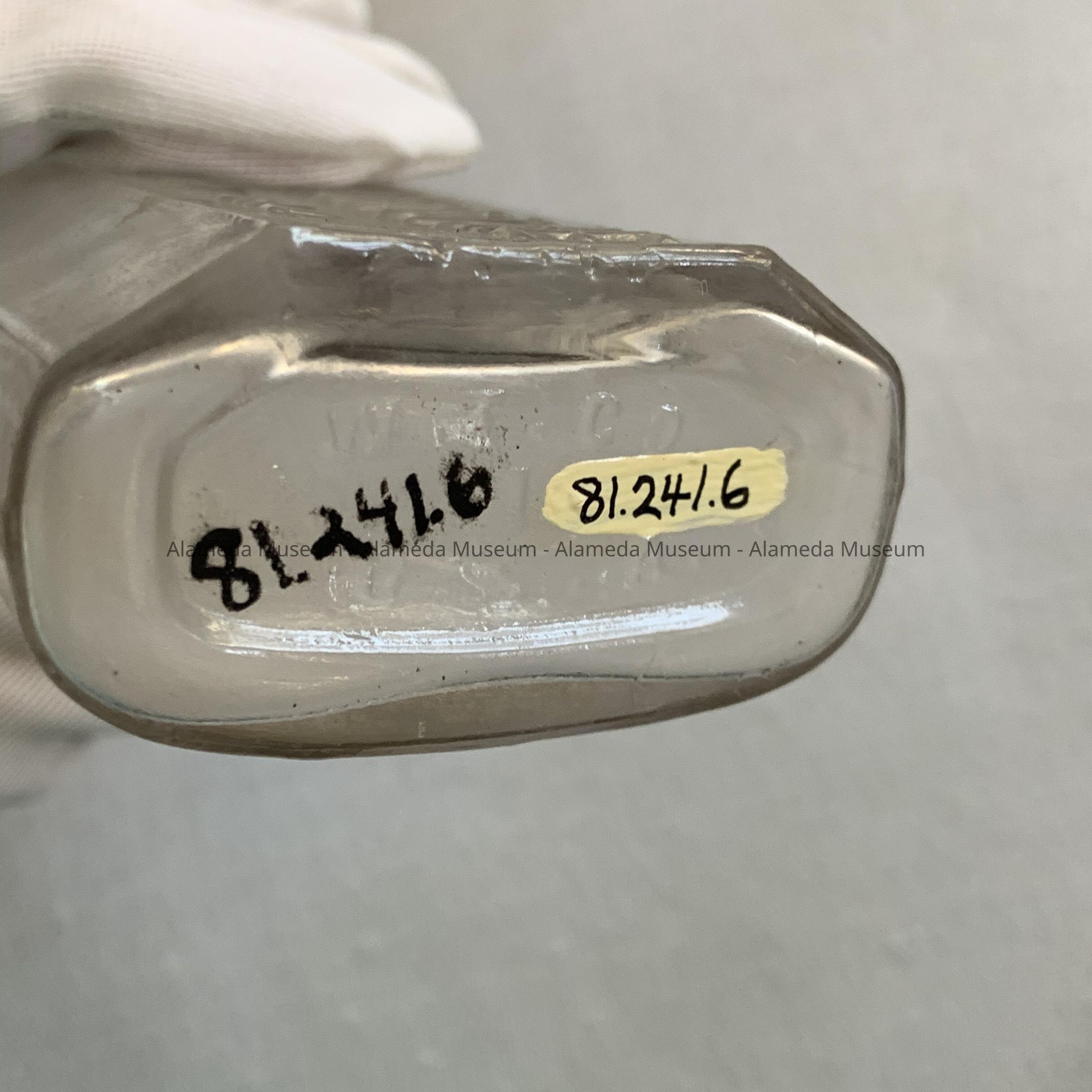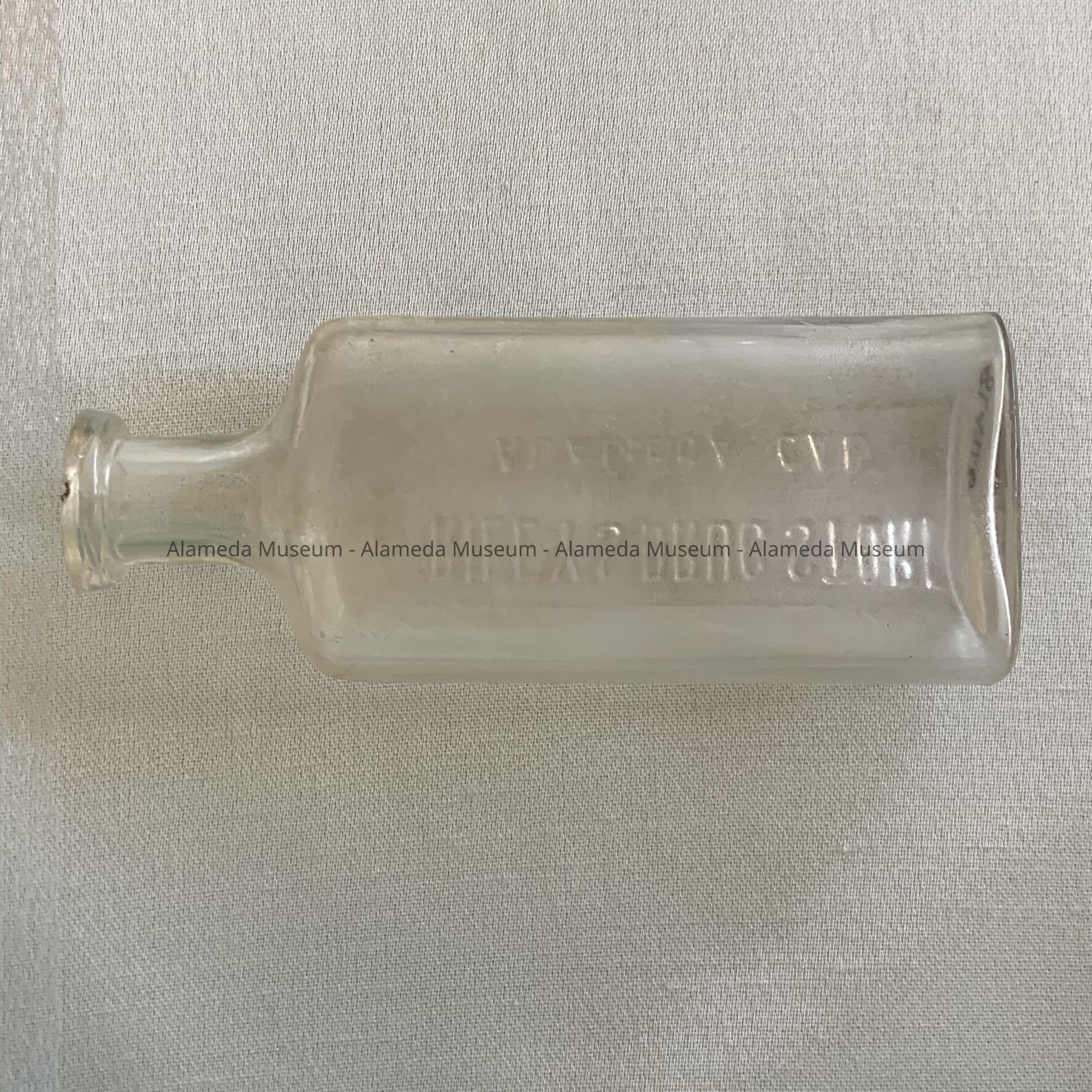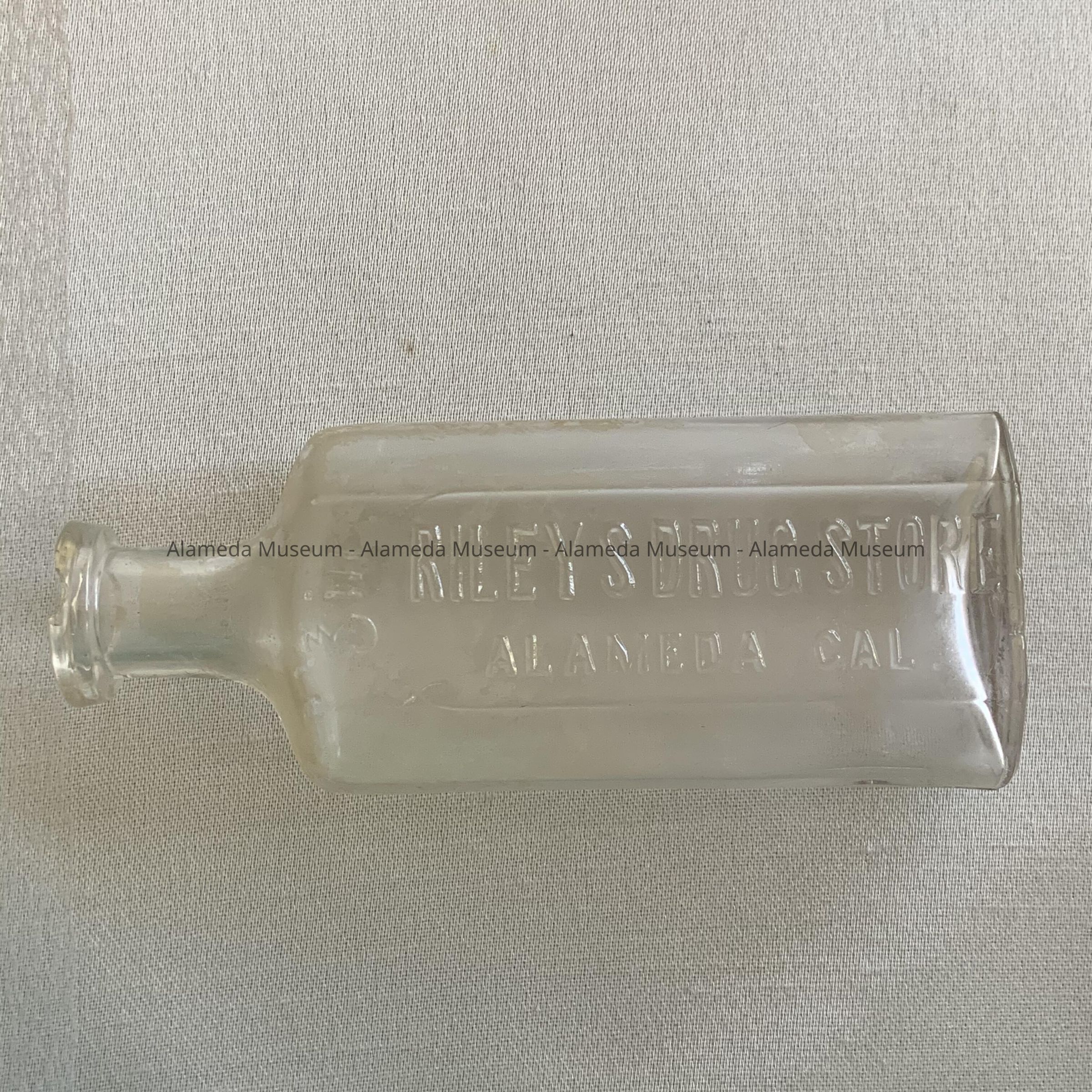 Description: Flat sided bottle with raised lettering "Riley's Drug Store, Alameda, Cal." The glass has a slight lavender tint. There is a protruding lip for a cork. On bottom is "W. T. Co."