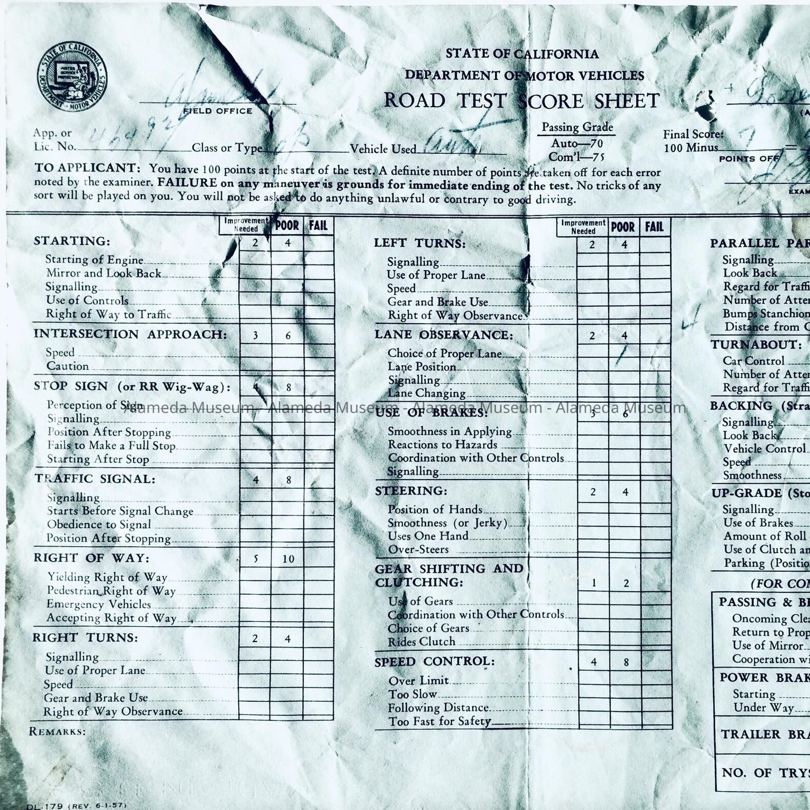 Road Test Score Sheet for Department of Motor Vehicles, 1958Entry/Object ID