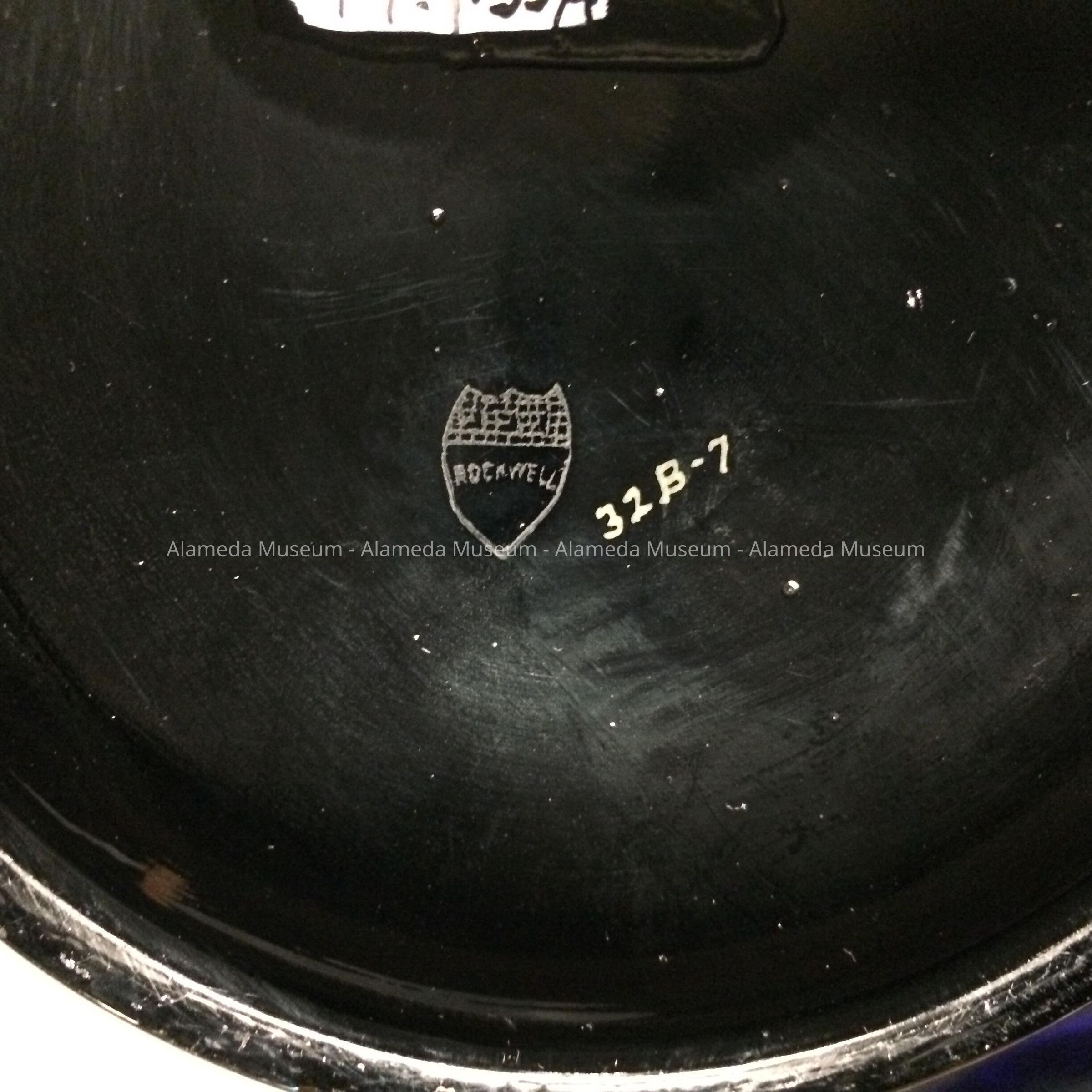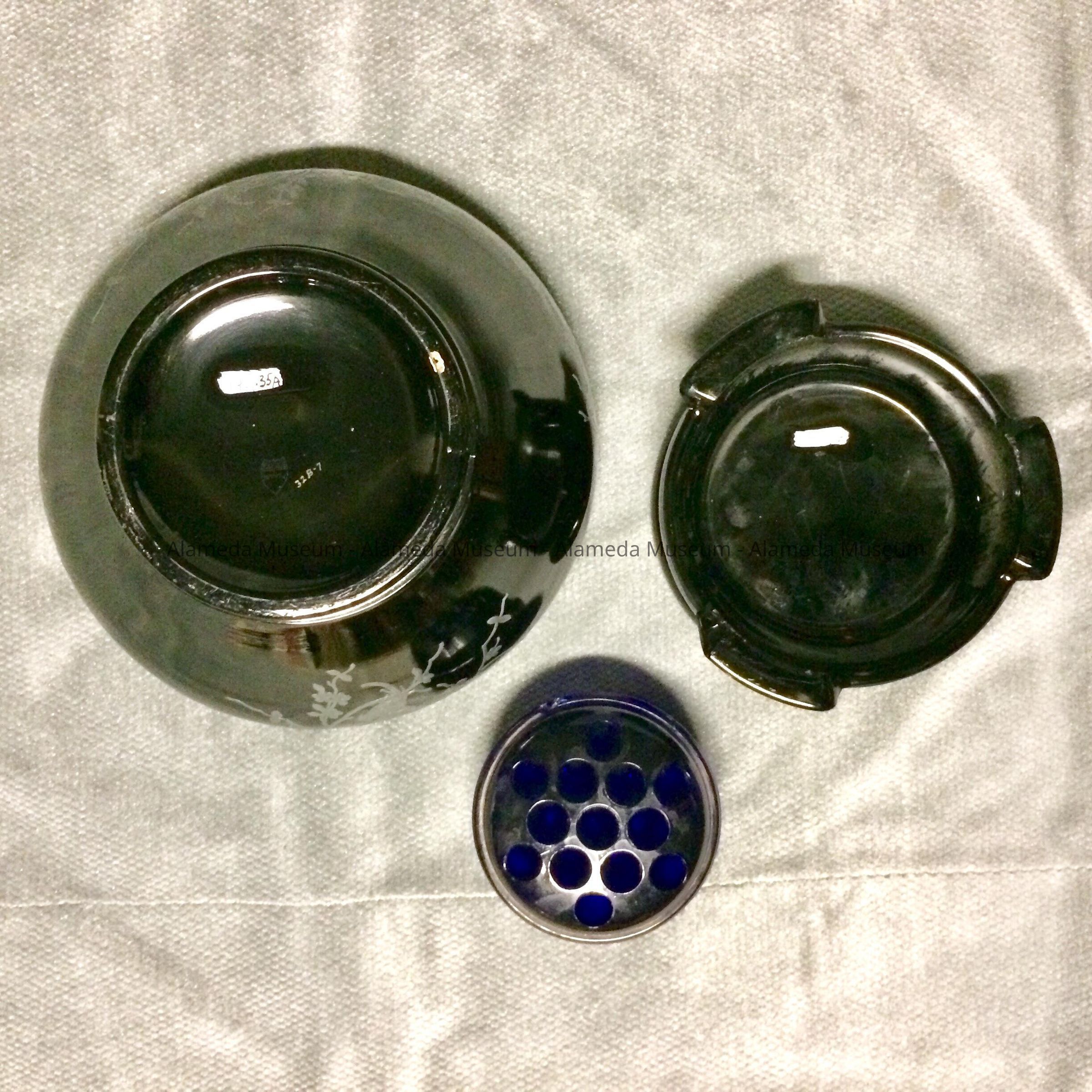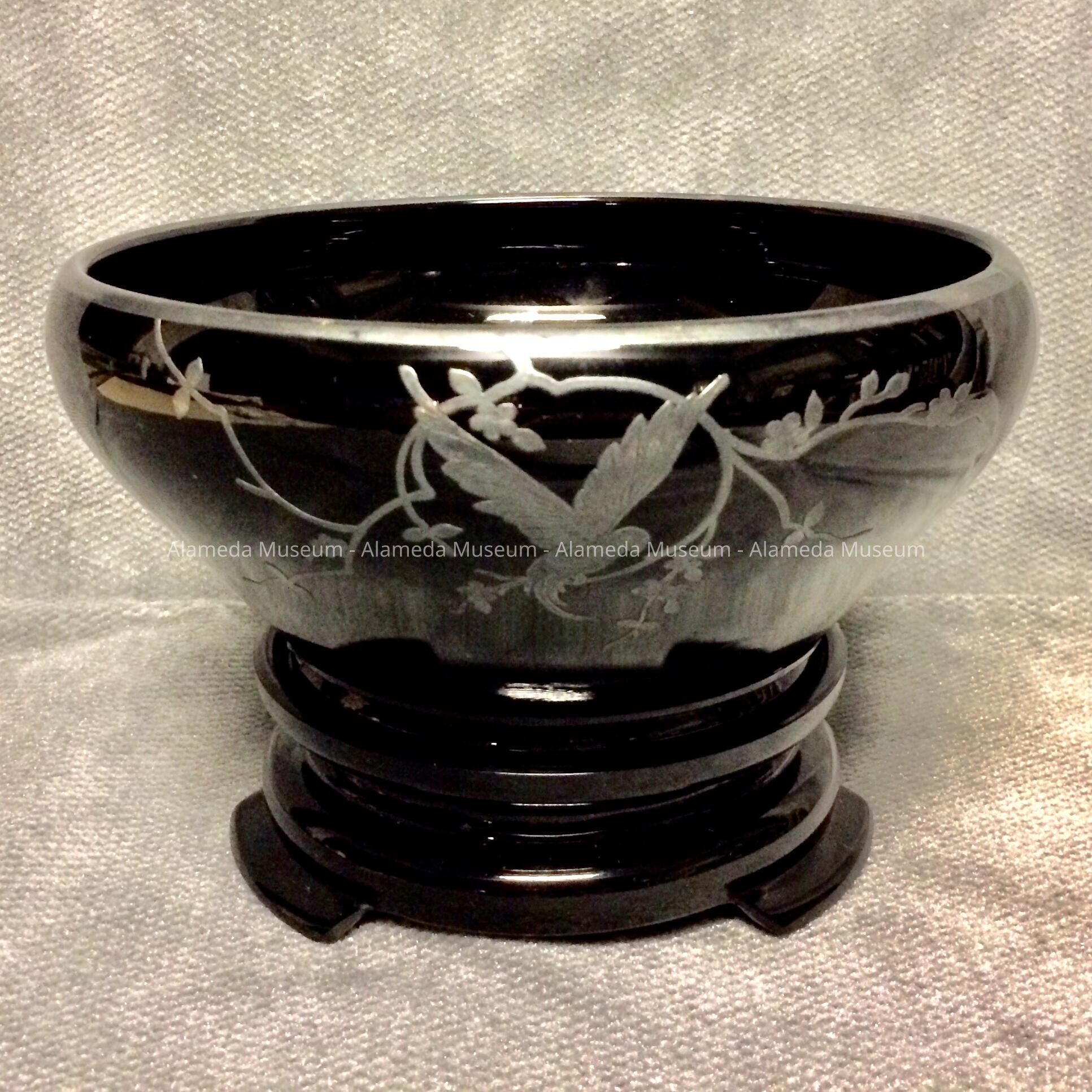 Description: A 3-piece console set of American silver overlay on black colored glass. On the bases of the items is stamped, "Rockwell glass". Set consists of (A) bowl; (B) stand; and (C) frog.