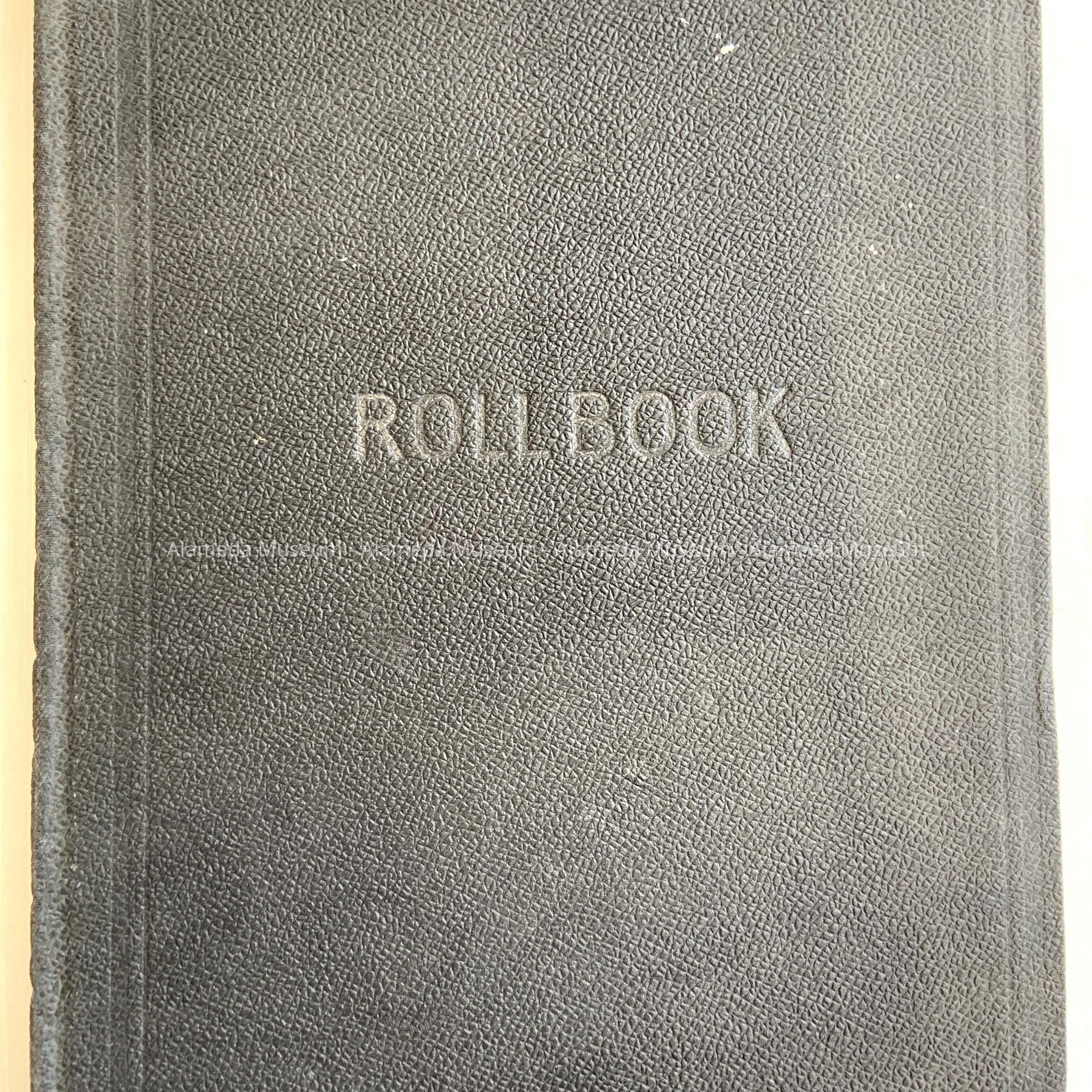 Hard-bound ledger book with entries handwritten in ink on ruled pages. Cover of blackcolored buckram imitation leather. Cover has incised caption, “Rollbook”.