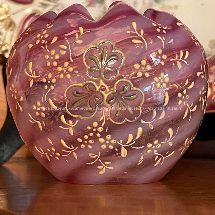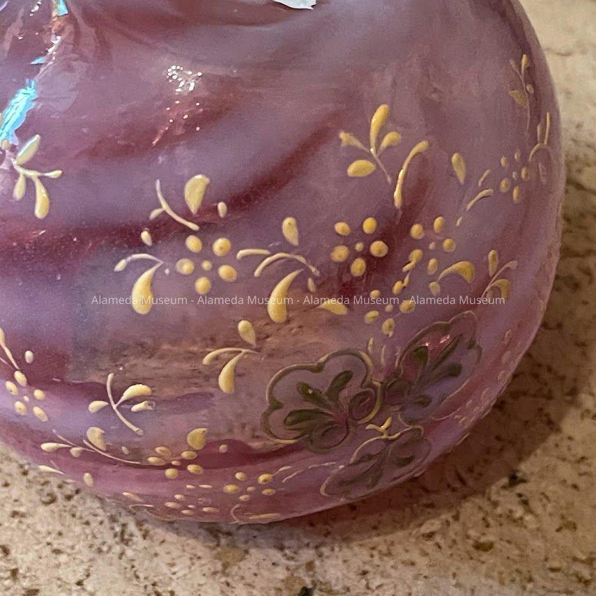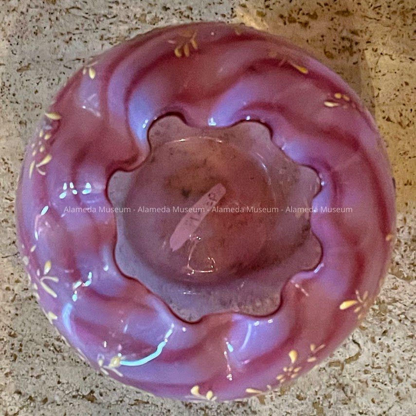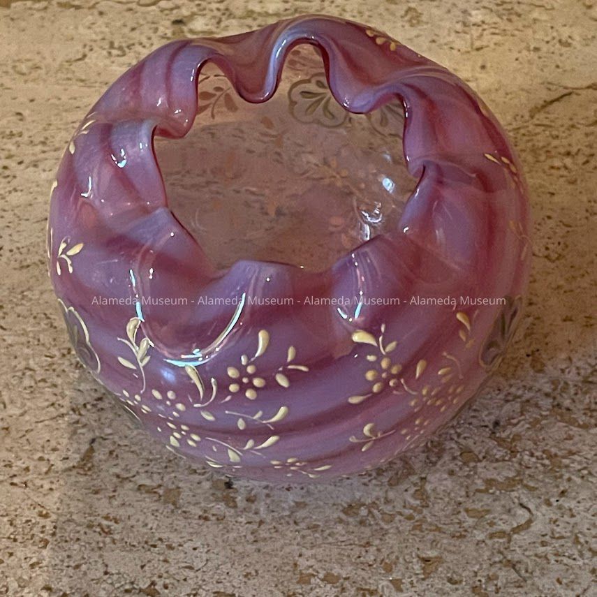 Pale cranberry with opalescent swirl pattern glass rose bowl with fluted opening and accentuated with enameled flower like pattern in green and yellow. Appears to be hand blown with ground pontil.