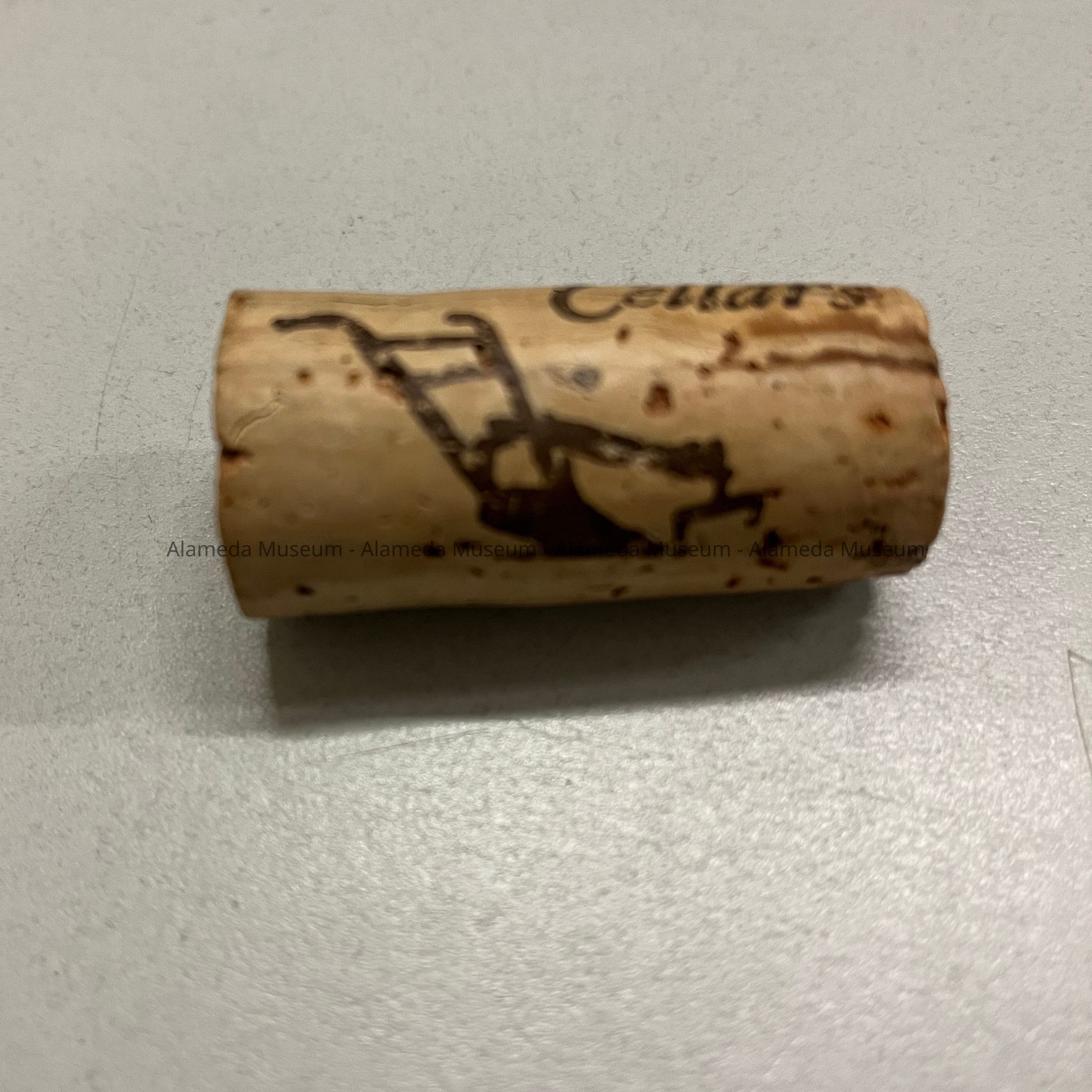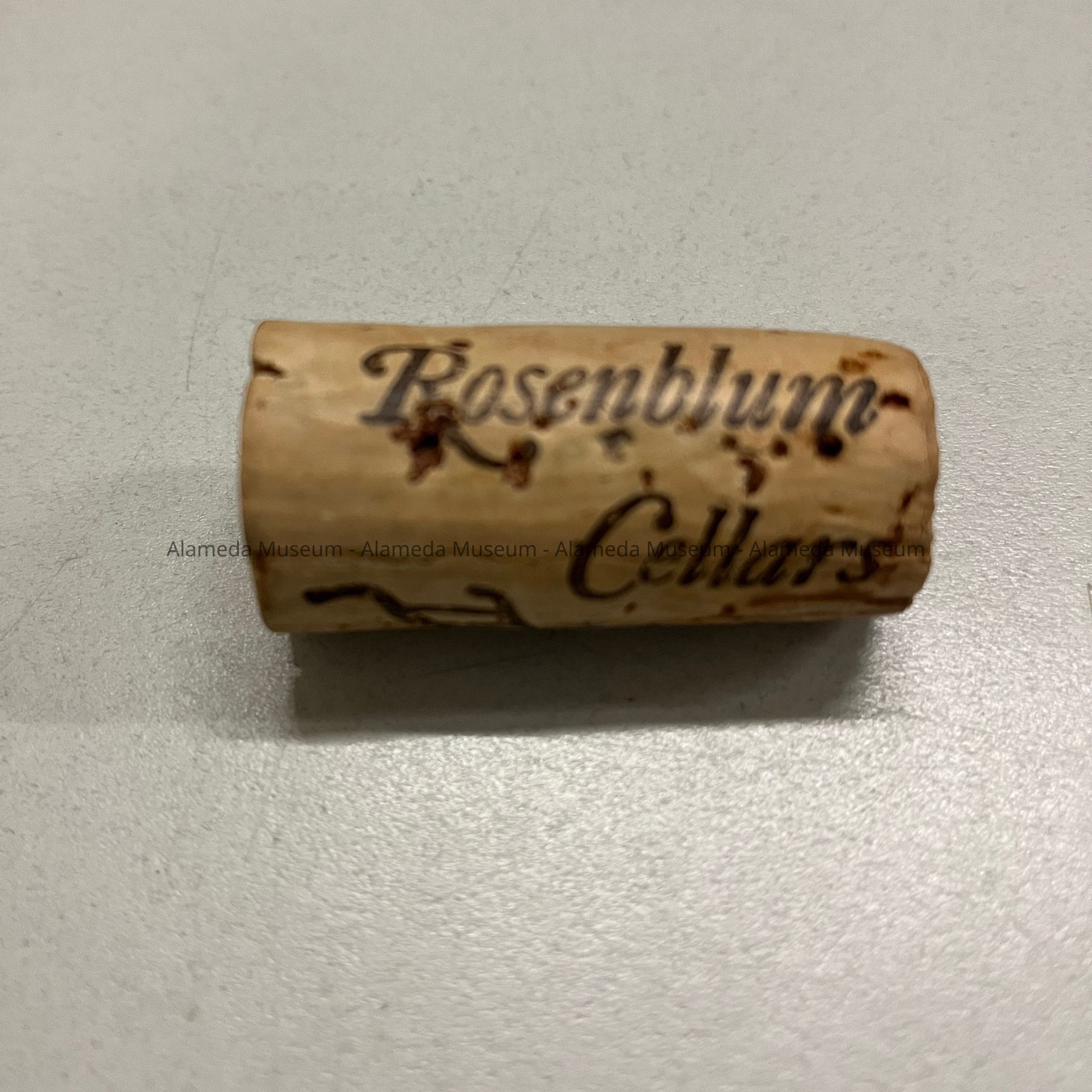 History of Object: a cork from a bottle of Rosenblum Cellars wine. Rosenblum Cellars was founded by Alameda resident Kent Rosenblum (1944-2018) who was a veterinarian with a wine-making hobby that got out of hand. In 1978 the Cellars went commercial, establishing the winery in an old warehouse of a shipyard on the estuary near former Naval Air Station, with the grapes coming from elsewhere. In 2008 Rosenblum and his wife Kathy sold Rosenblum winery, and he founded Rock Wall Winery with his daughter Shauna. Rock Wall winery closed during the Covid-19 pandemic in 2022 after 14 years at an iconic location on the base looking out to San Francisco, with food served by Encinal Market's Scolari's. Kent Rosenblum died in 2018 from complications from a surgery.