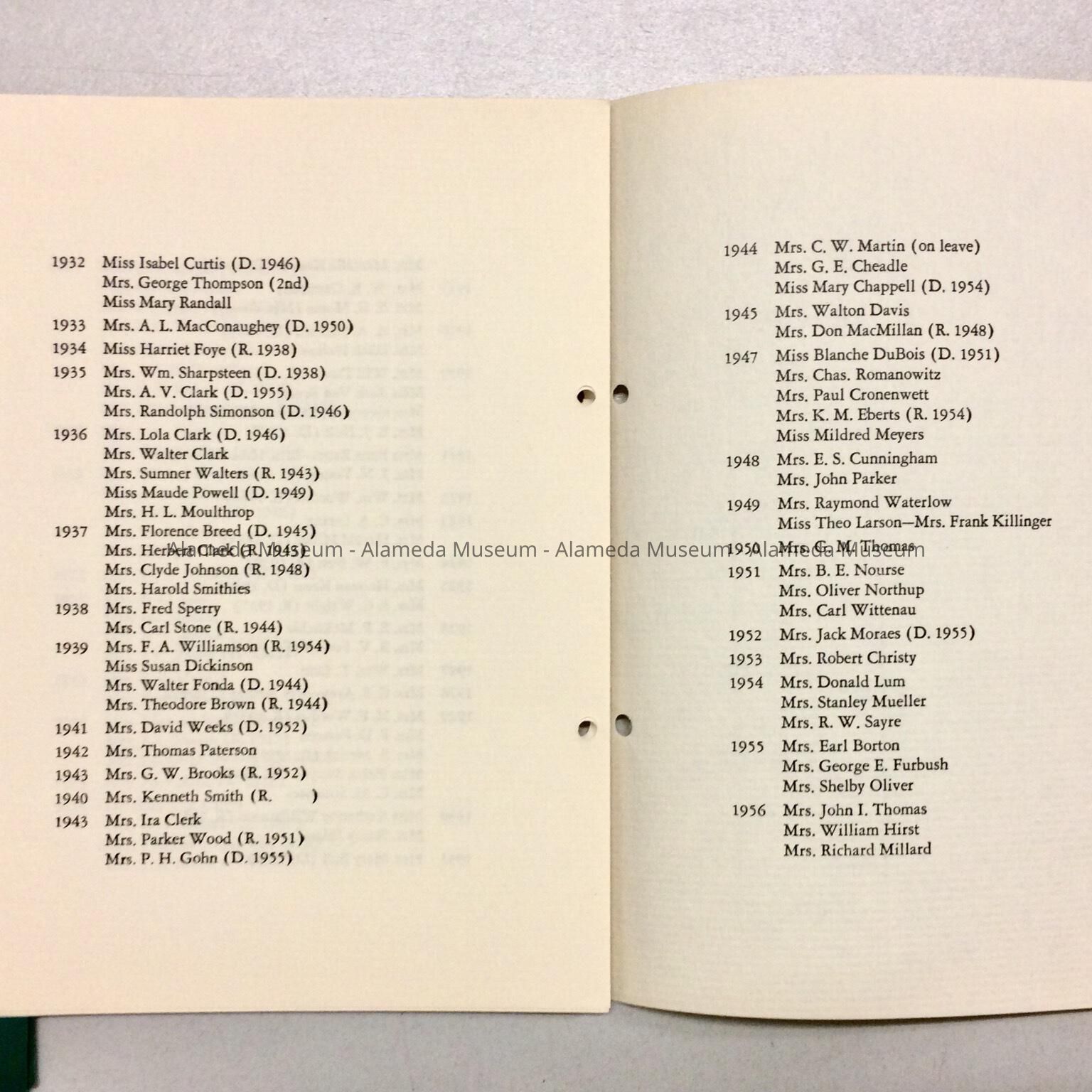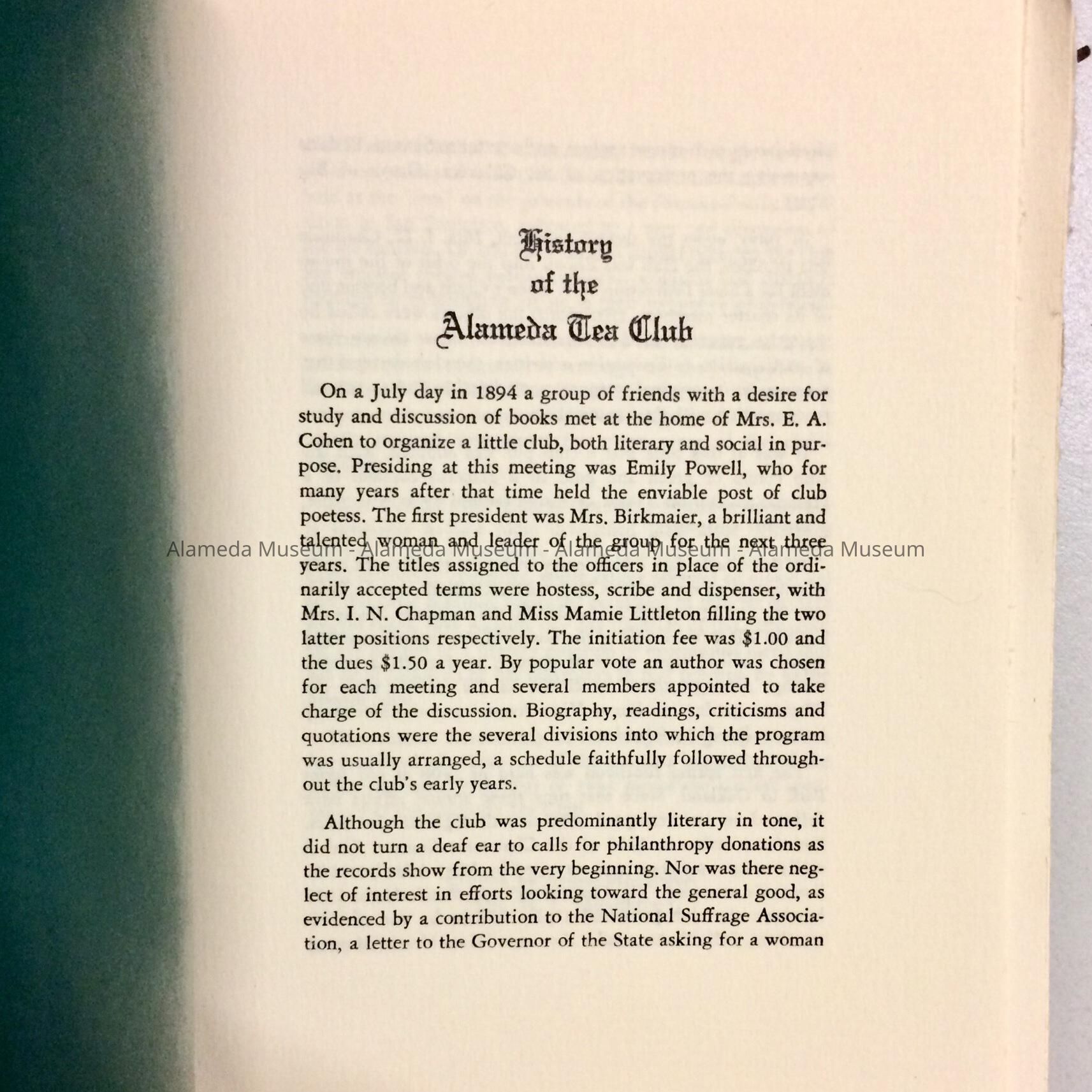 History of Object: Booklet containing a list of officers (past & present), membership (from club's inception), and history of the Tea Club, Alameda, founded 1894.