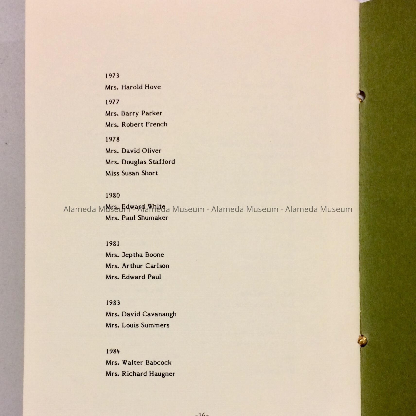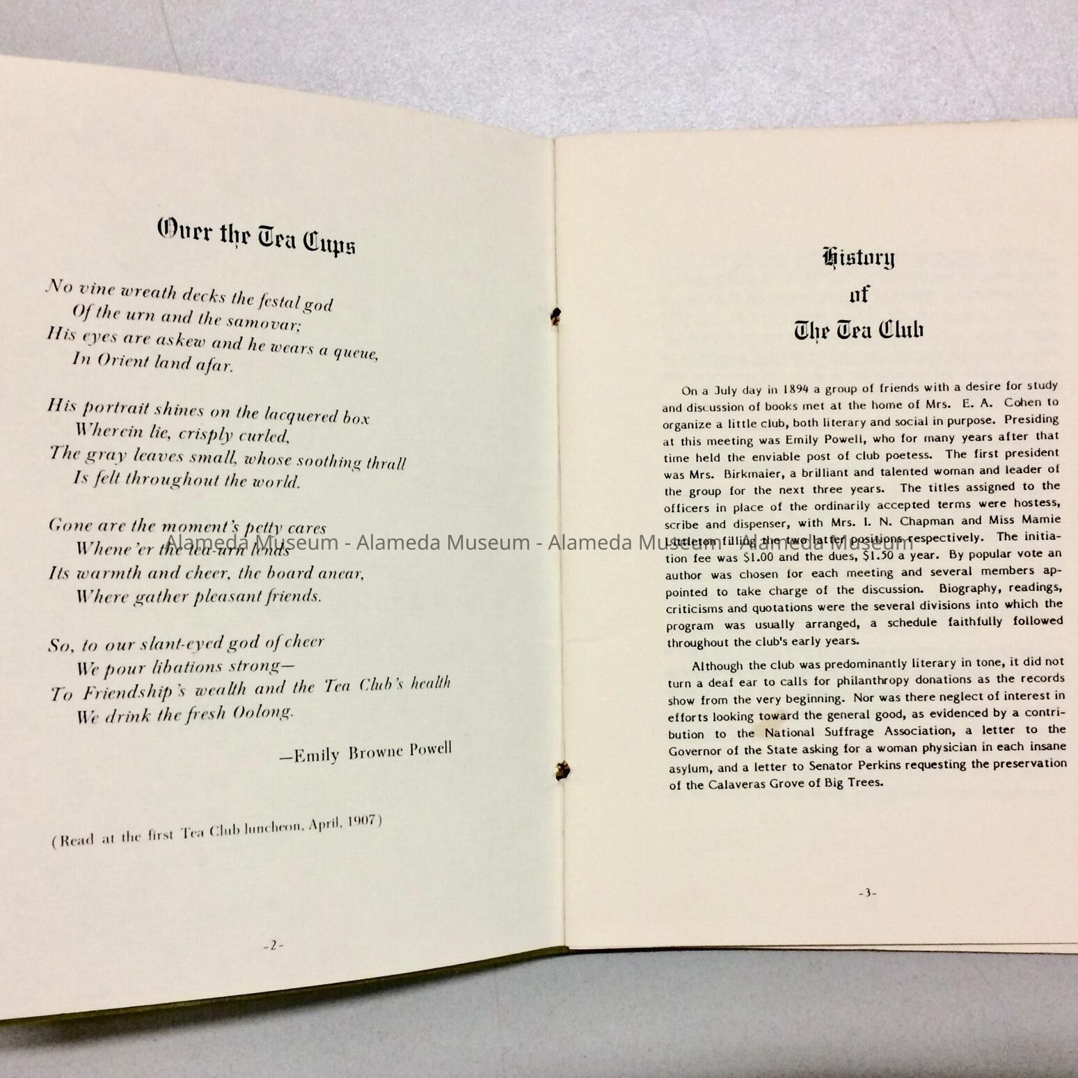 History of Object: Booklet containing a list of officers (past & present), membership (from the club's inception), history, and rules & regulations of the Tea Club (Alameda), founded 1894.