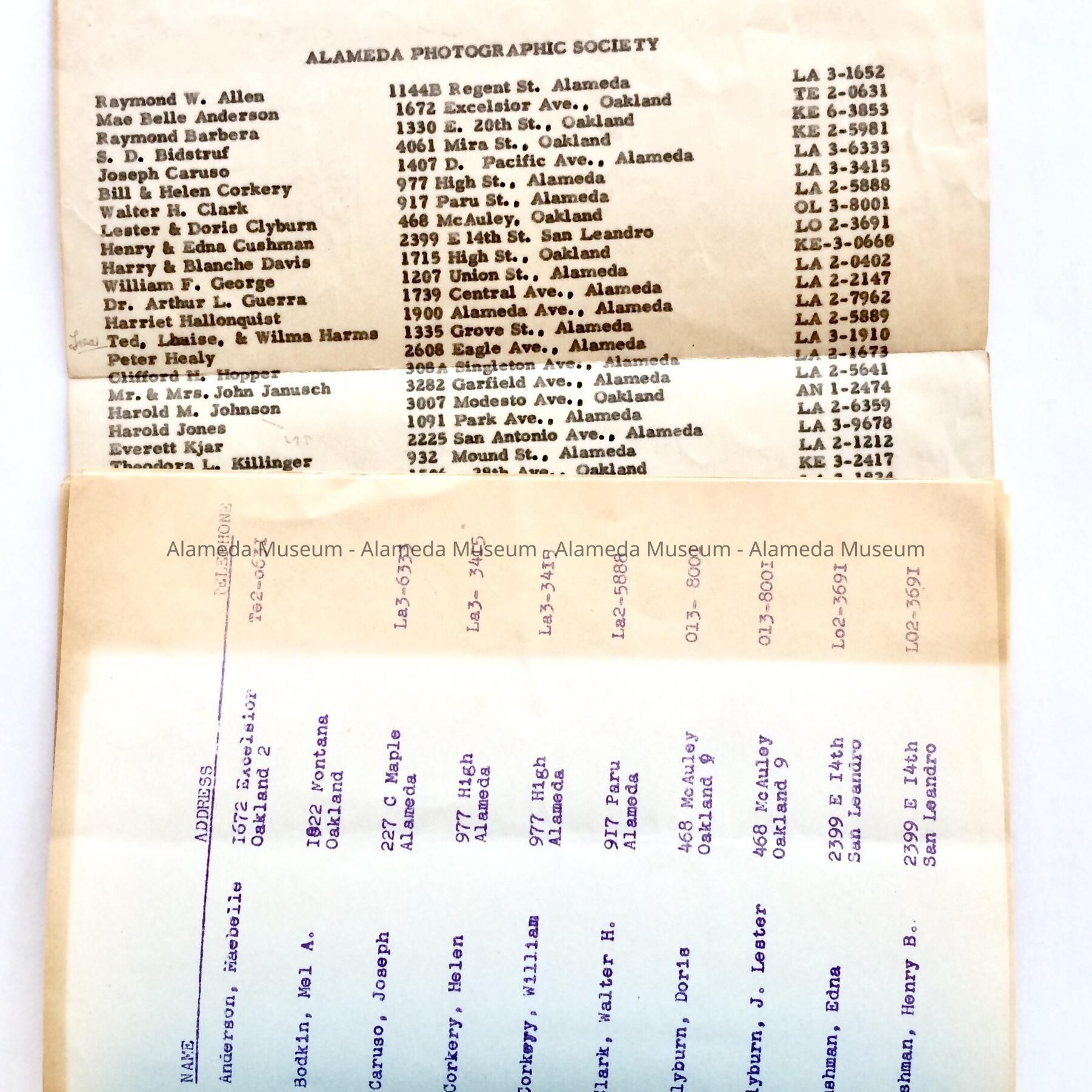 History: Roster of membership including names, addresses and telephone numbers of the Alameda Photographic Society.