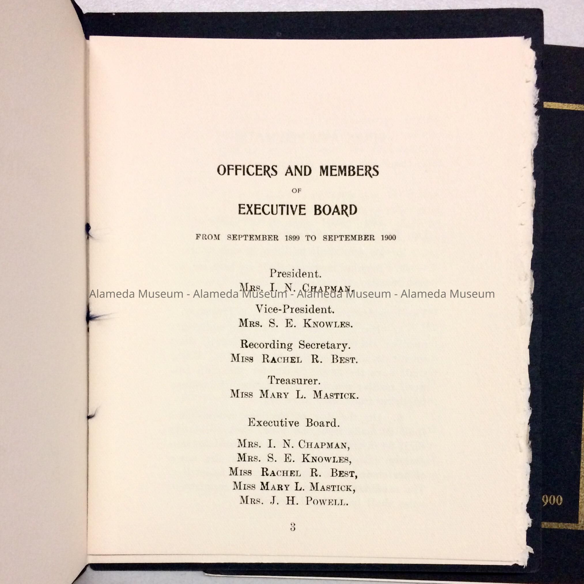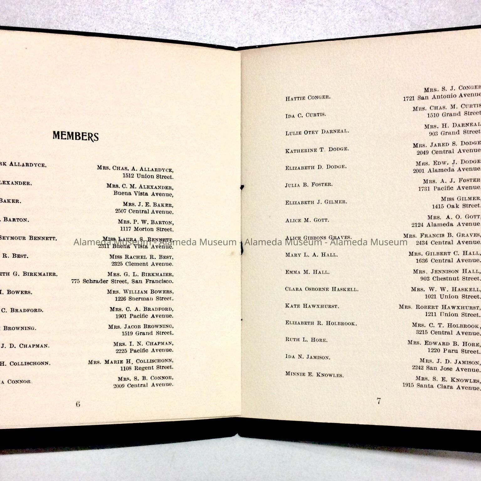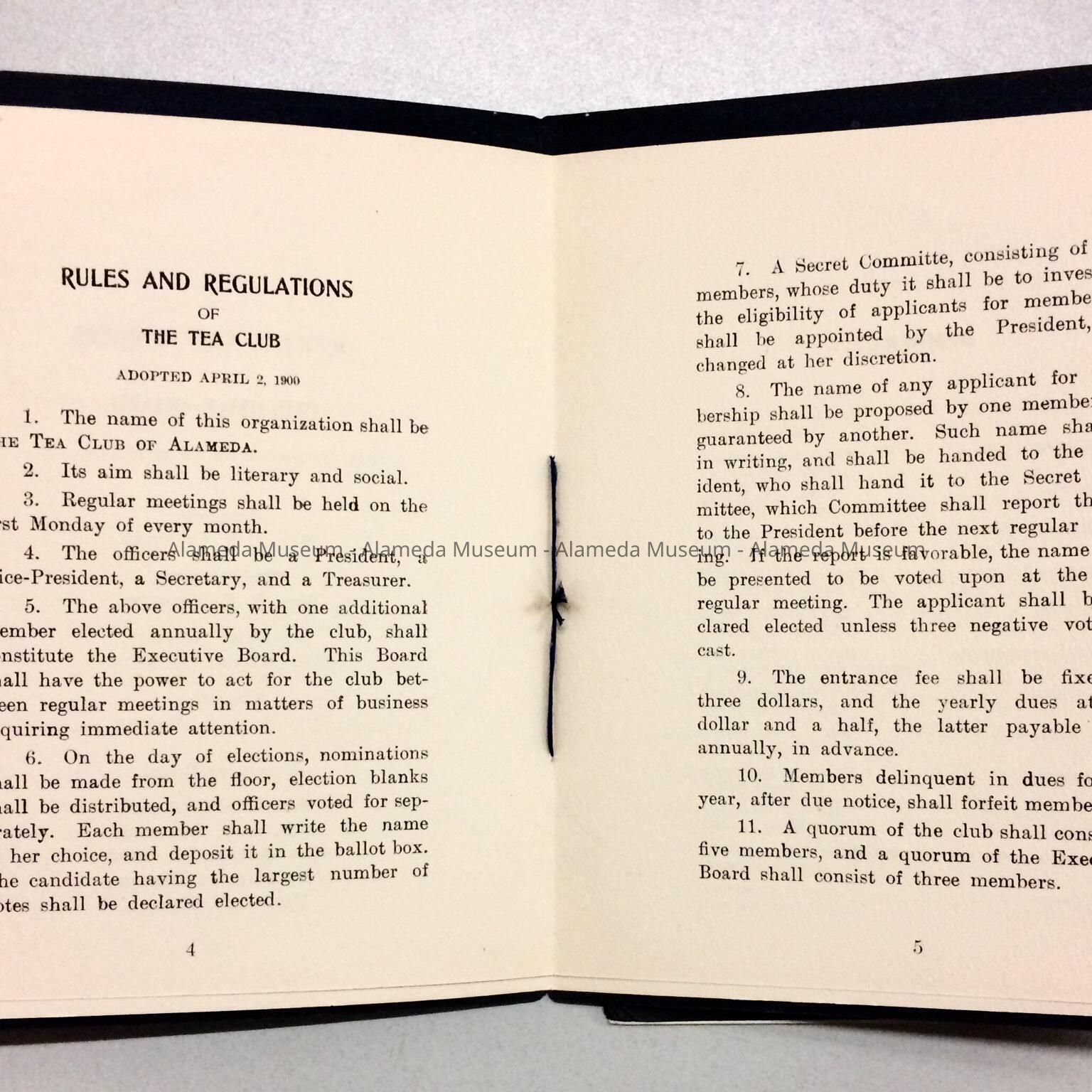 Booklet with list of officers & membership, including the rules & regulations, Alameda Tea Club (founded 1894). Booklet B. belonged to Mrs. Henry H. Meyers, wife of the noted Alameda architect.