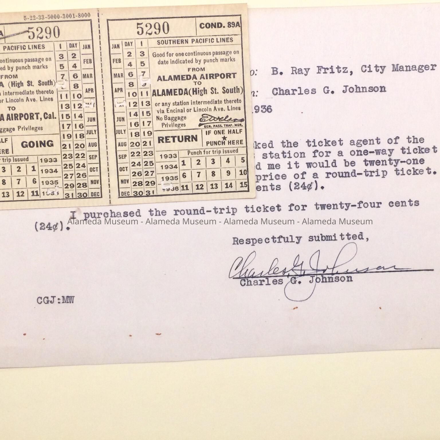 Description: Southern Pacific Lines return ticket from High Street South station to Alameda Airport, and a typed interoffice memorandum addressed to City Manager Fritz from Charles G. Johnson. Housed in an acid-free manila file folder (L 14 3/4” x W 9”).