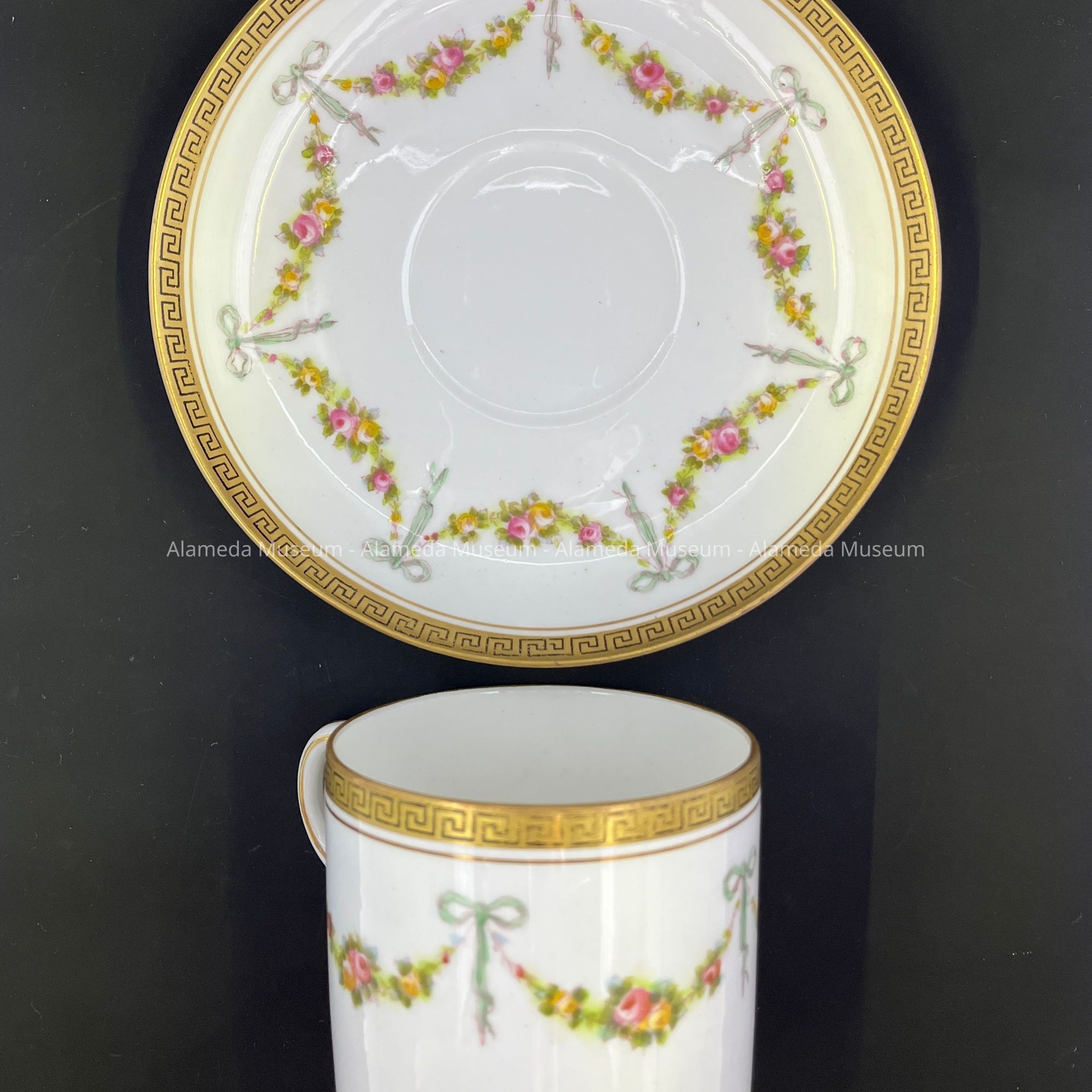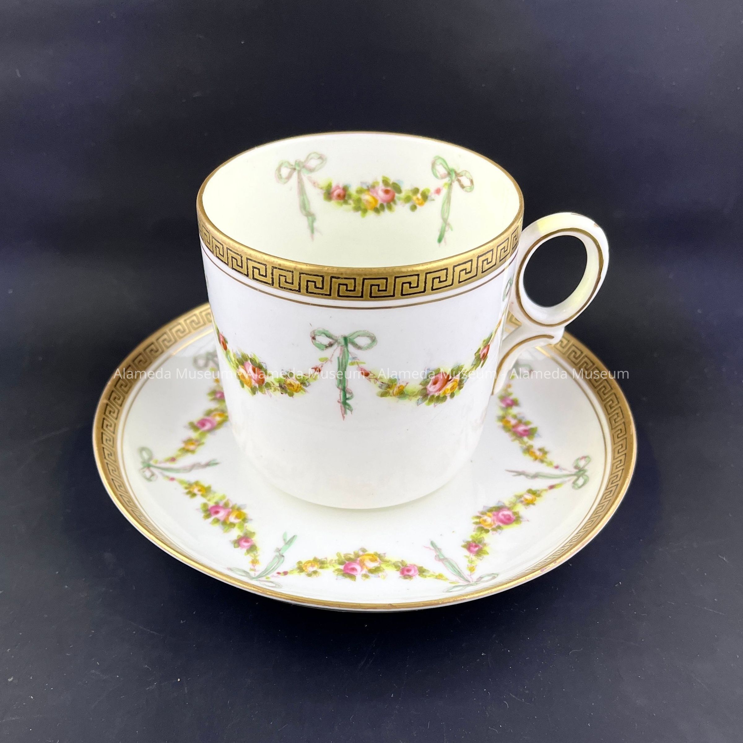 Description: Coffee sized cup and saucer in English Bone China signed on the reverse side "Royal Coleston, England". Pattern consists of transferred design, accentuated with hand painting of garlands of flowers tied with ribbons. Rim in gold with Greek Key design.