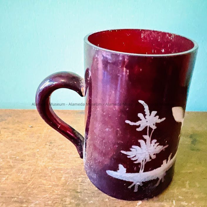 History of Object: Bohemian glass mug that belonged to the H. H. Meyers family, old-time residents of Alameda. It must be a family keepsake, as it predates 1894 (the year the family settled in Alameda).