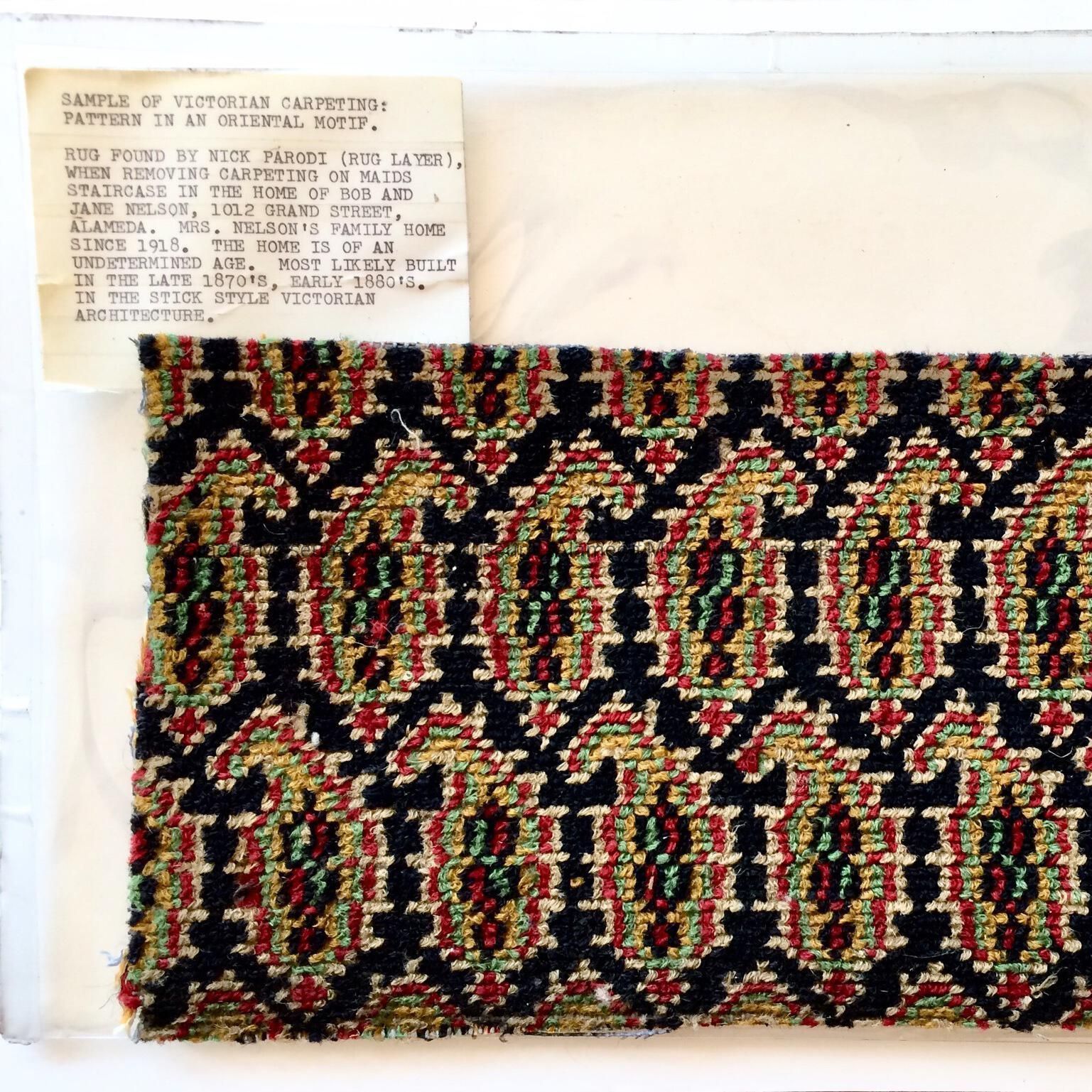 HISTORY OF OBJECT: RUG FOUND BY NICK PARODI (RUG LAYER), WHEN REMOVING CARPETING ON MAIDS STAIRCASE IN THE HOME OF BOB AND JANE NELSON, 1012 GRAND STREET, ALAMEDA, MRS. NELSON'S FAMILY HOME SINCE 1918. THE HOME IS OF AN UNDETERMINED AGE. MOST LIKELY BUILT IN THE LATE 1870'S, EARLY 1880'S. IN THE STICK STYLE VICTORIAN ARCHITECTURE.