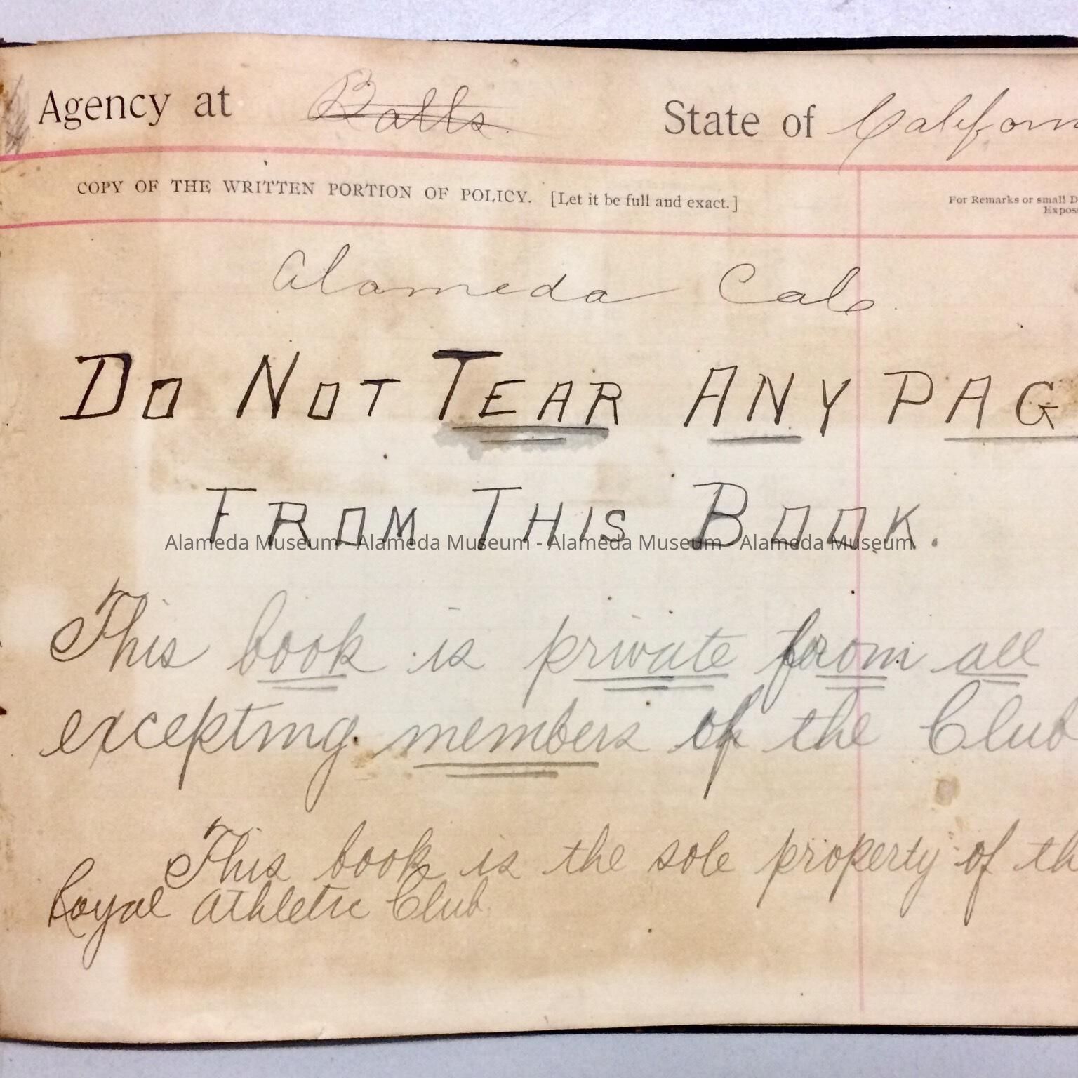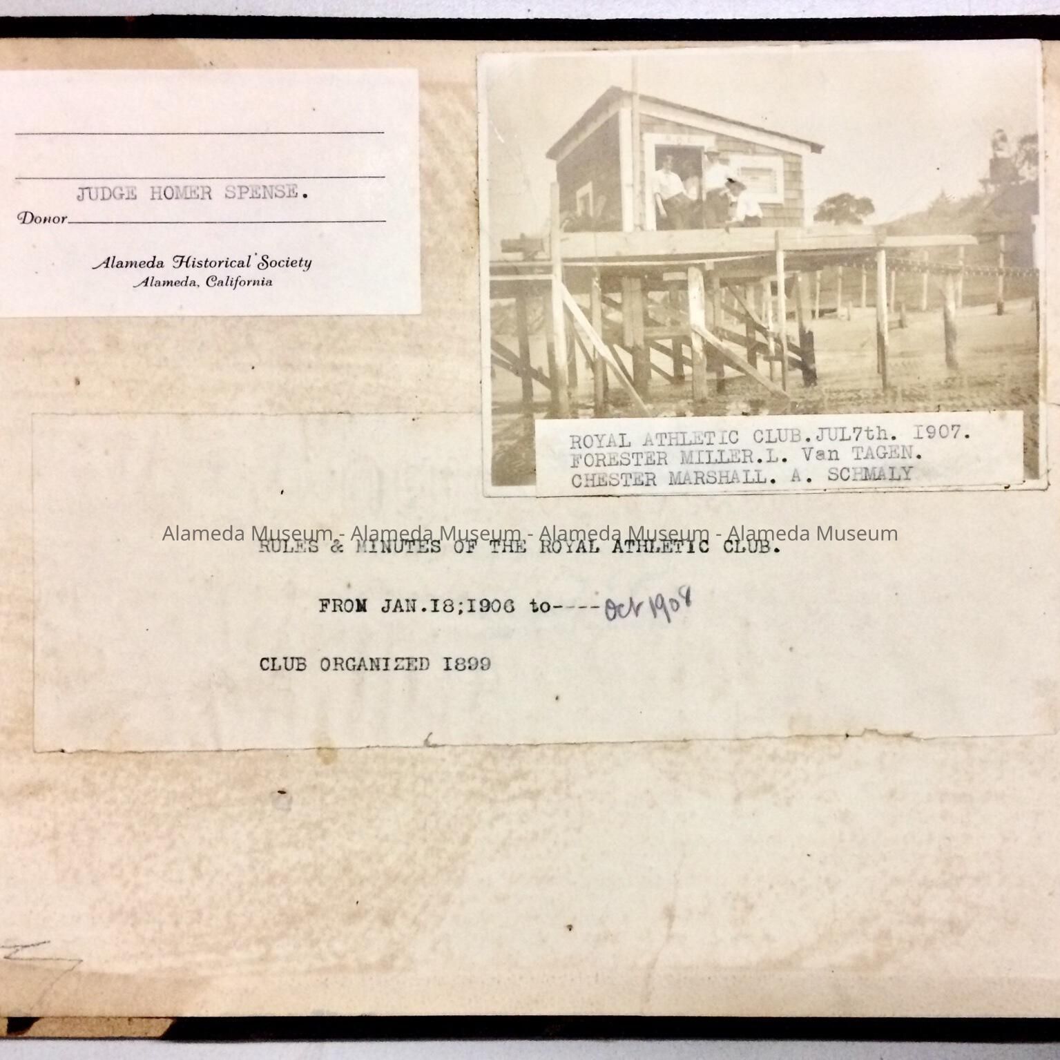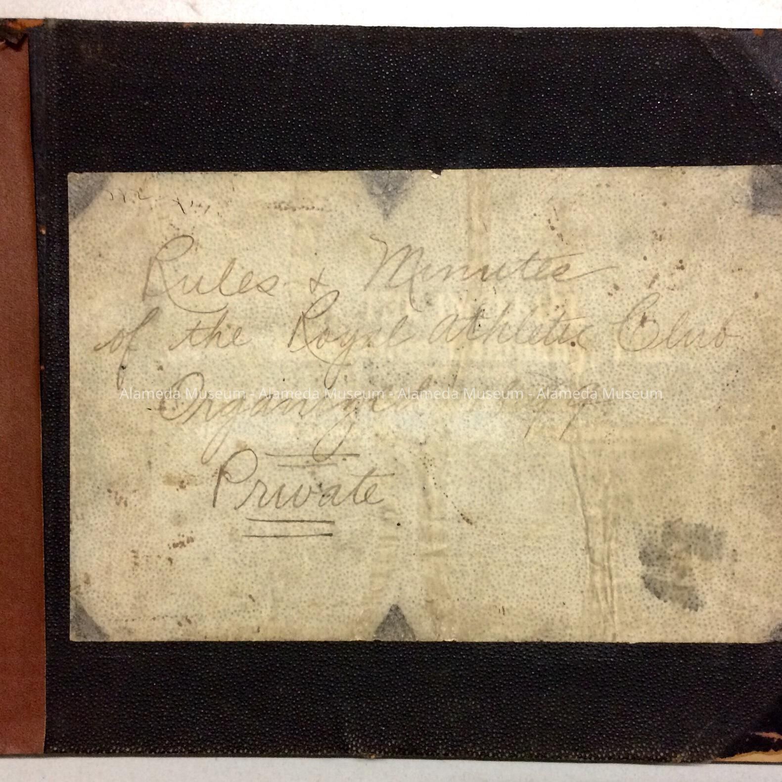 History of Object: Book containing rules and minutes of the Royal Athletic Club previously known as the Royal Swim Club. The organization was founded in 1899 and consisted of boys who lived in the vicinity of Weber Street where their club house was located. Object donated to the Alameda historical Society, numbered 242, prior to 1971 and never catalogued.