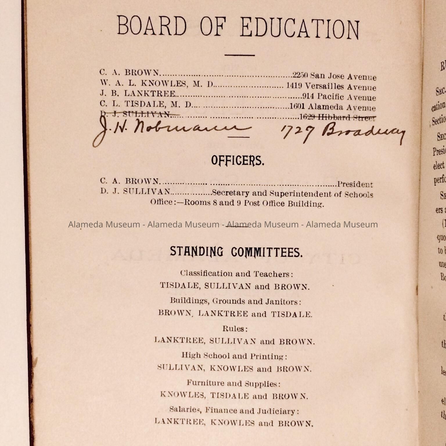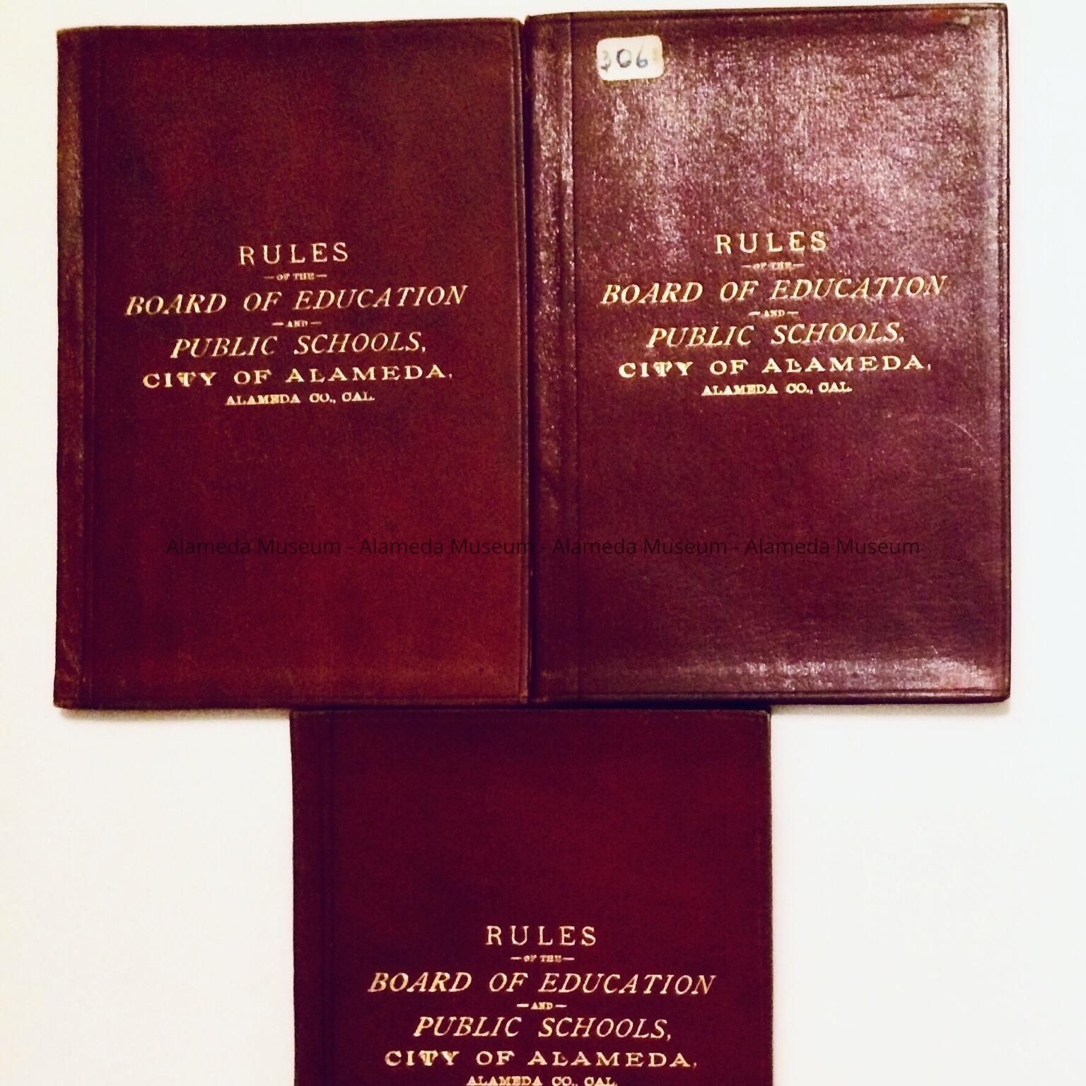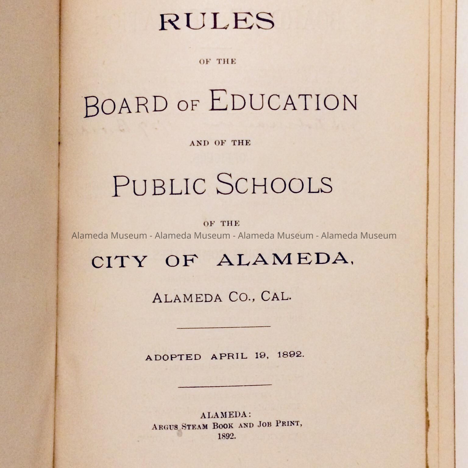 Booklet containing rules of the Board of Education and of the public schools of the City of Alameda, adopted April 19, 1892. Booklet also contains the names of the members of the Board of Education and their addresses. Given to the Alameda Historical Society prior to 1971 and never catalogued. (Copy B was given to Alameda Historical Society in 1951).
