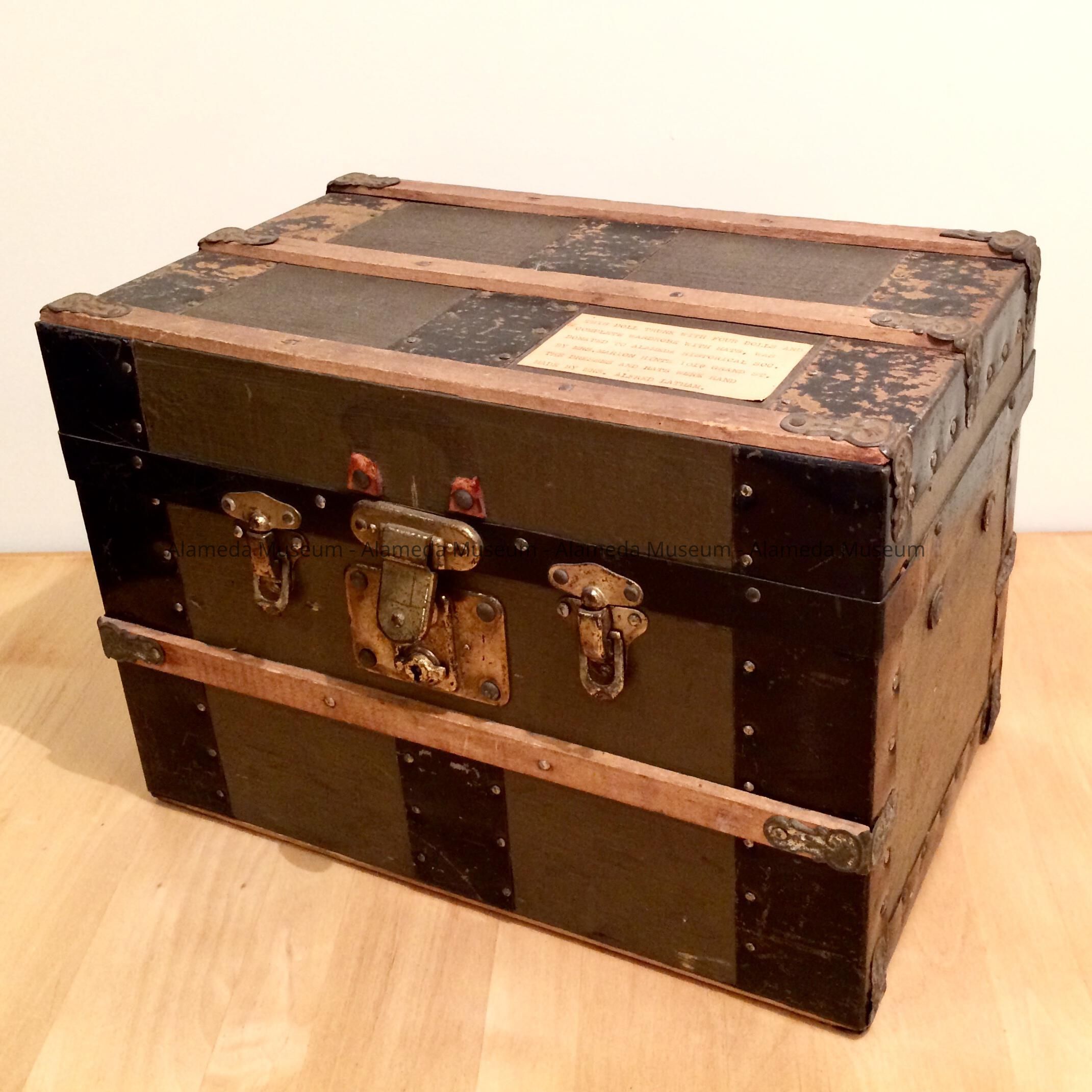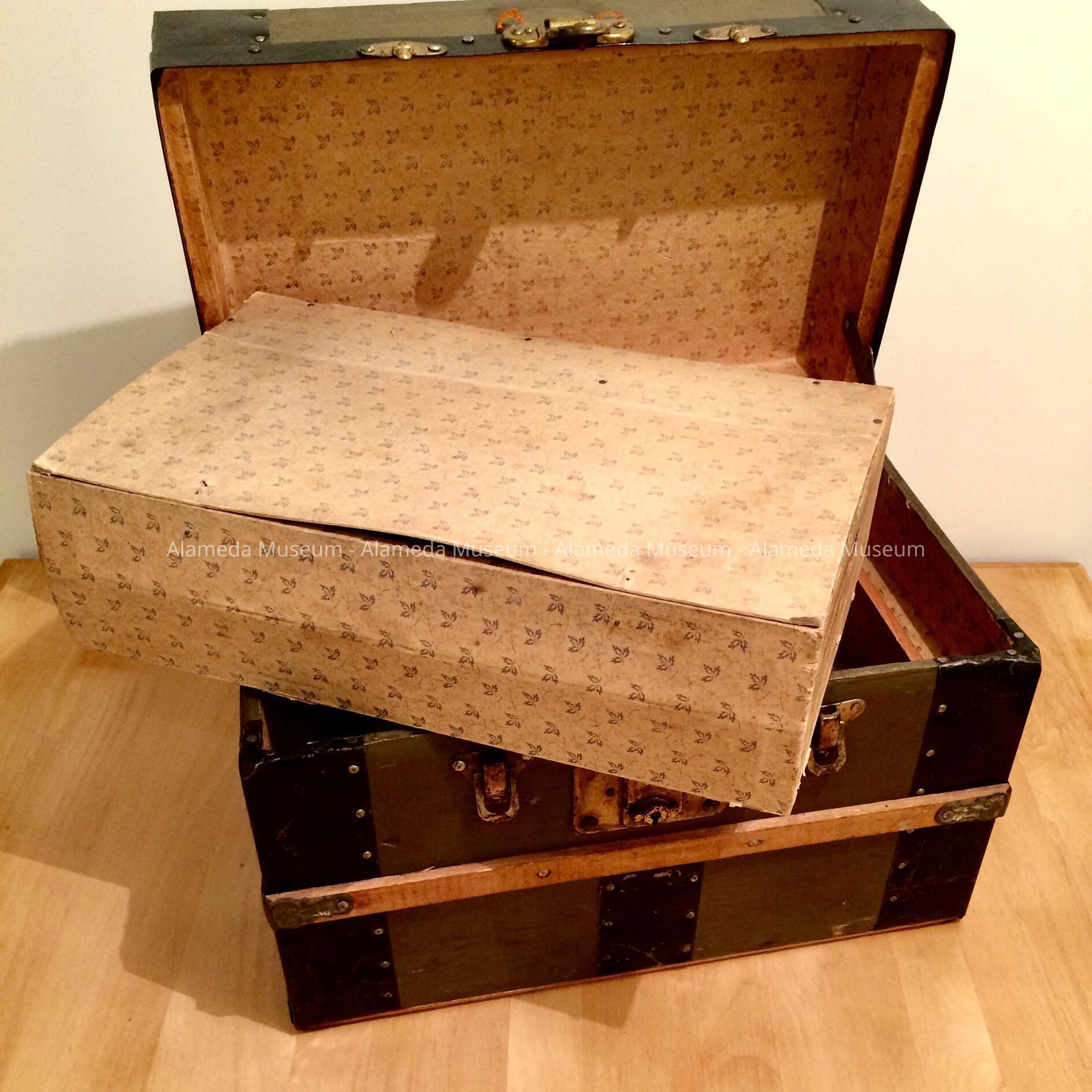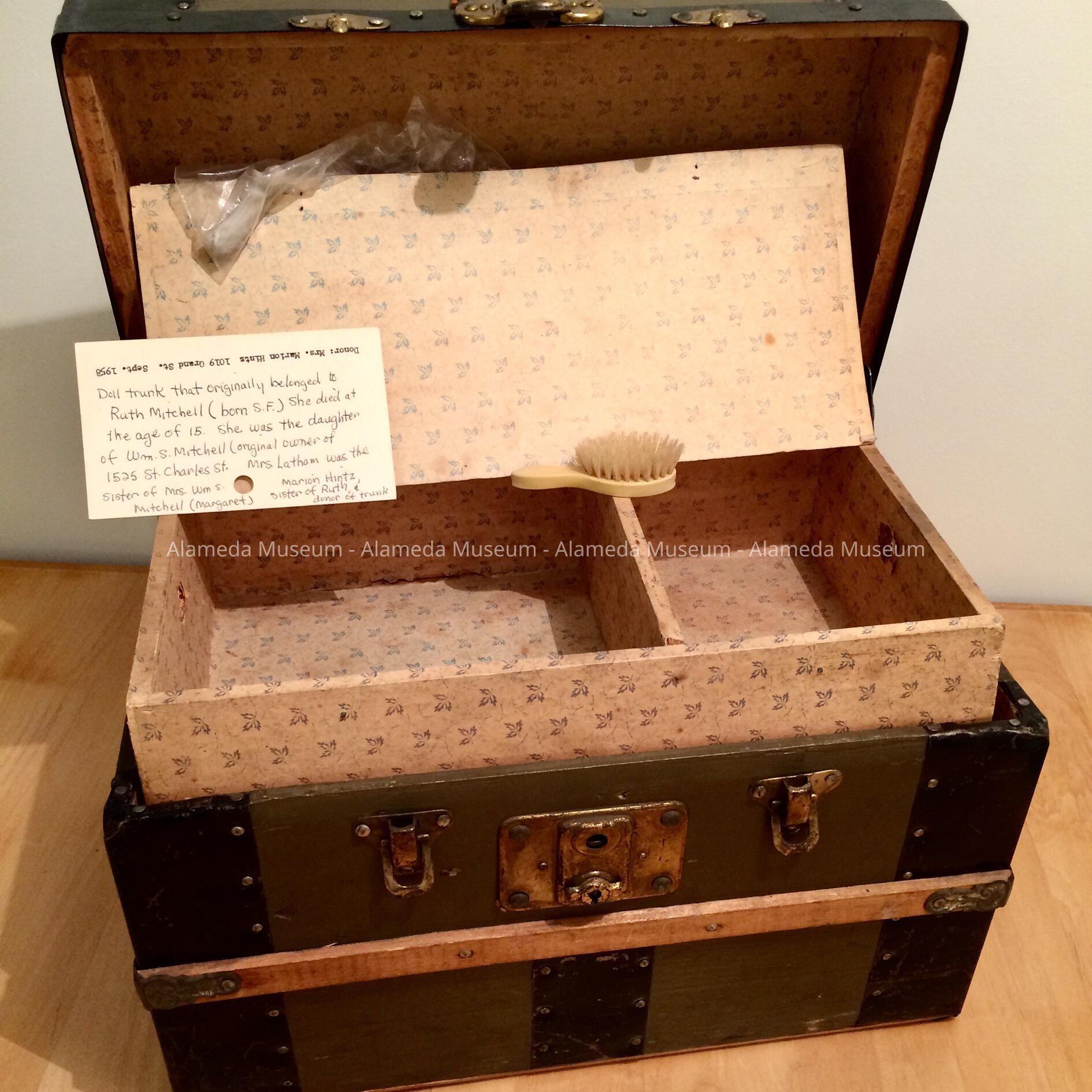 History of Object: Trunk with contents of Ruth Mitchell (1897-c. 1912), oldest daughter of Wm. S. Mitchell and Margaret Sloane Mitchell (nee Hislop, b. 1875). In 1905 the Mitchells moved from San Francisco to 1525 St. Charles St., after their young son, Robert, was brutally murdered in his bed, with a hatchet, in 1901. The clothing in the trunk was - for the most part - made by Ruth's aunt Gertrude E. Latham (nee Hislop, b. 1874), wife of San Francisco printer and publisher and 1925 Alameda council member, Alfred Latham (1871-1935), who had moved into 1131 Bay Street by 1920. After his death, in 1936, Gertrude ran a cigar business out of the Alameda Hotel. After Ruth's death at 15, her toys, including the trunk with clothes, as well as four dolls and a doll tea set, were lovingly packed away. Ruth's sister Marion (b. c. 1907), married Alameda resident and engraver, Adolph Hintz, around 1933, and they lived at 1019 Grand Avenue, the house her parents were living in by 1920. The Hintzes moved away in 1985.