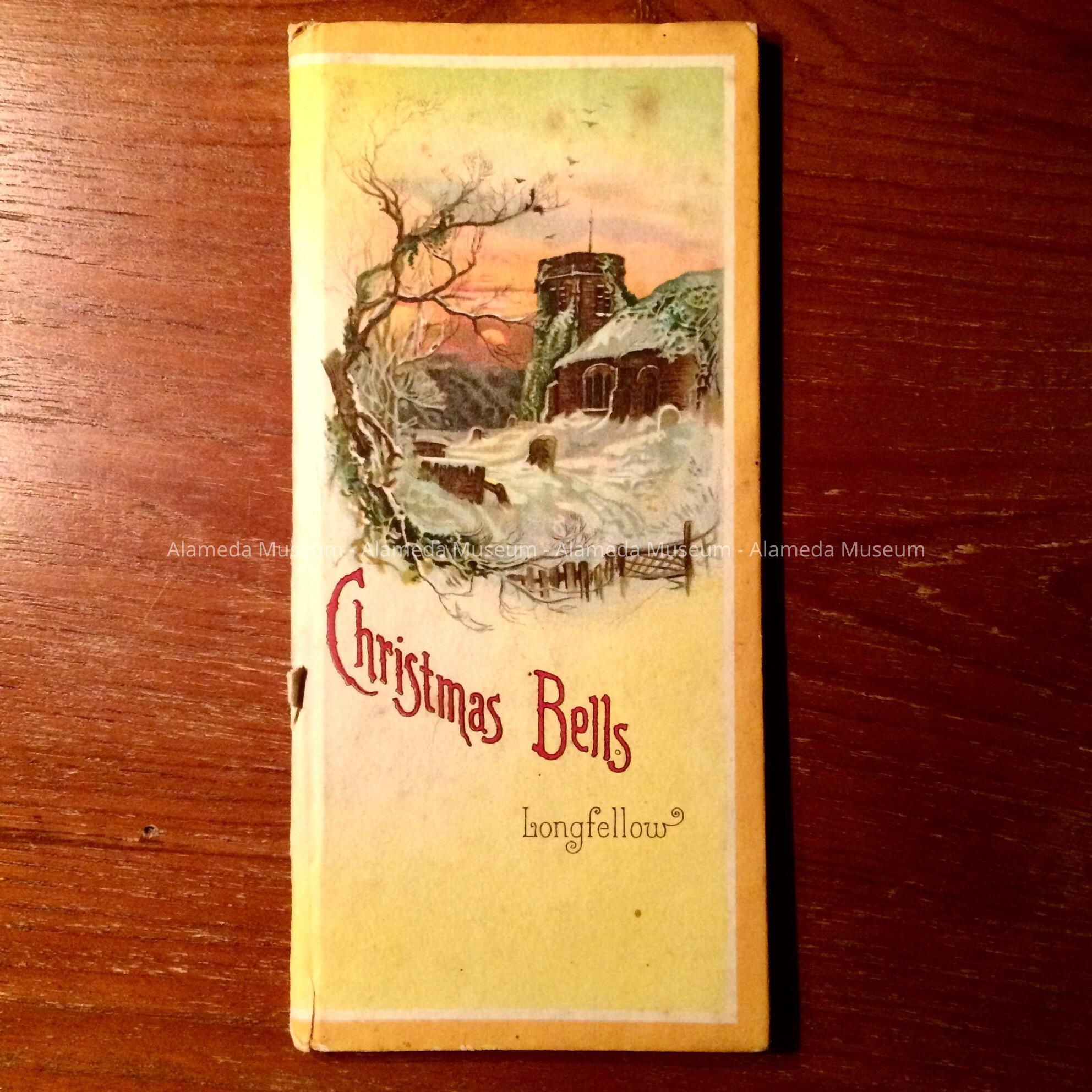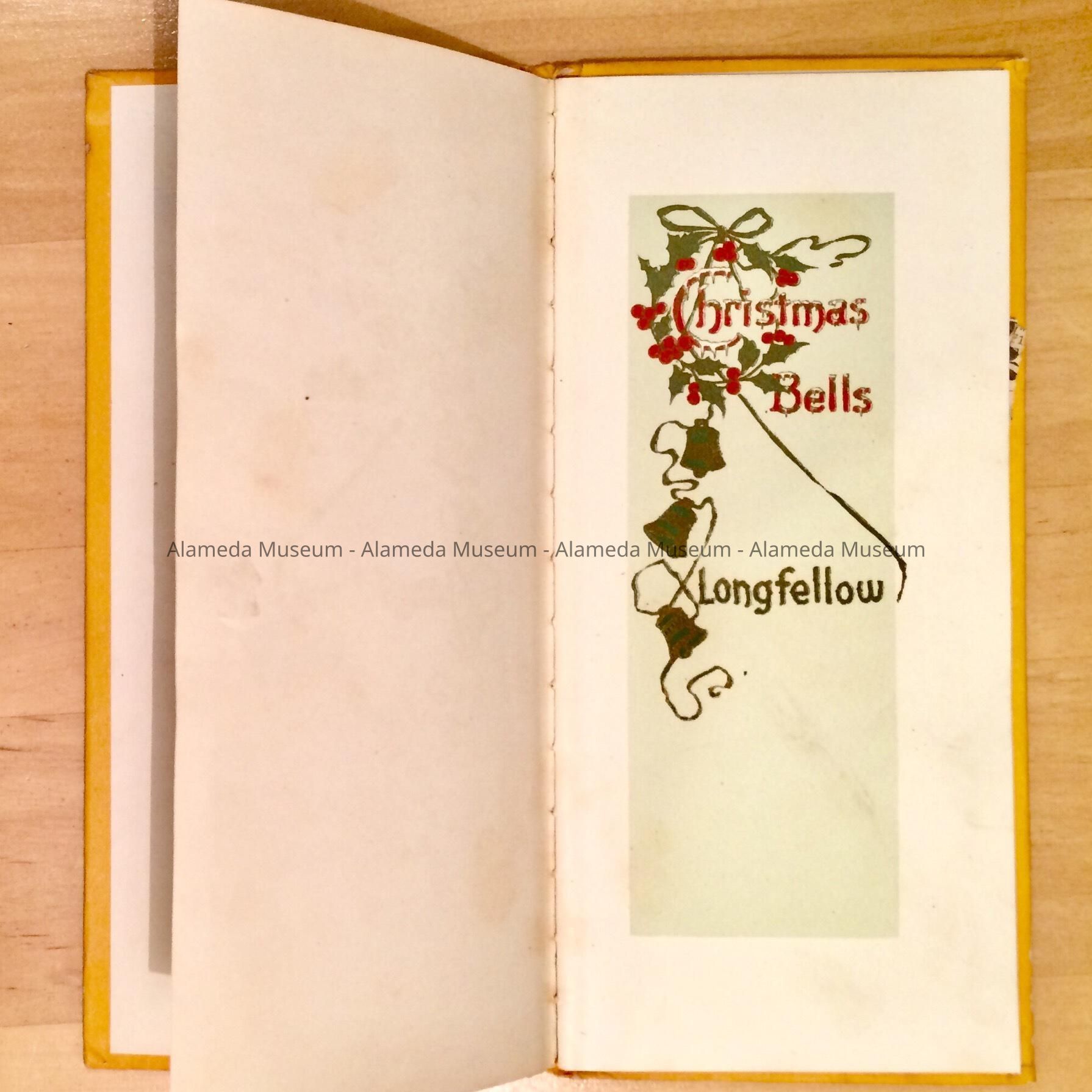 Description: A wooden trunk, painted a dark gray, reinforced with black metal riveted in place, and decorative metal on corner, hinges and lock, with divided cardboard box inset. Remnants of bailing handles are affixed to the sides. A paper label with 'No. 21' is affixed to the bottom. The trunk contains small size doll clothing, including underwear, hats, dresses, a fur coat and stole, a celluloid comb, and celluloid brush with mirror on the reverse. Also included is a booklet, titled 'Christmas Bells', 'Longfellow', which in turn has a clipping, of a restaurant, E.D. Judd & Co., 1424 Park Street.