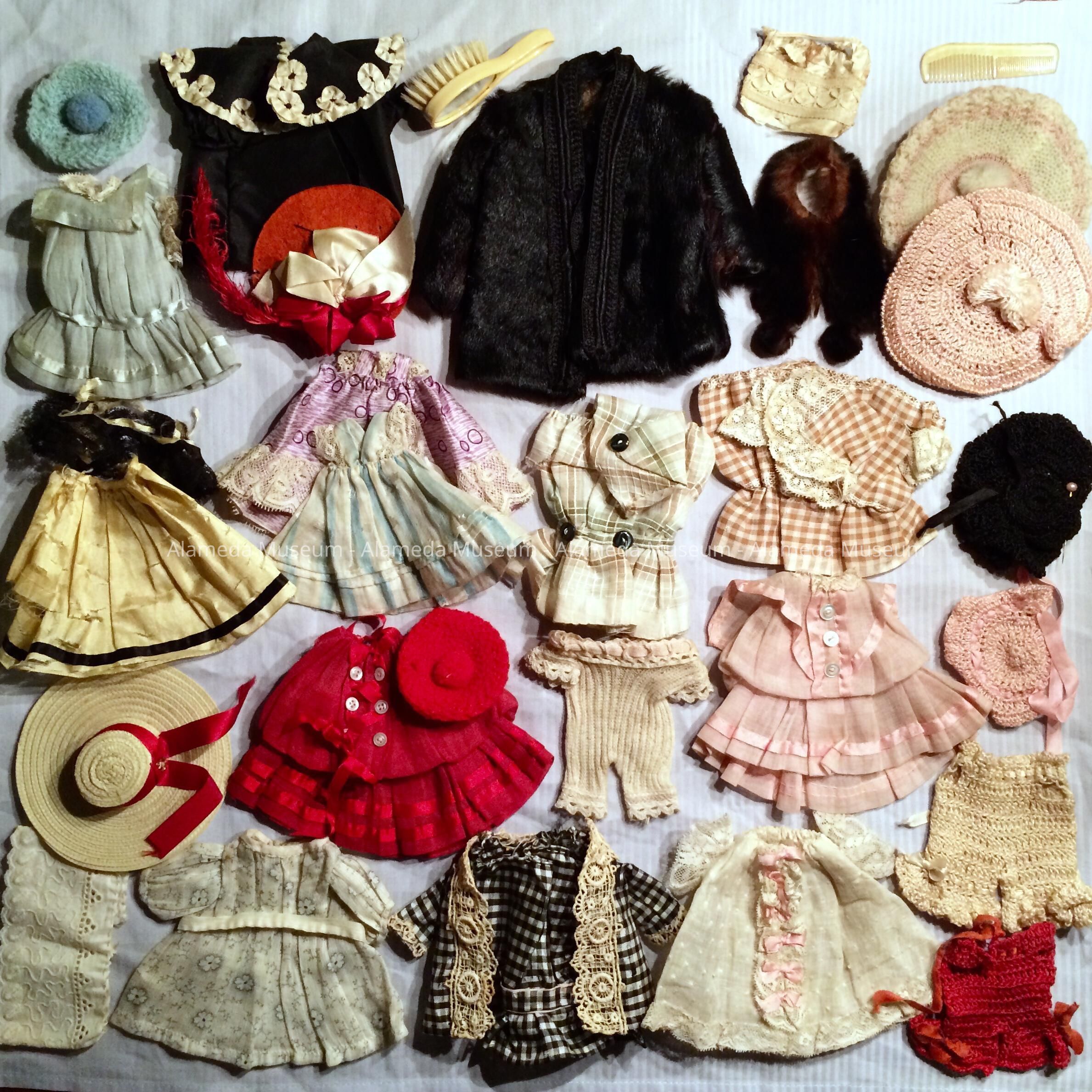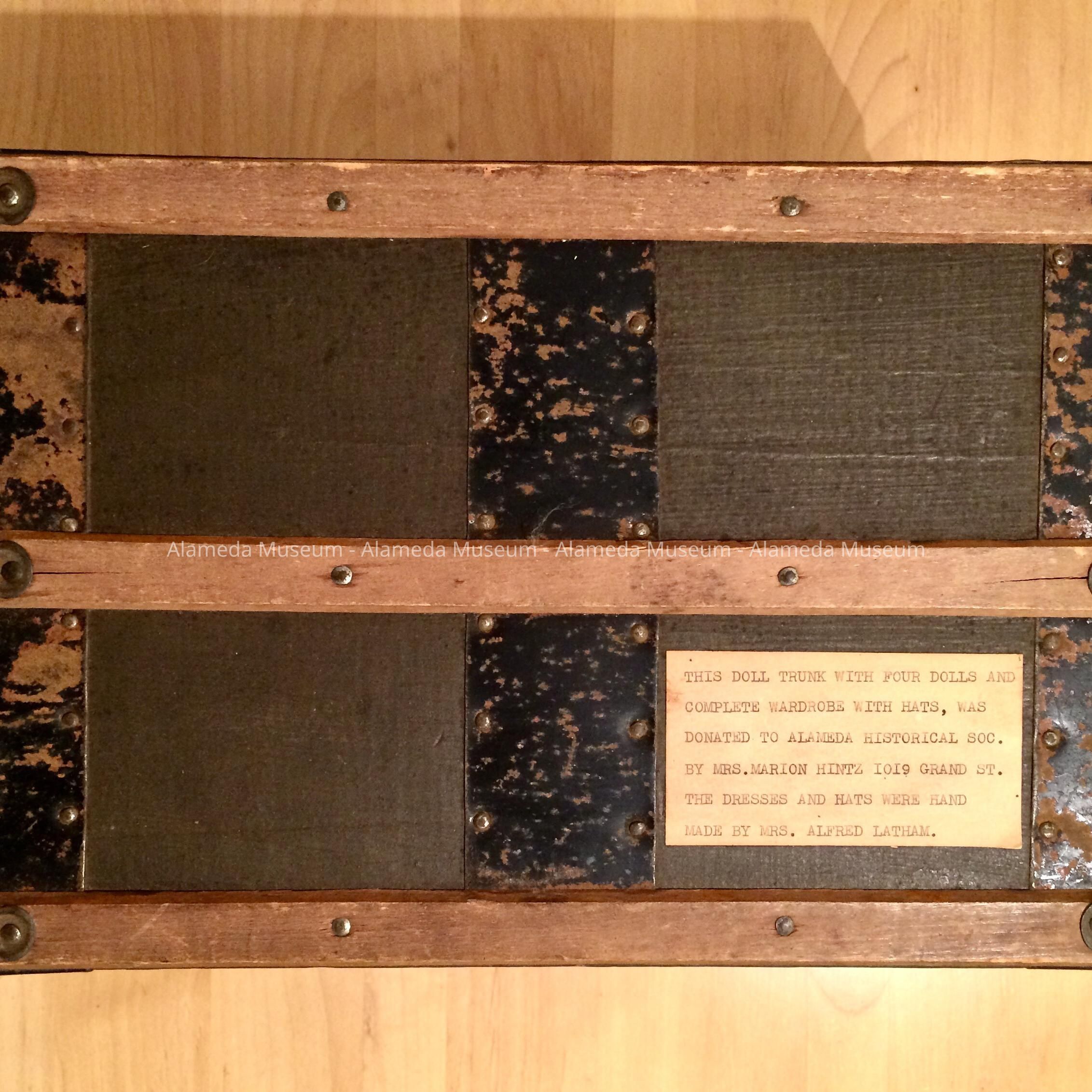 "THIS DOLL TRUNK WITH FOUR DOLLS AND COMPLETE WARDROBE WITH HATS, WAS DONATED TO ALAMEDA HISTORICAL SOC. BY MRS. MARION HINTZ 1019 GRAND ST. THE DRESSES AND HATS WERE HAND MADE BY MRS. ALFRED LATHAM."