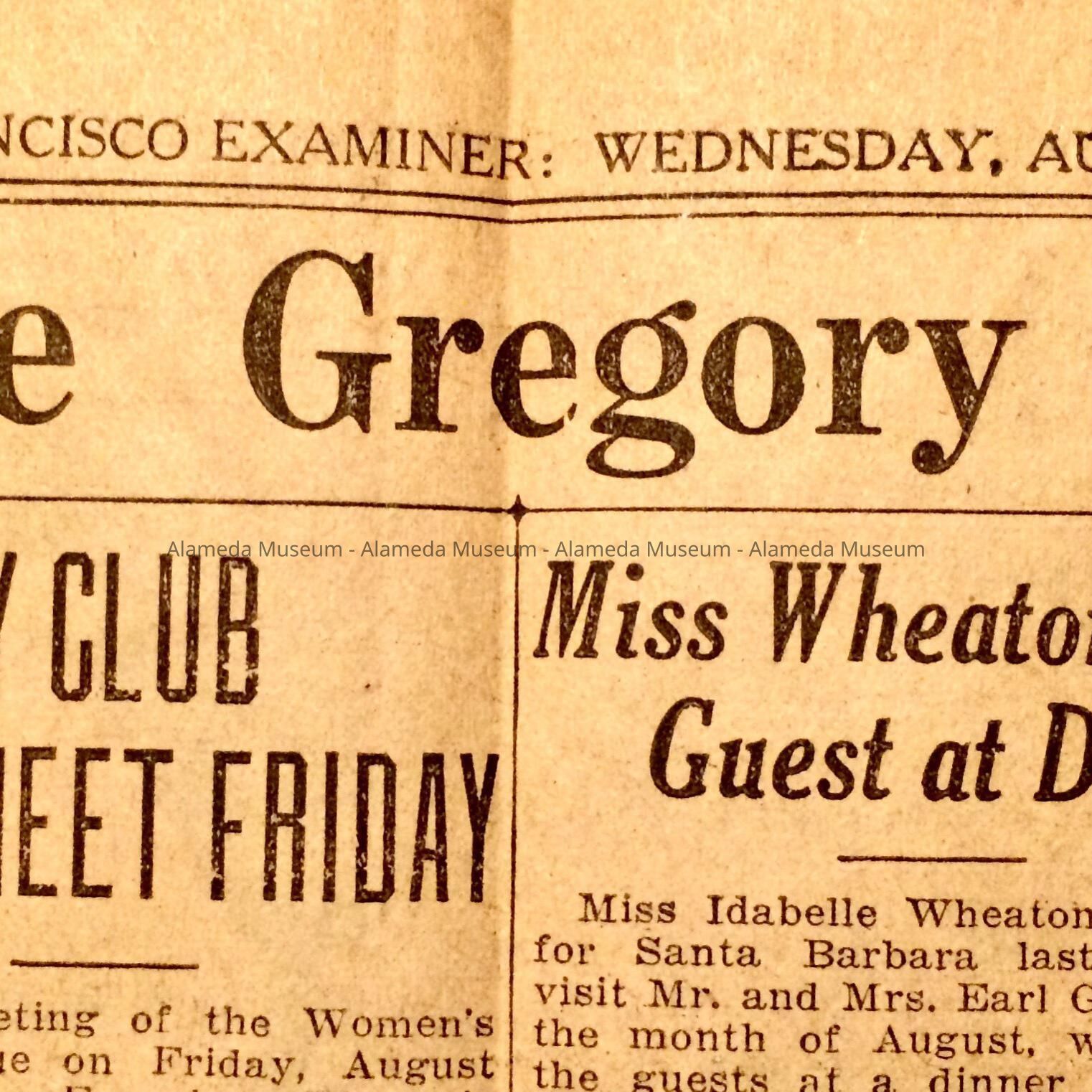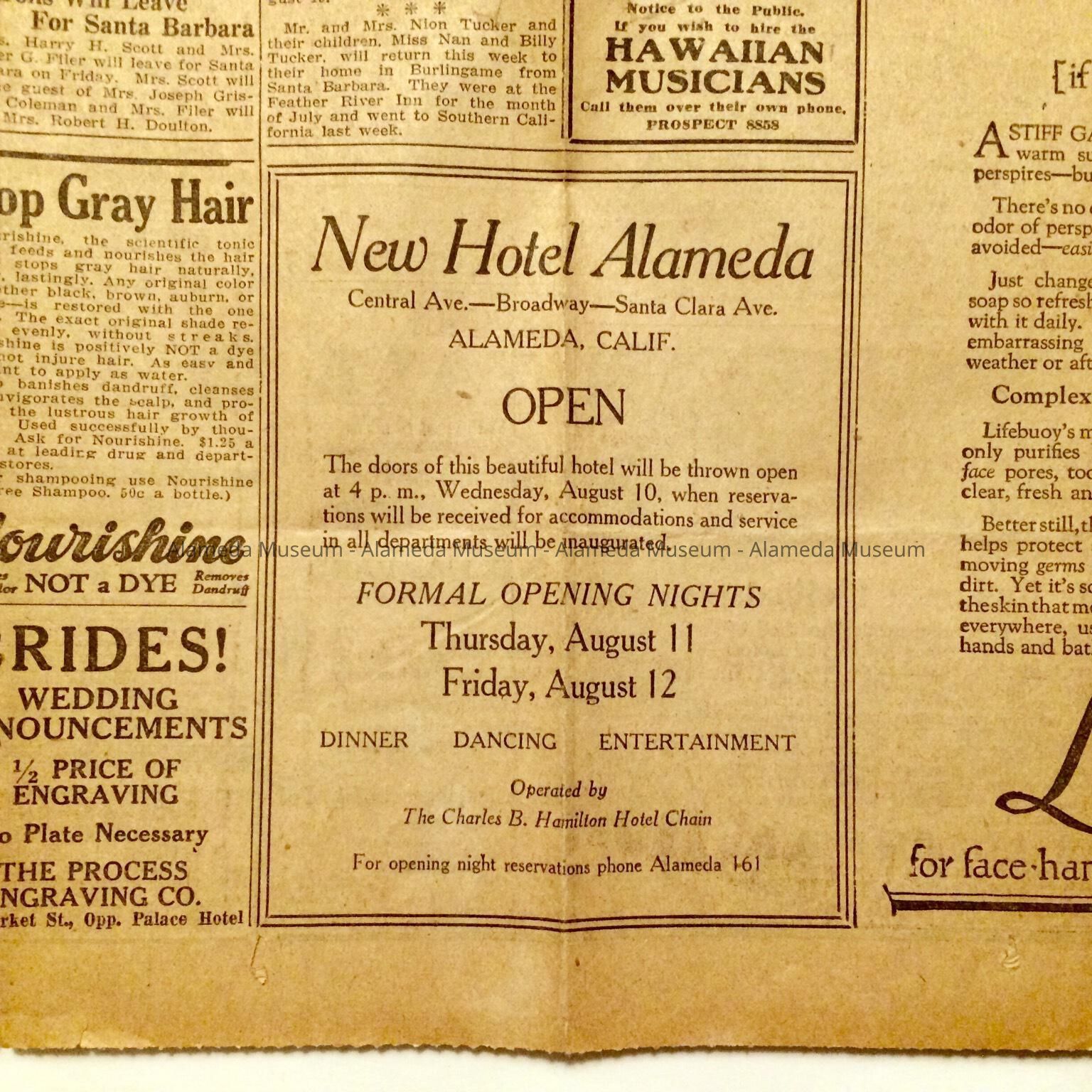 History: Pages from the San Francisco Examiner dated Wednesday, August 10, 1927 with an ad for the new Hotel Alameda announcing the formal opening nights of August 11-12, 1927.