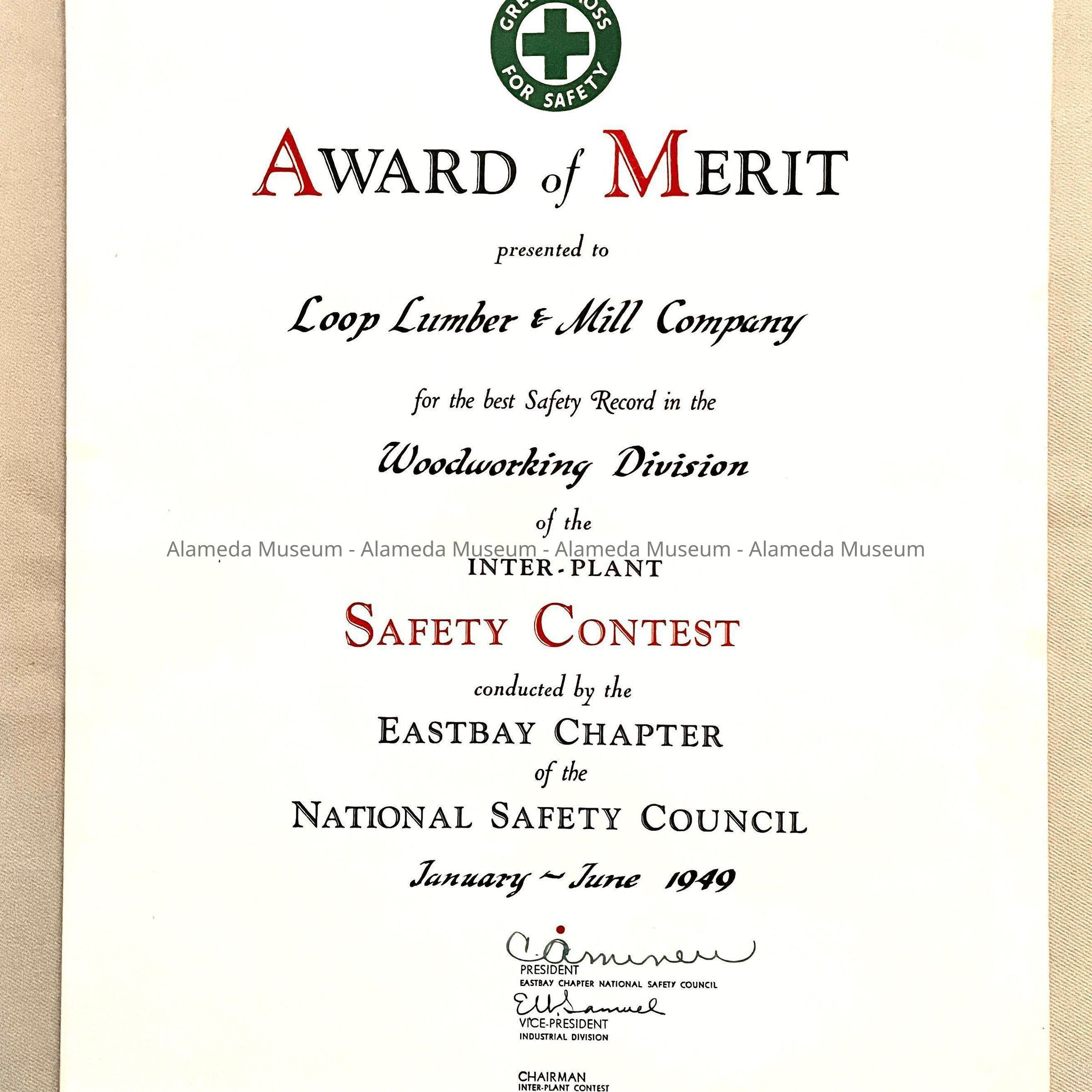 AN AWARD OF MERIT PRESENTED TO THE LOOP LUMBER AND MILL COMPANY ON THE OCCASION OF THEIR SAFETY RECORD IN THE WOODWORK DIVISION OF THEIR PLANT. THE AWARD WAS PRESENTED BY THE EAST BAY CHAPTER OF THE NATIONAL SAFETY COUNCIL, AND ISSUED FOR THE PERIOD JANUARY - JUNE 1949.