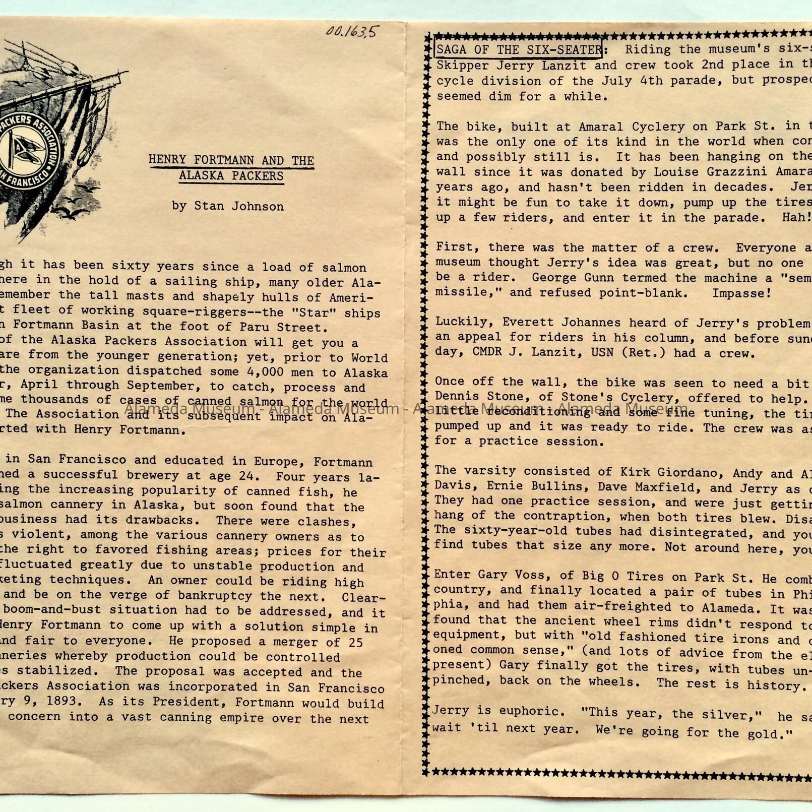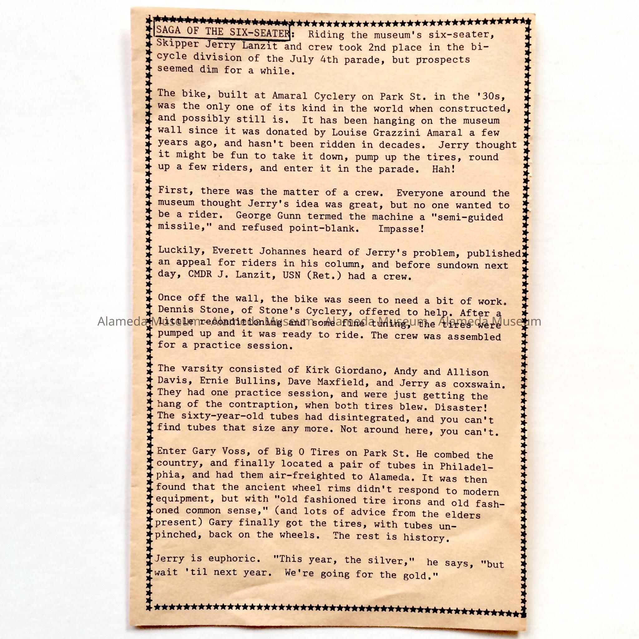 History: Article that appeared in the 1990 Alameda Museum Quarterly concerning the six (6) seat bicycle ridden in the 1990 Fourth of July Parade.