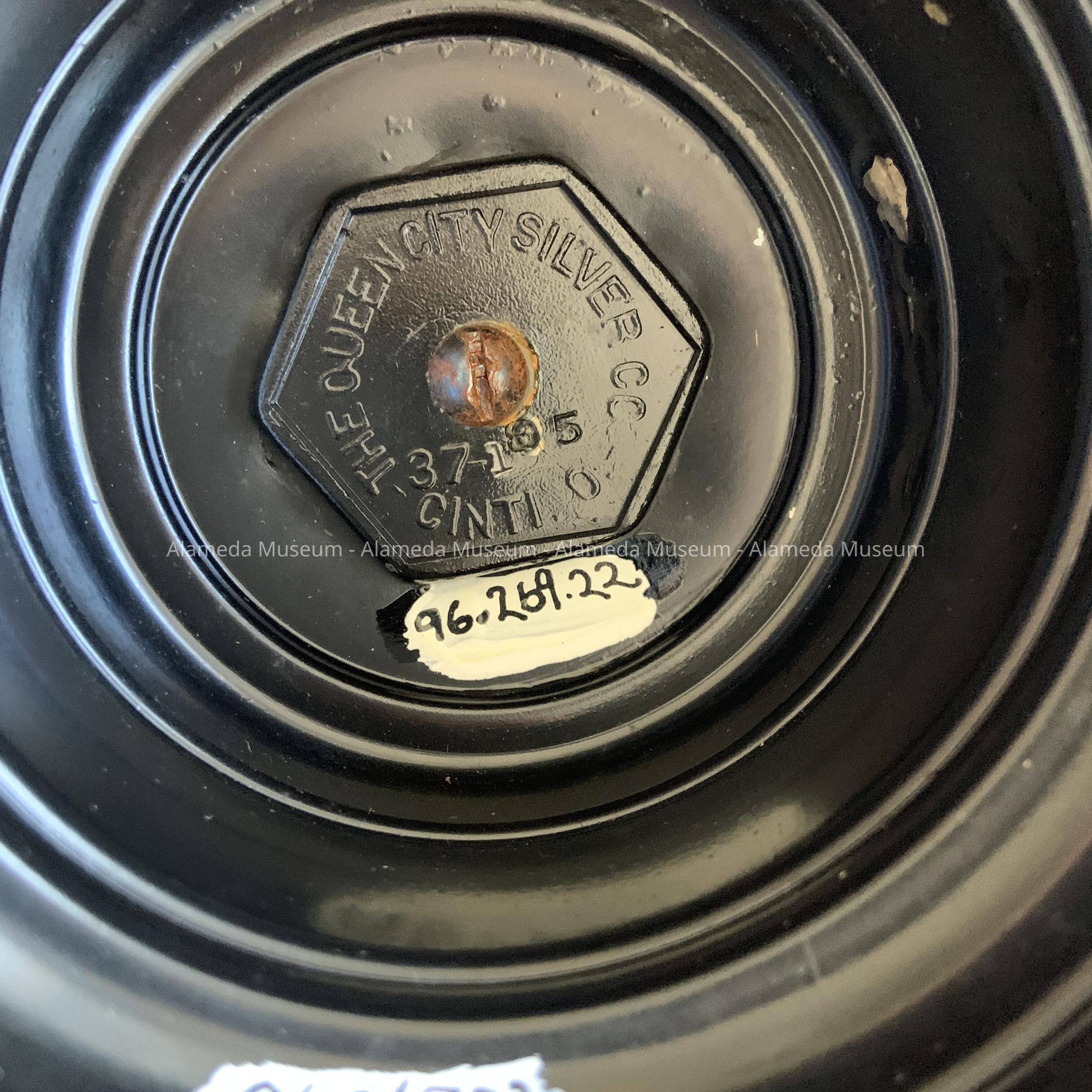 DOUBLE-HANDLED, ENGRAVED SILVER-PLATED TROPHY ON BLACK-COLORED METAL PEDESTAL BASE. TROPHY SIGNED IN INTERIOR OF BASE, "THE QUEEN CITY SILVER CUP, CINCINNATI, OHIO." TROPHY NEEDS TO BE REPAIRED.