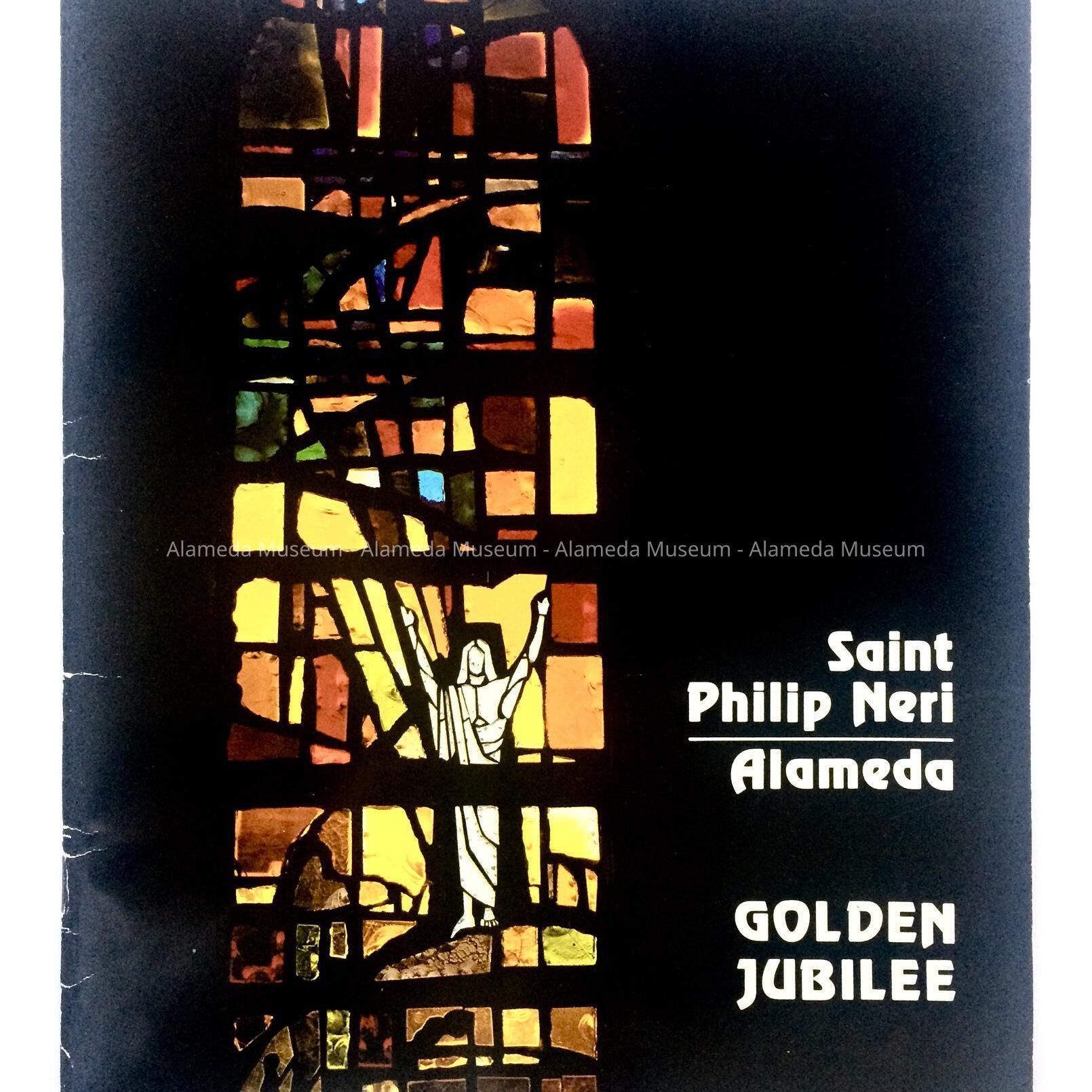Softbound publication with cover design in color of a stained-glass church window and bold-printed caption "Saint Philip Neri in Alameda".
