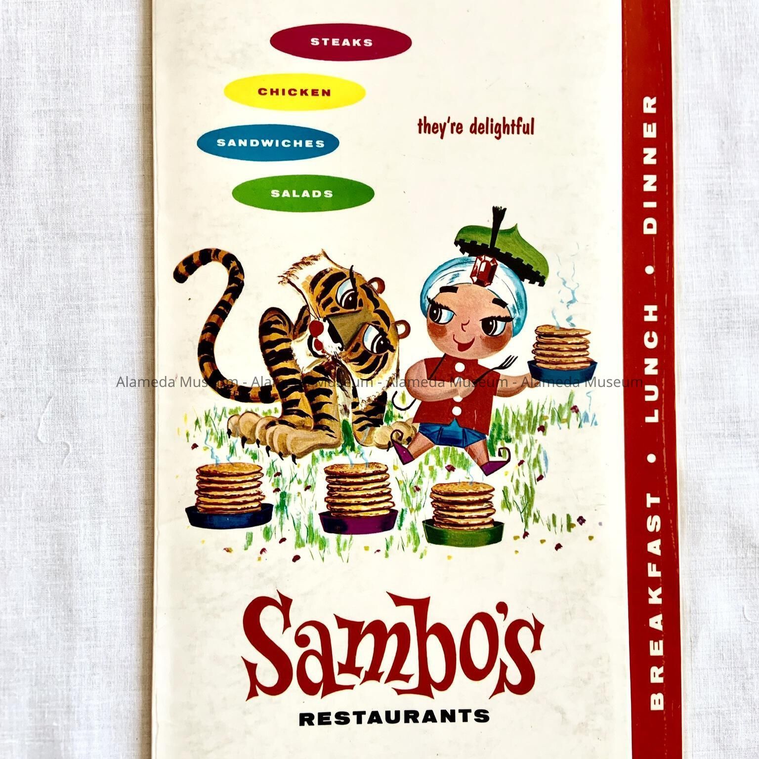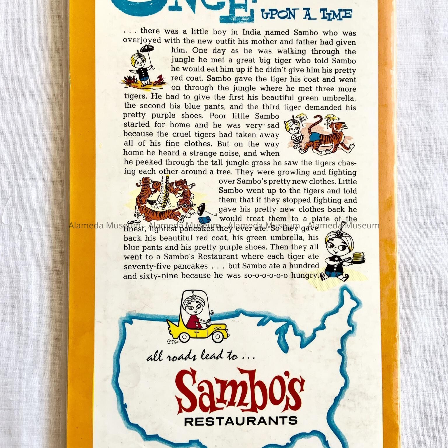 Description: Laminated tri-fold multi-color menus. The front cover has a cartoon drawing of Sambo with a tiger and a stack of pancakes; the back cover features a map showing the location of Sambo's Restaurants.