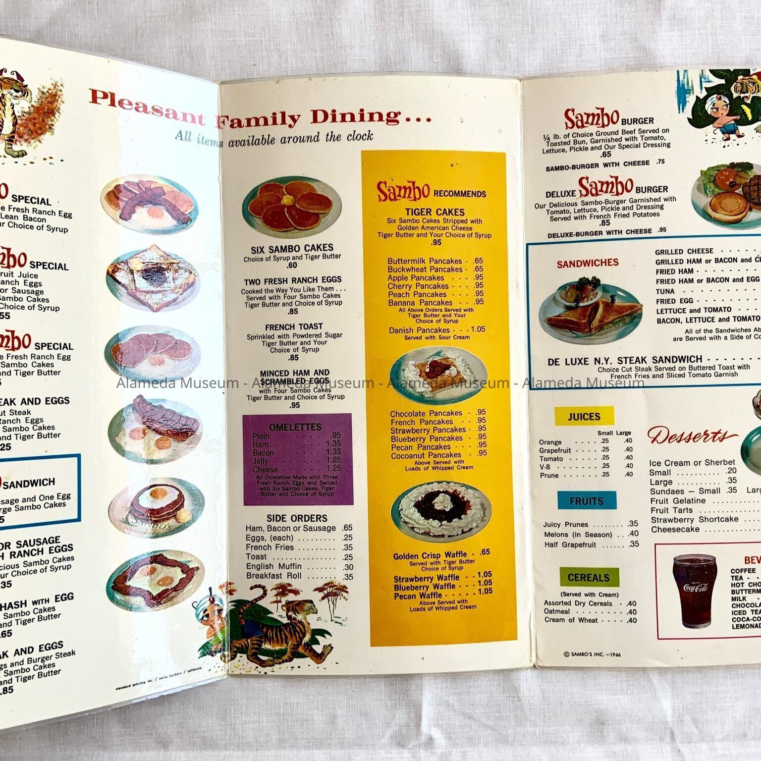 History of Object: Menus used at Sambo's Restaurant, Alameda, shortly after it opened in 1968. Part of the collection of the late Samuel Purdy, an original employee of this restaurant.
