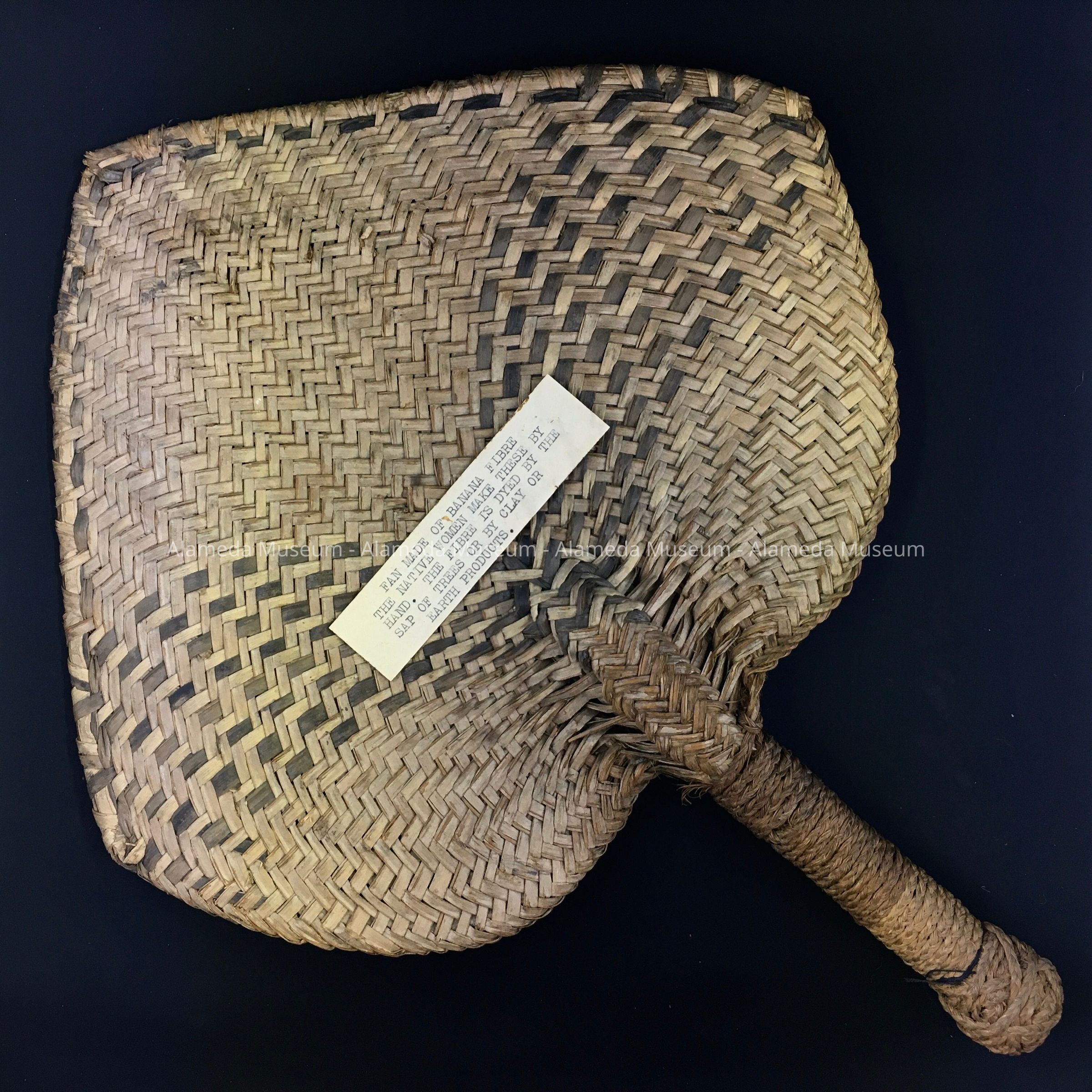 A WOVEN HAND FAN, MADE OF BANANA FIBER BY NATIVE WOMEN OF SAMOA. FIBERS ARE DYED WITH SAP FROM TREES --- OR CLAY AND EARTH PRODUCTS.