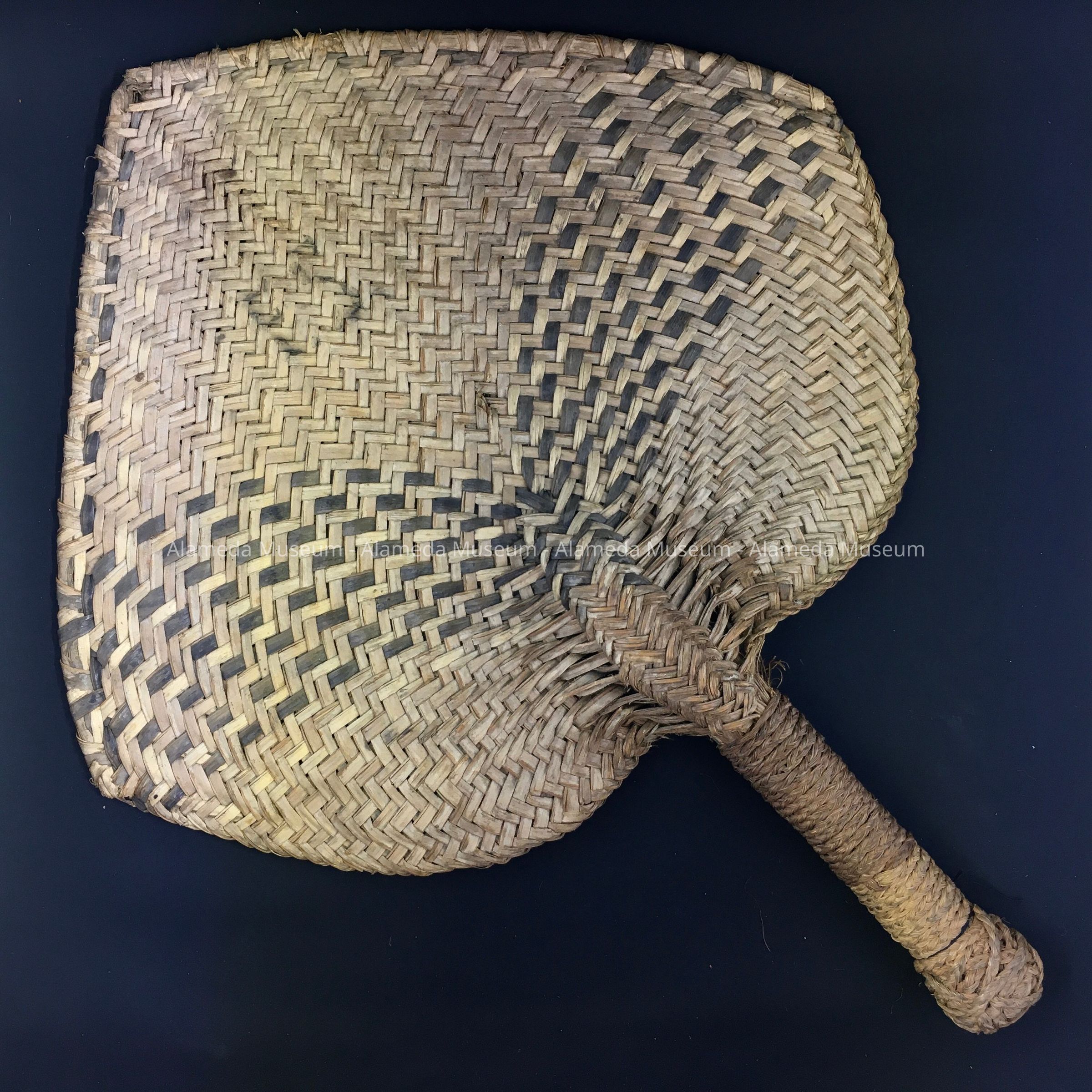 A HAND FAN FROM THE COLLECTION OF CAROLYN POTTER, WASHINGTON SCHOOL TEACHER. THE FAN WAS AMONG SEVERAL GIFTS RECEIVED FROM STUDENTS IN SAMOA. ALAMEDA STUDENTS HAD CONTRIBUTED TO CHRISTMAS BOXES WHICH WERE SENT TO SAMOA SAMOAN STUDENTS RECIPROCATED BY SENDING SEVERAL GIFTS TO ALAMEDA IN APPRECIATION. (SEE CARD 09.26.1 FOR FURTHER DETAILS.)