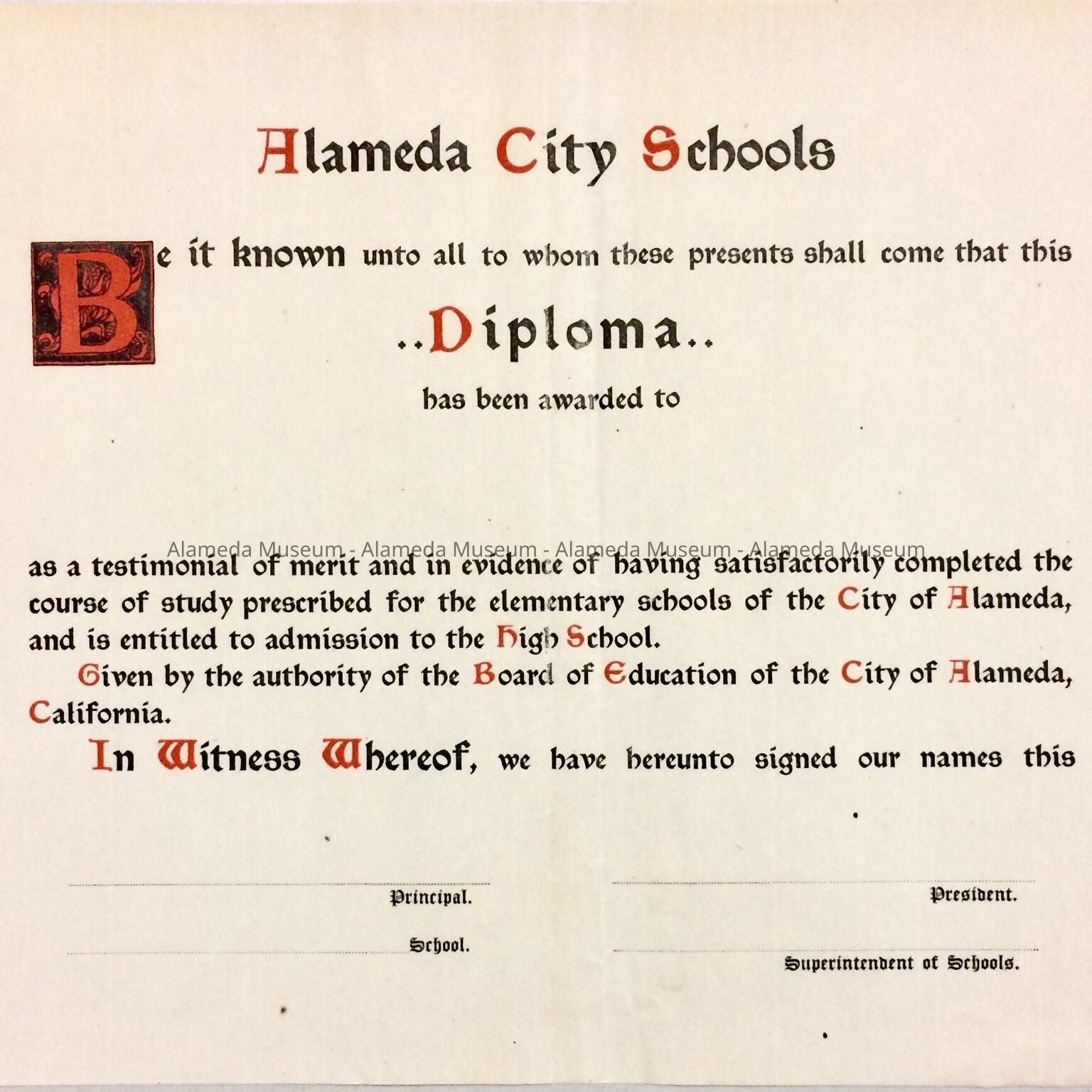DIPLOMA FORM IN RED- AND BLACK-COLORED TYPE ON AN OFF-WHITECOLORED PAPER BACKGROUND. DIPLOMA HAS BOLD-PRINTED CAPTION, "ALAMEDA CITY SCHOOLS."