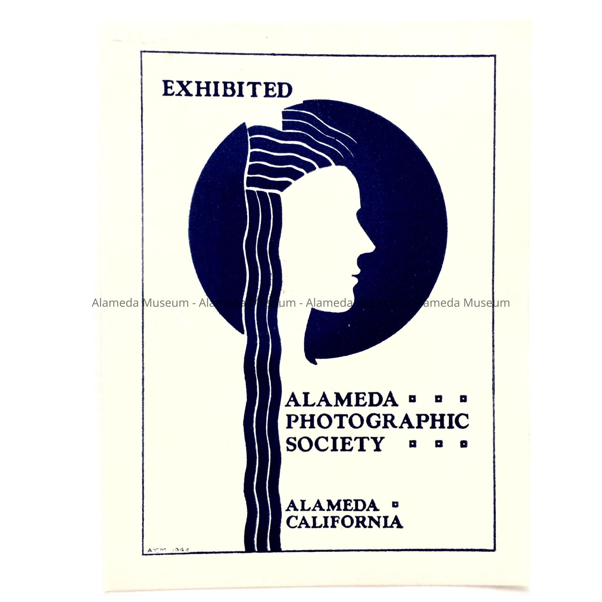Description: Paper label with graphics and caption in dark blue colored type on a white colored background. Caption states "Alameda Photographic Society".