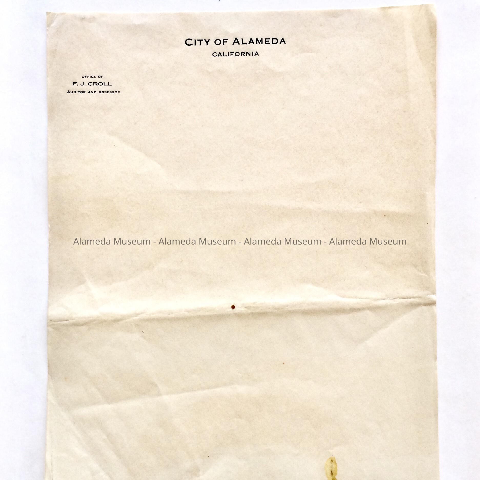 History of Object: Sample of official stationery, office of F. J. Croll, auditor and assessor, City of Alameda, before 1949.