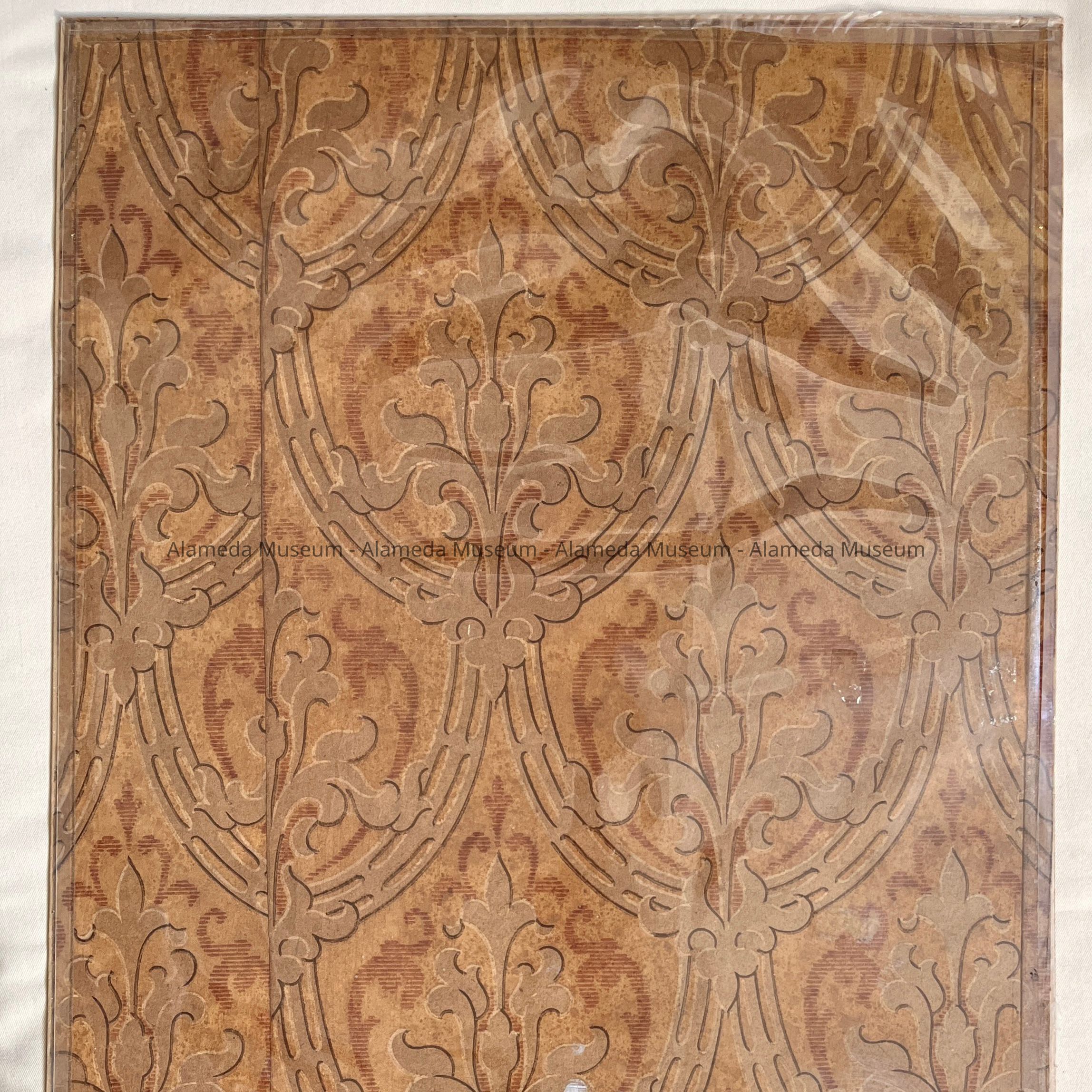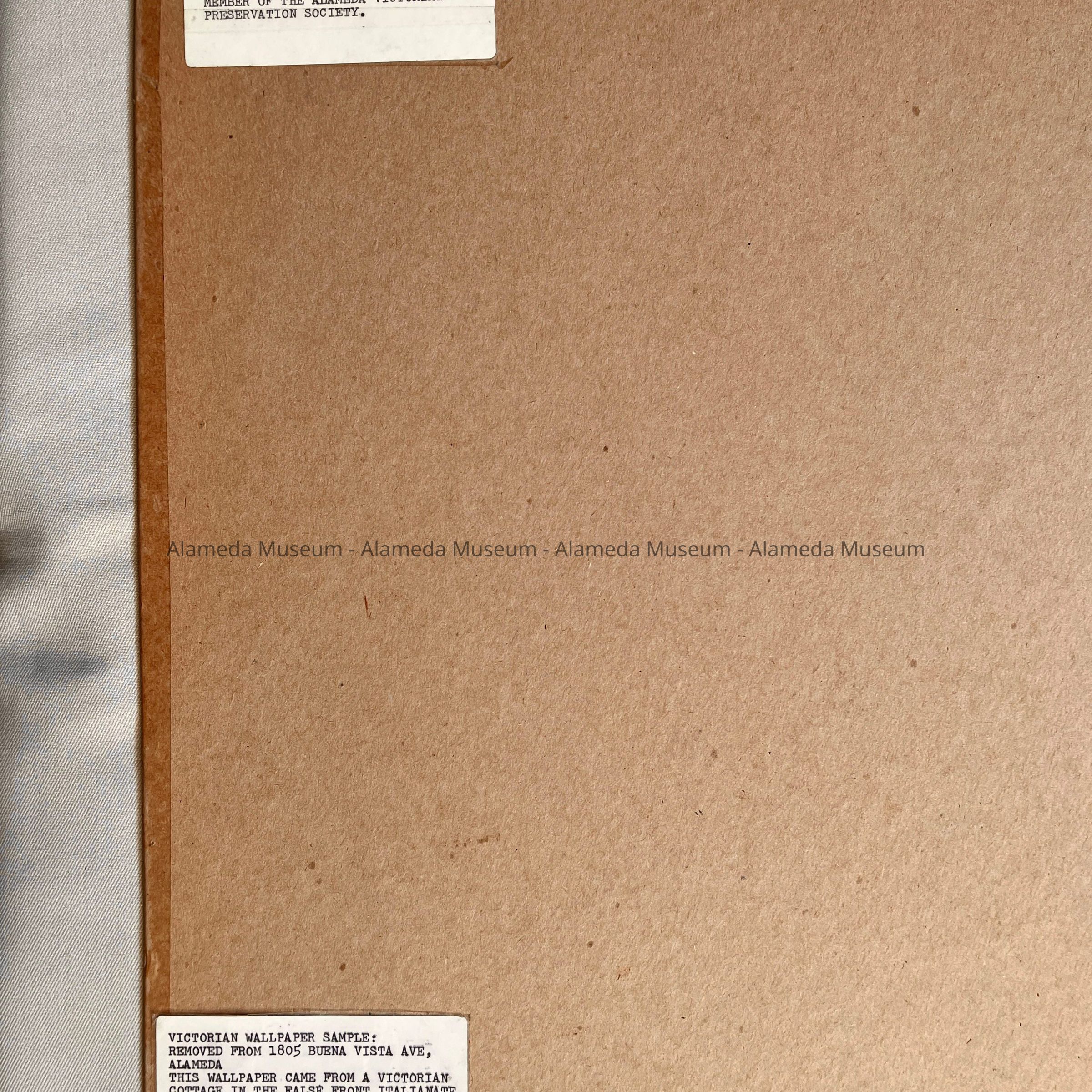 HISTORY OF OBJECT: VICTORIAN WALLPAPER SAMPLE REMOVED FROM 1805 BUENA VISTA AVENUE, ALAMEDA. A VICTORIAN COTTAGE IN THE FALSE FRONT ITALIANATE STYLE, CIRCA LATE 1870's. LOCATED ON THE NORTH SIDE OF BUENA VISTA. DEMOLISHED JAN 17, 1975. THIS SAMPLE WAS TAKEN FROM ONE OF THE BEDROOMS, BY PAT PAYNE, A MEMBER OF THE ALAMEDA VICTORIAN PRESERVATION SOCIETY