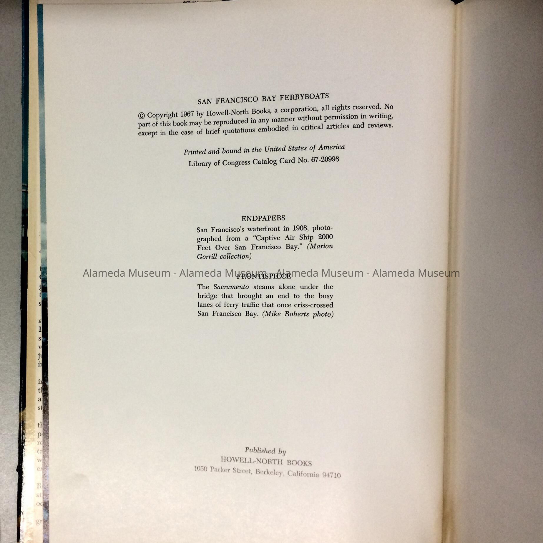 DESCRIPTION: A HARDBOUND BOOK WITH ORIGINAL DUST JACKET, WHICH HAS A COLORED PHOTOGRAPHIC IMAGE OF THE BAY BRIDGE AND BOLD-PRINTED CAPTION, "SAN FRANCISCO BAY FERRY BOATS." BOOK WAS PRINTED BY HOWELL-NORTH BOOKS, BERKELEY, CA, 1967. AUTHOR WAS GEORGE H. HARLAN.