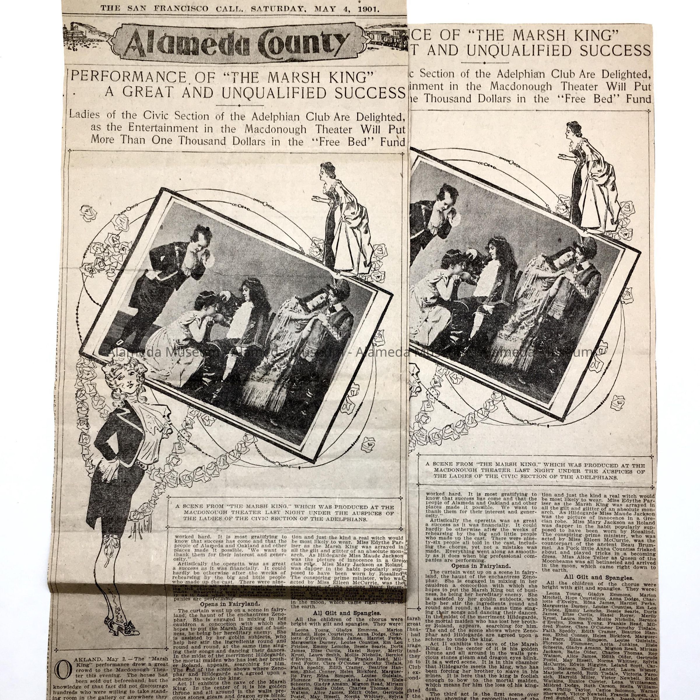 AN ILLUSTRATED NEWSPAPER CLIPPING FROM THE "SAN FRANCISCO CALL," DATED MAY 4, 1901, CONCERNING THE SUCCESS OF THE CHILDREN'S OPERETTA ENTITLED, "THE MARSH KING," WRITTEN BY CHARLES H MCCURRIE, ALAMEDA COMPOSER. THE OPERETTA WAS PERFORMED UNDER THE AUSPICES OF THE ADELPHIAN CLUB AS A CHARITABLE EVENT.
