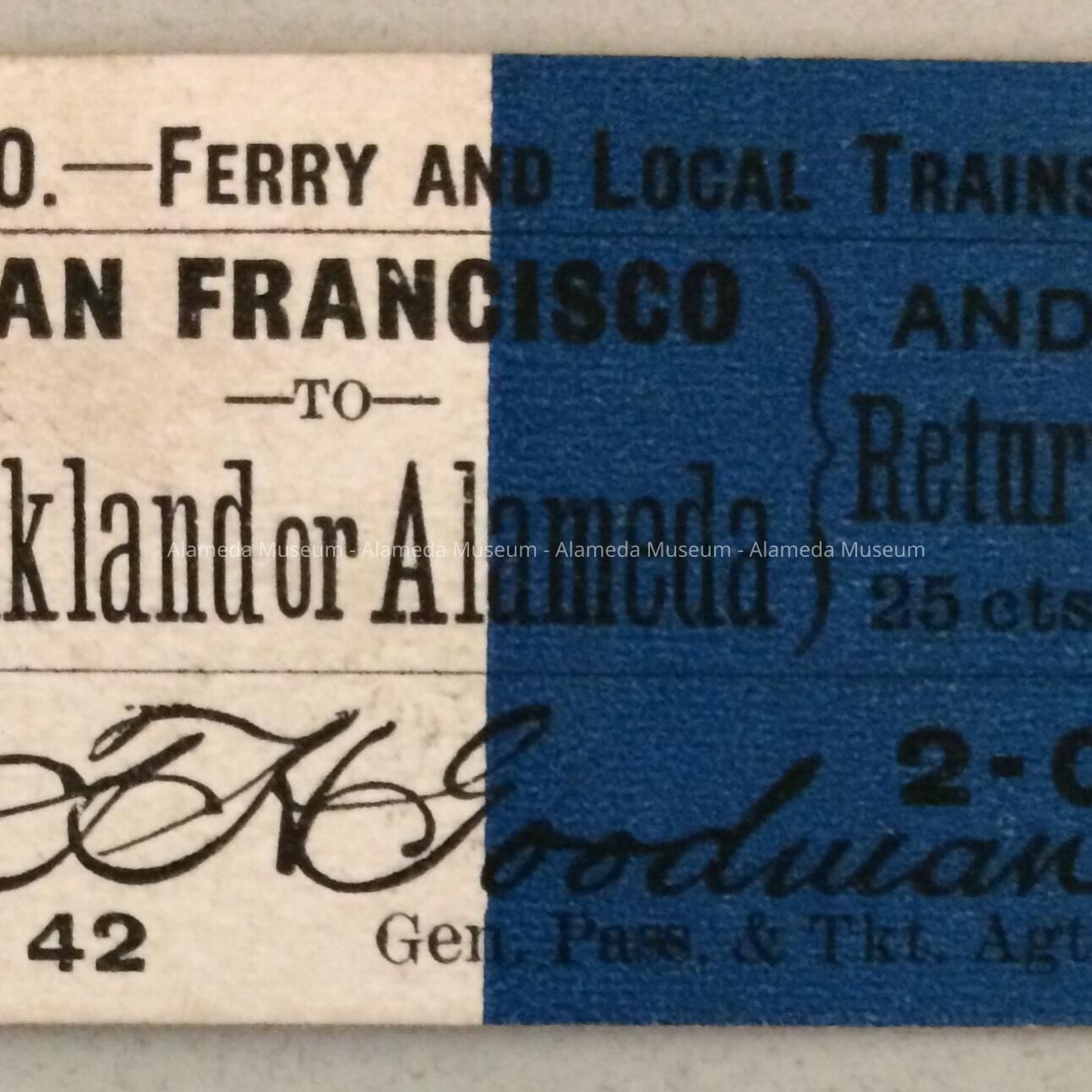 Ticket printed on heavy stock paper. The face of the ticket is divided in half by the colors white and blue and is numbered SN-29979. The caption states in black colored type: "San Francisco to Oakland or Alameda".