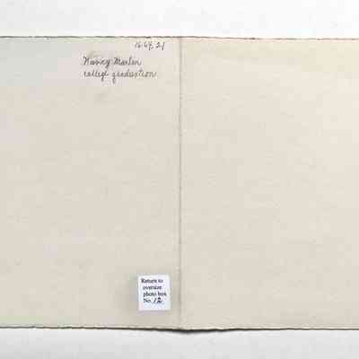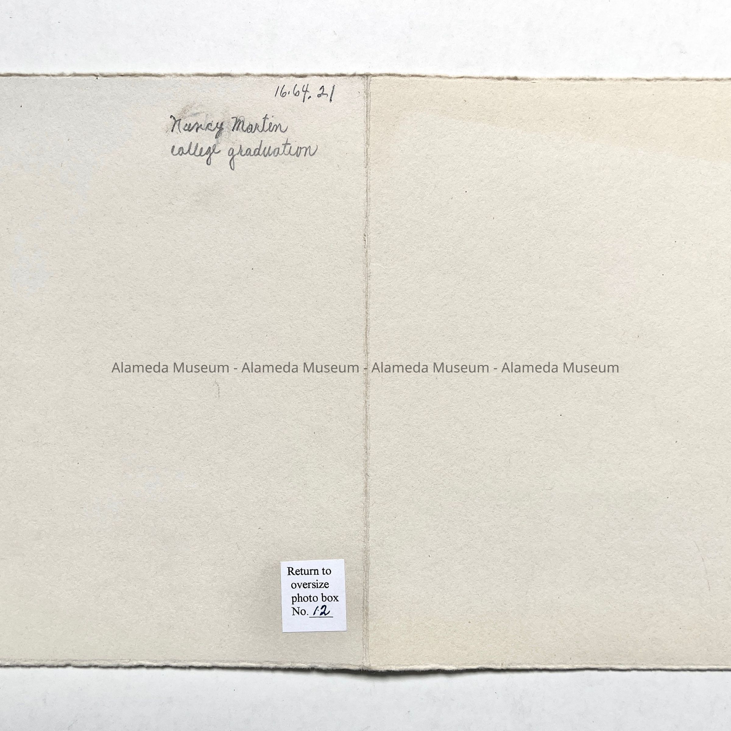 Description: A black and white graduation photo of Nancy Martin mounted in a buff studio folder. Photographer: Norman Wing, San Jose.