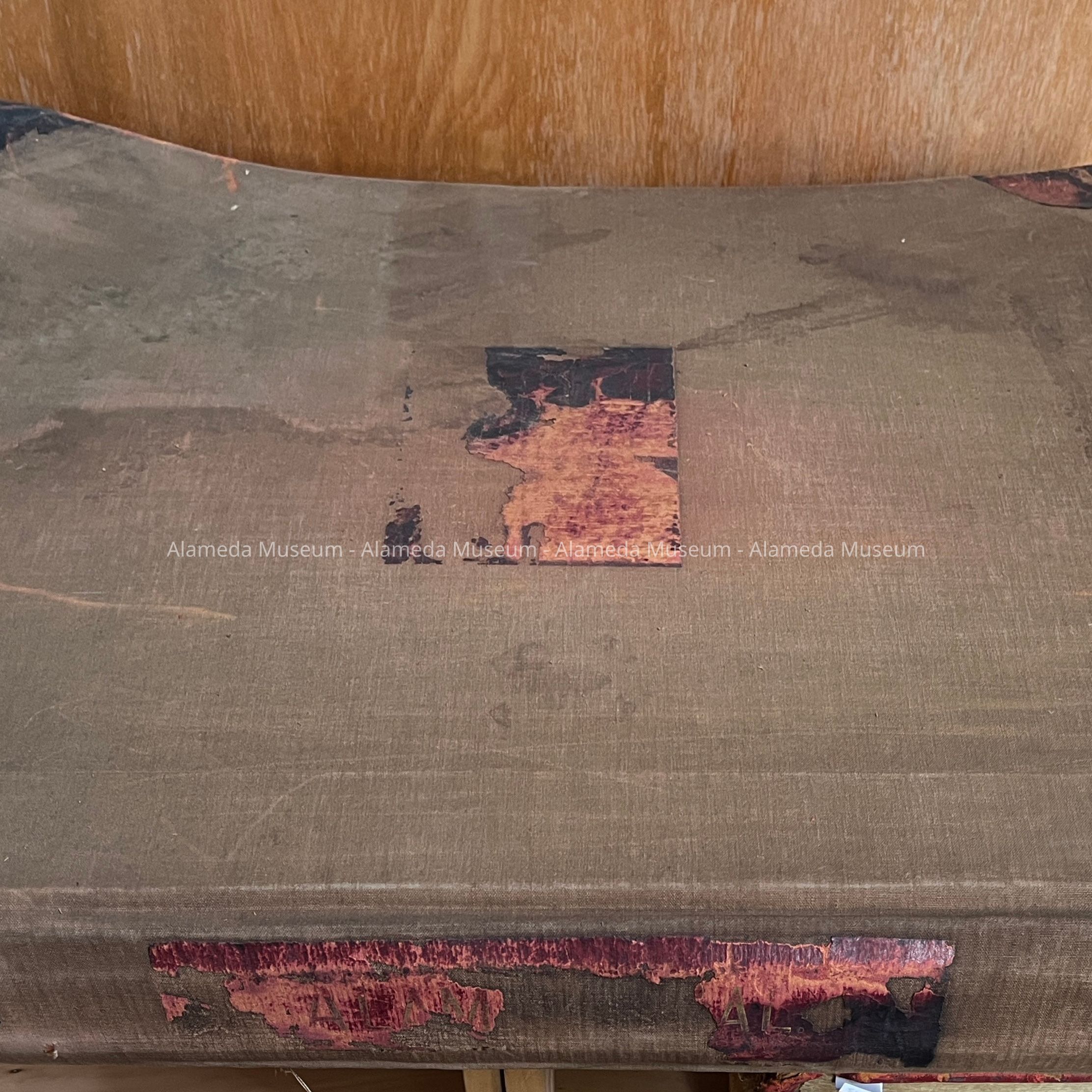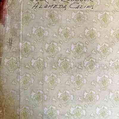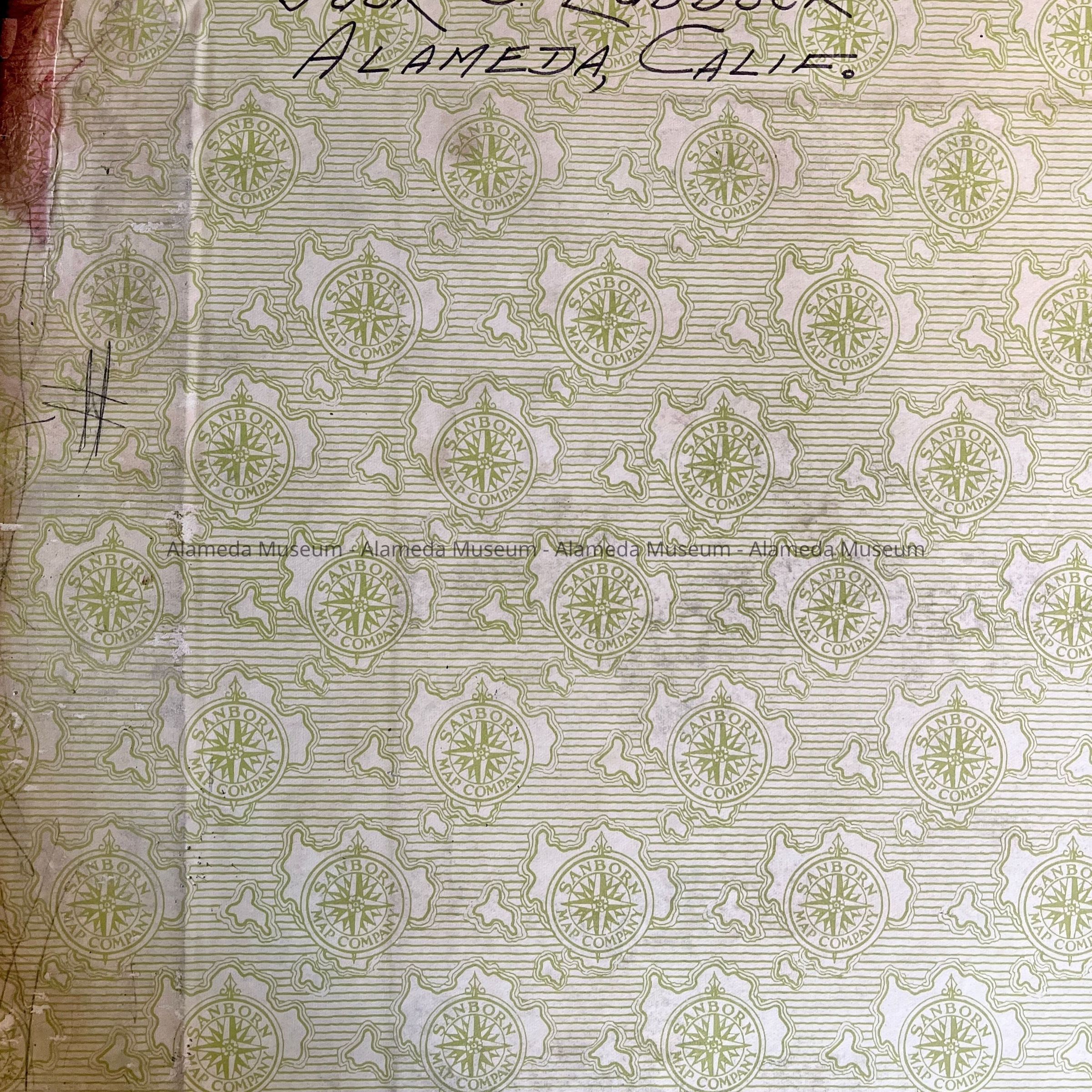 Description: large book with cover of olive-tan buckram or linnen, with remnants of a red leather corners and leather or paper label on front and spine. On the spine, remnants of 'Alameda - Cal' can be out ('Alam', and 'Al'). The inside cover has handwritten: ' Property of Jack O. Lubbock, Alameda, Calif'. The fly leaf has printed information glued in, dating from October 1950, one with a stamp in green 'Jack O. Lubbock'. The first page is a detail map.