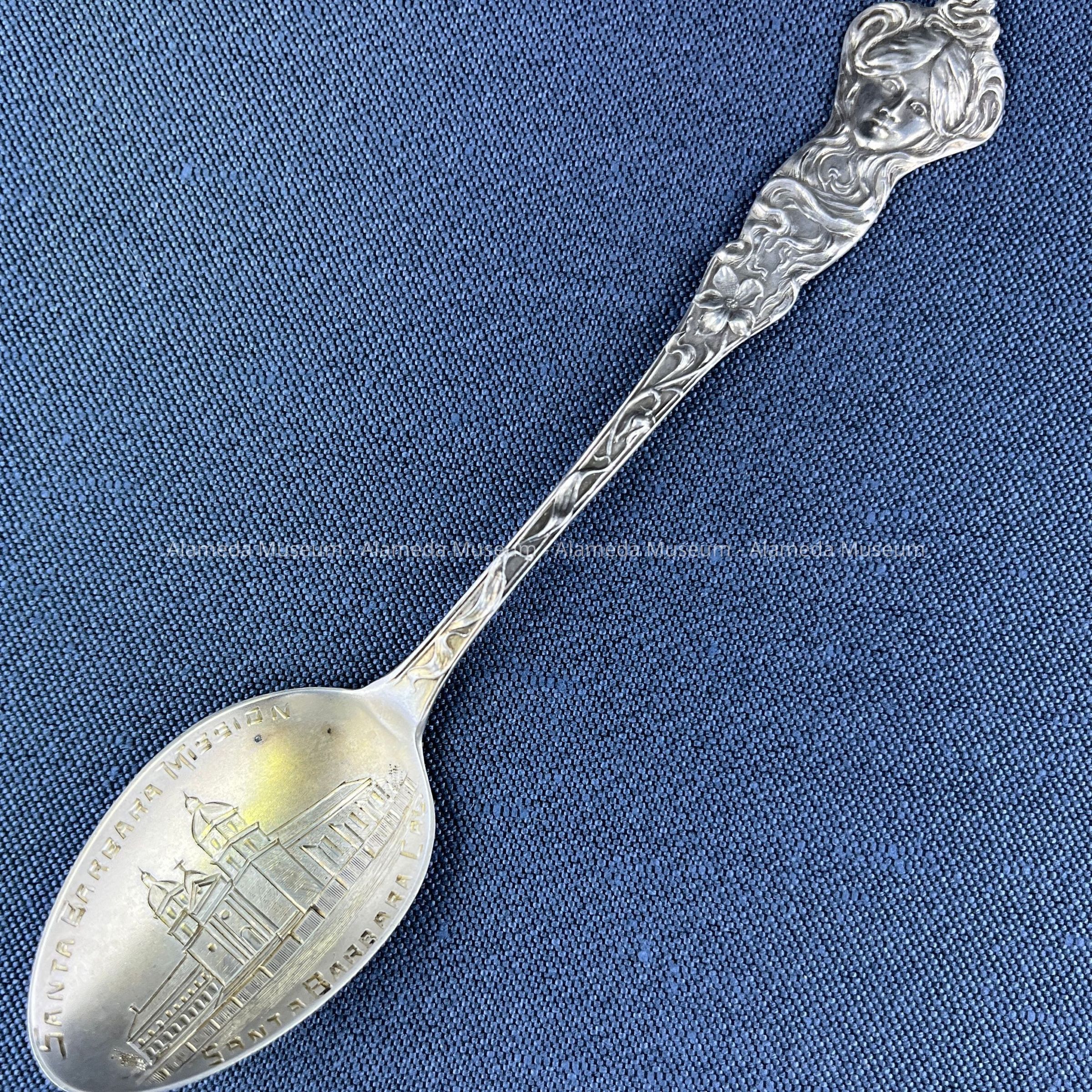 Description: Sterling silver teaspoon with engraved bowl depicting the Santa Barbara Mission, Santa Barbara, Cal. Decorative motif on handle representing a ladies face with flowing hair (Art Nouveau style).