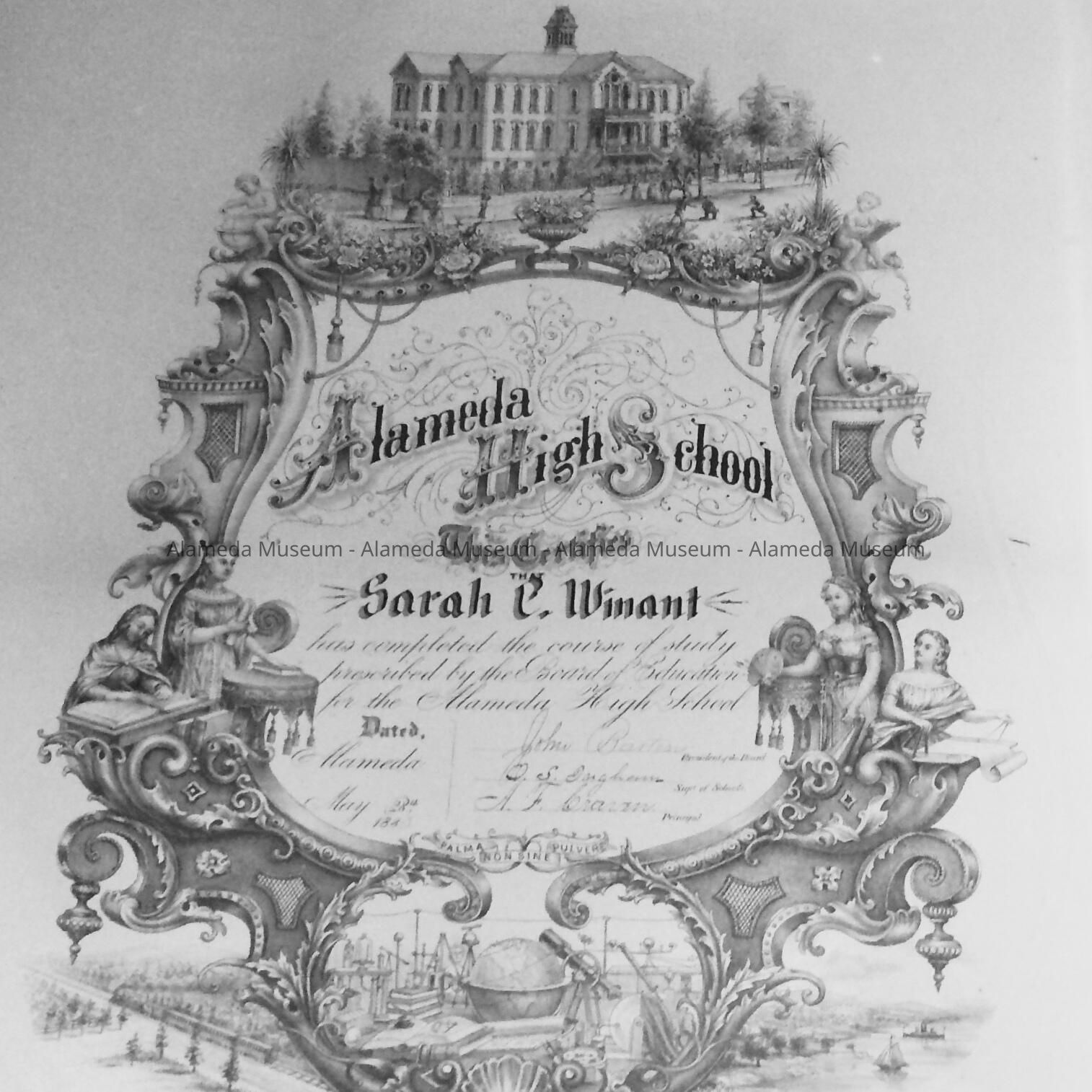History of Object: It is a very elaborate diploma from the first Alameda High School (Haight) dated May 28, 1880, Sarah C. Winant. Signed by John Barton, president of the board. At the top of the diploma is a drawing of the high school.