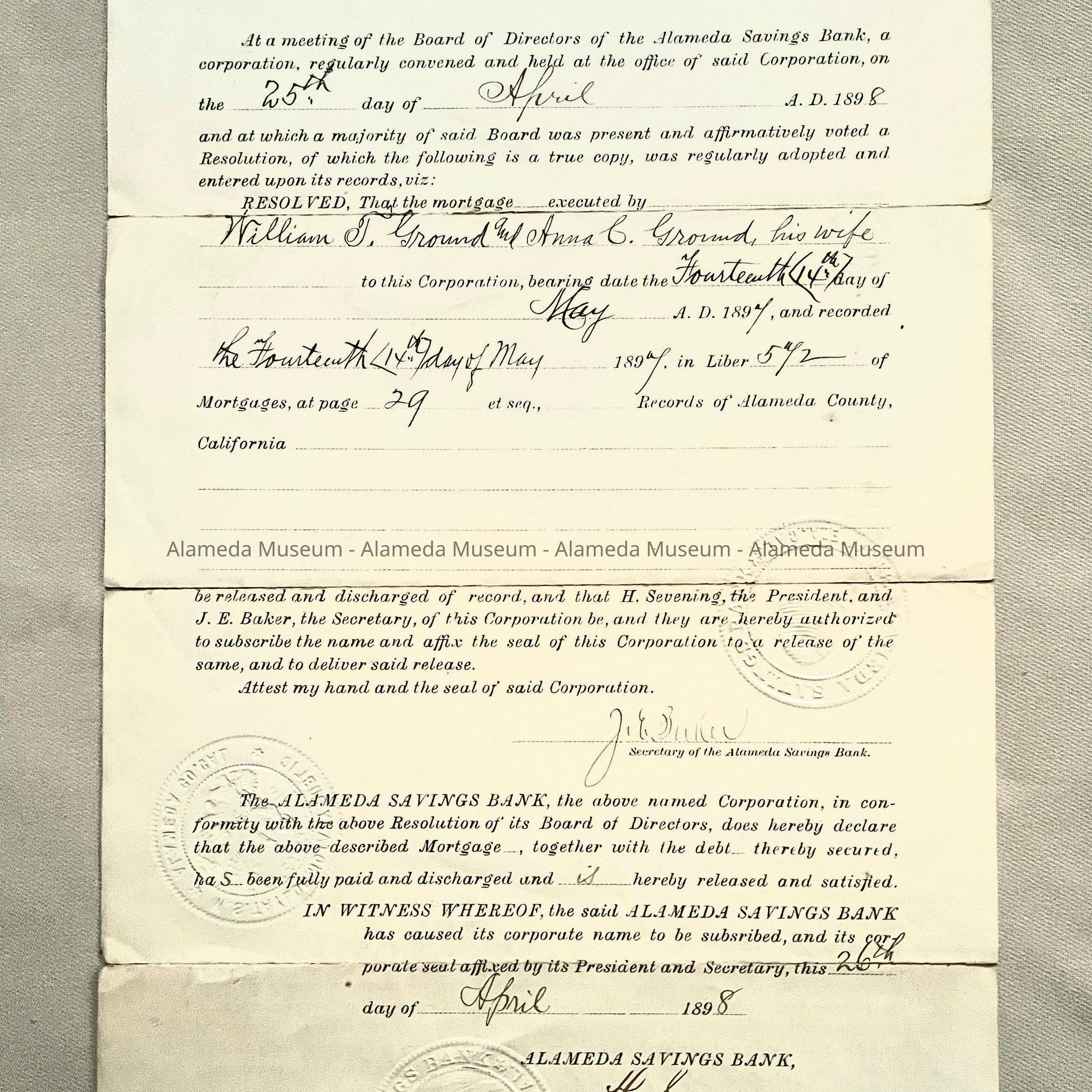 HISTORY OF OBJECT: A DOCUMENT RE SATISFACTION OF MORTGAGE FROM THE ALAMEDA SAVING BANK TO WILLIAM L AND ANNA C GROUND, RECORDED AT THE REQUEST OF C. TIETJEN. THE PROPERTY IS LOCATED AT 1020 BUENA VISTA AVENUE AND IS OCCUPIED BY A QUEEN ANNE COTTAGE, HIGH-BASEMENT, BUILT IN 1889 BY THE ALAMEDA LAND COMPANY FOR WILLIAM T. GROUND, AND SUBSEQUENTLY SOLD TO CHRISTIAN TIETJEN, CIGAR MAKER. THE DOCUMENT ALSO INCLUDES SIGNATURES OF H. SEVENING, PRESIDENT OF THE ALAMEDA SAVINGS BANK (WHICH LATER BECAME BANK OF AMERICA). MR SEVENING WAS THE PATERNAL GRANDFATHER OF FRANZ COLLISCHONN.