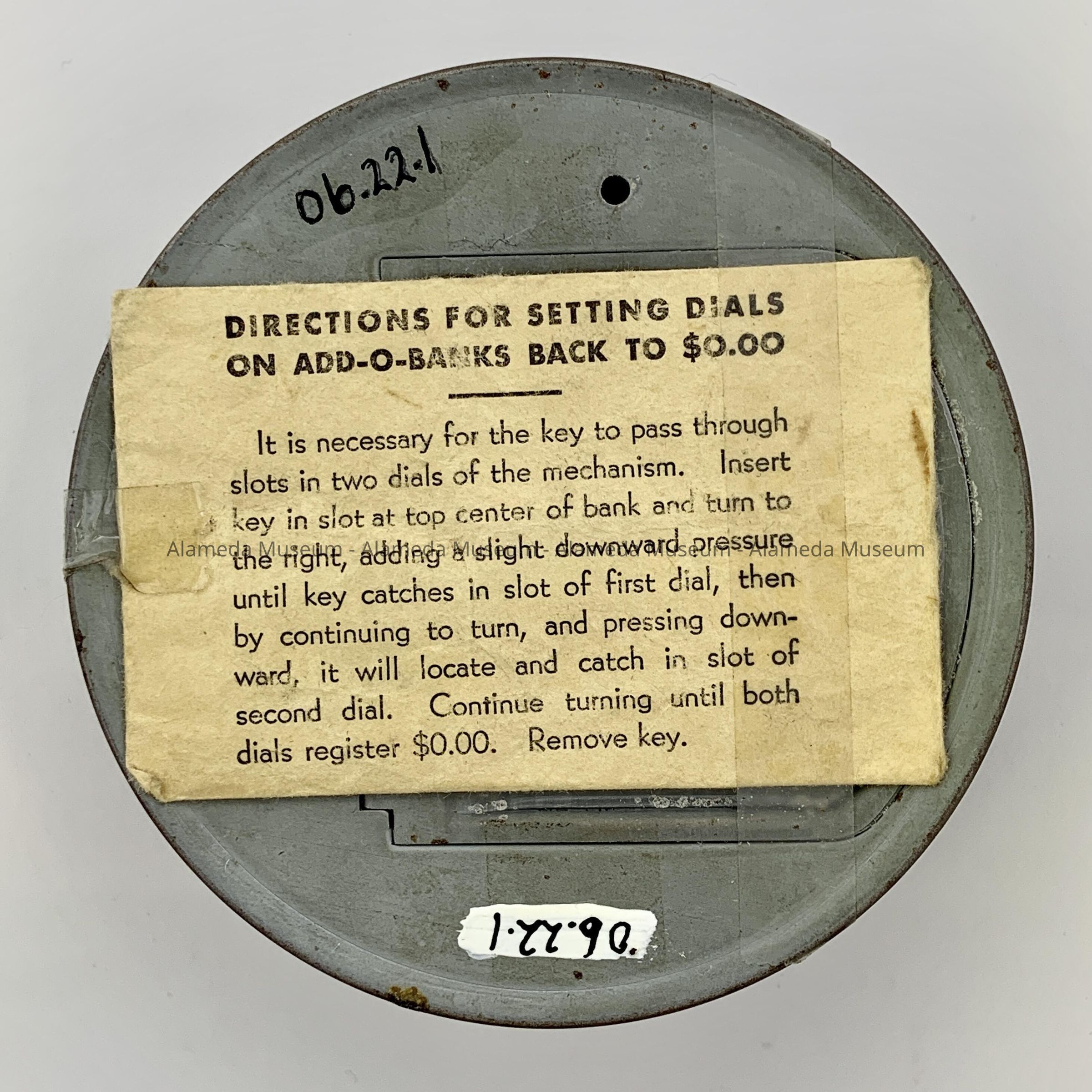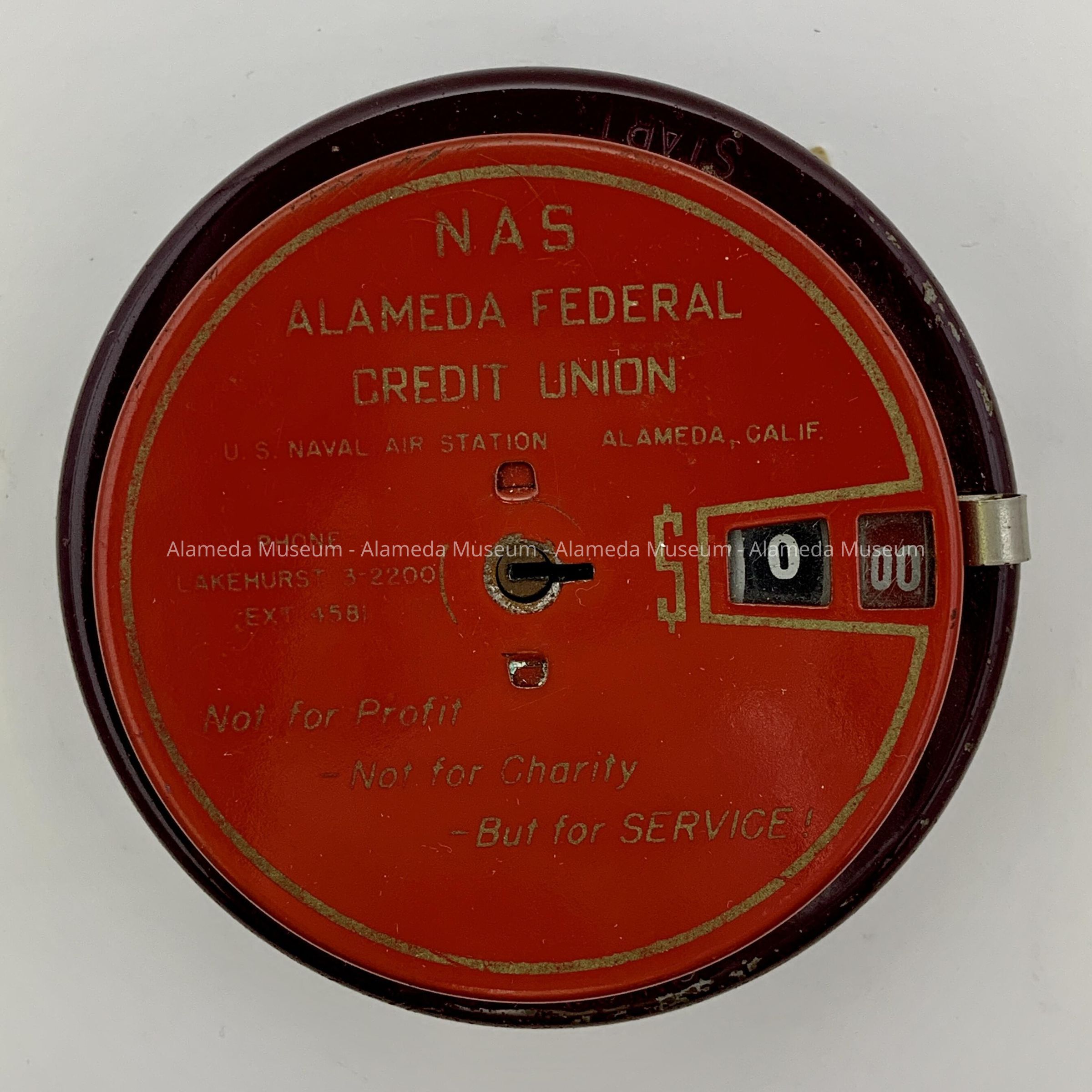 A CIRCULAR-SHAPED BANK OF ENAMELED METAL. TOP OF BANK IS RED-COLORED ENAMEL. "NAS ALAMEDA FEDERAL CREDIT UNION, US NAVAL AIR STATION, ALAMEDA, CALIF" APPEARS ON THE BANK. TOP ALSO INCLUDES A LEVER-OPERATED COIN COUNTER.
