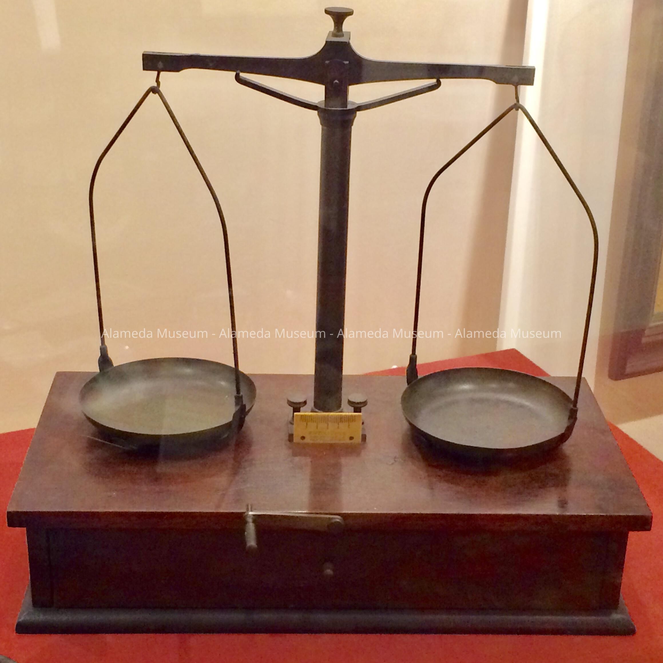 A SCALE FROM THE CHEMISTRY LAB OF ALAMEDA HIGH SCHOOL, WHICH WAS OBTAINED BY THE LATE ARCHIE WATERBURY WHO HAD ATTENDED CLASSES AT ALAMEDA HIGH SCHOOL.