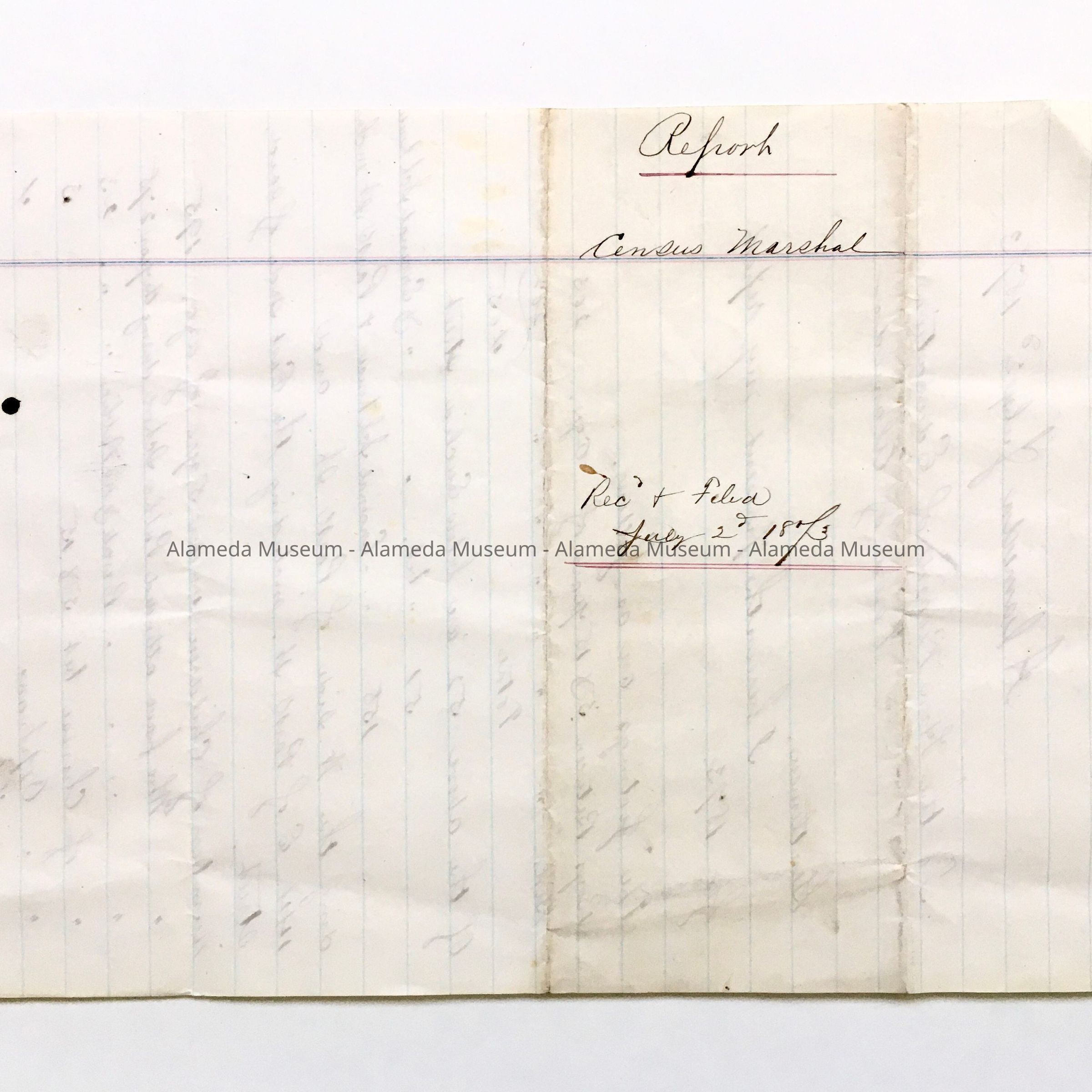 ONE-PAGE HANDWRITTEN (IN SEPIA-COLORED INK) REPORT. BOLD-PRINTED CAPTION, "ALAMEDA, JULY 2, 1873," ON BLUE-COLORED LINED PAPER.