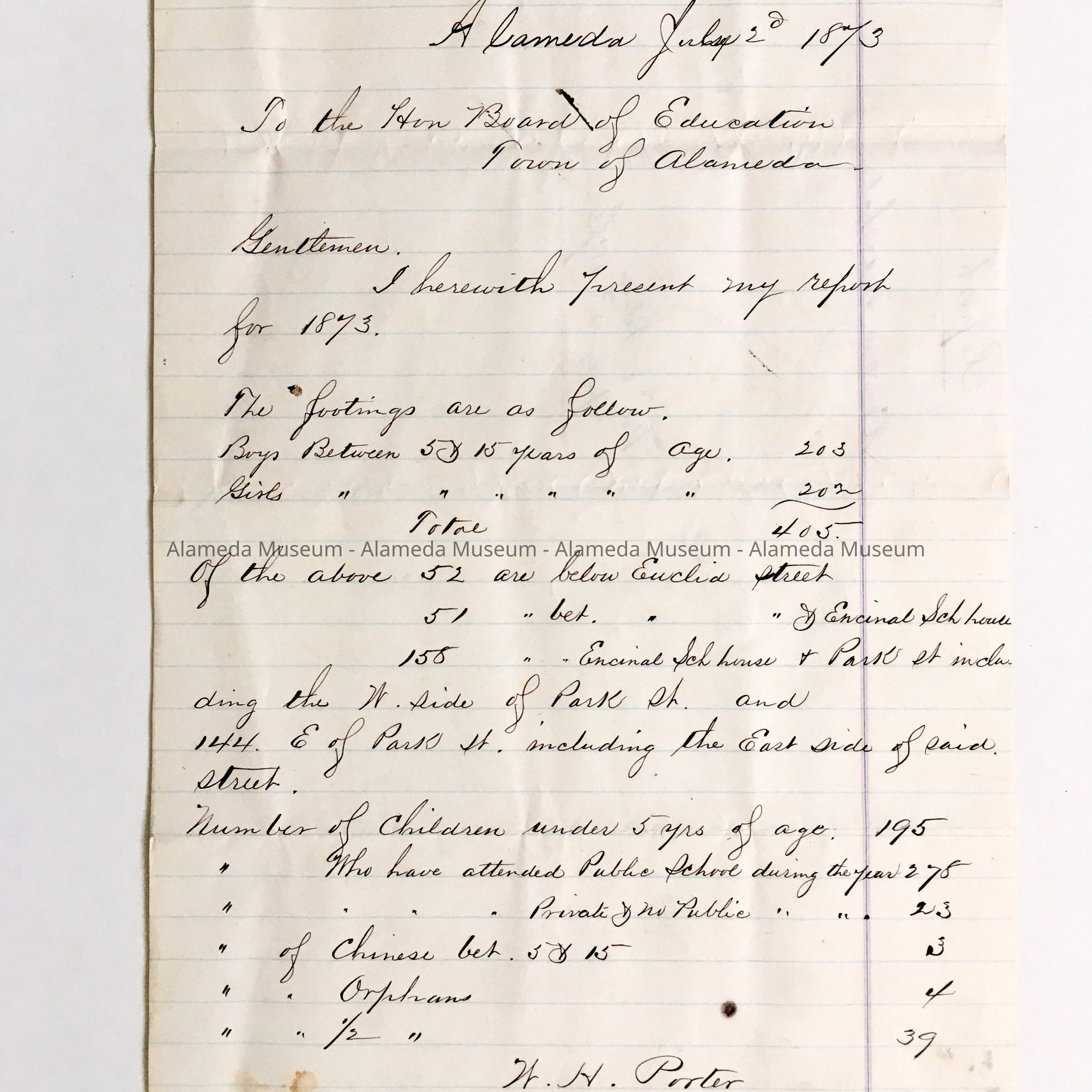 REPORT PRESENTED TO THE ALAMEDA BOARD OF EDUCATION, DATED JULY 2, 1873. INCLUDED ARE CENSUS FIGURES CONCERNING NUMBERS OF STUDENTS ENROLLED IN ALAMEDA PUBLIC SCHOOLS. REPORT IS SIGNED BY W H PORTER, CENSUS MARSHAL.