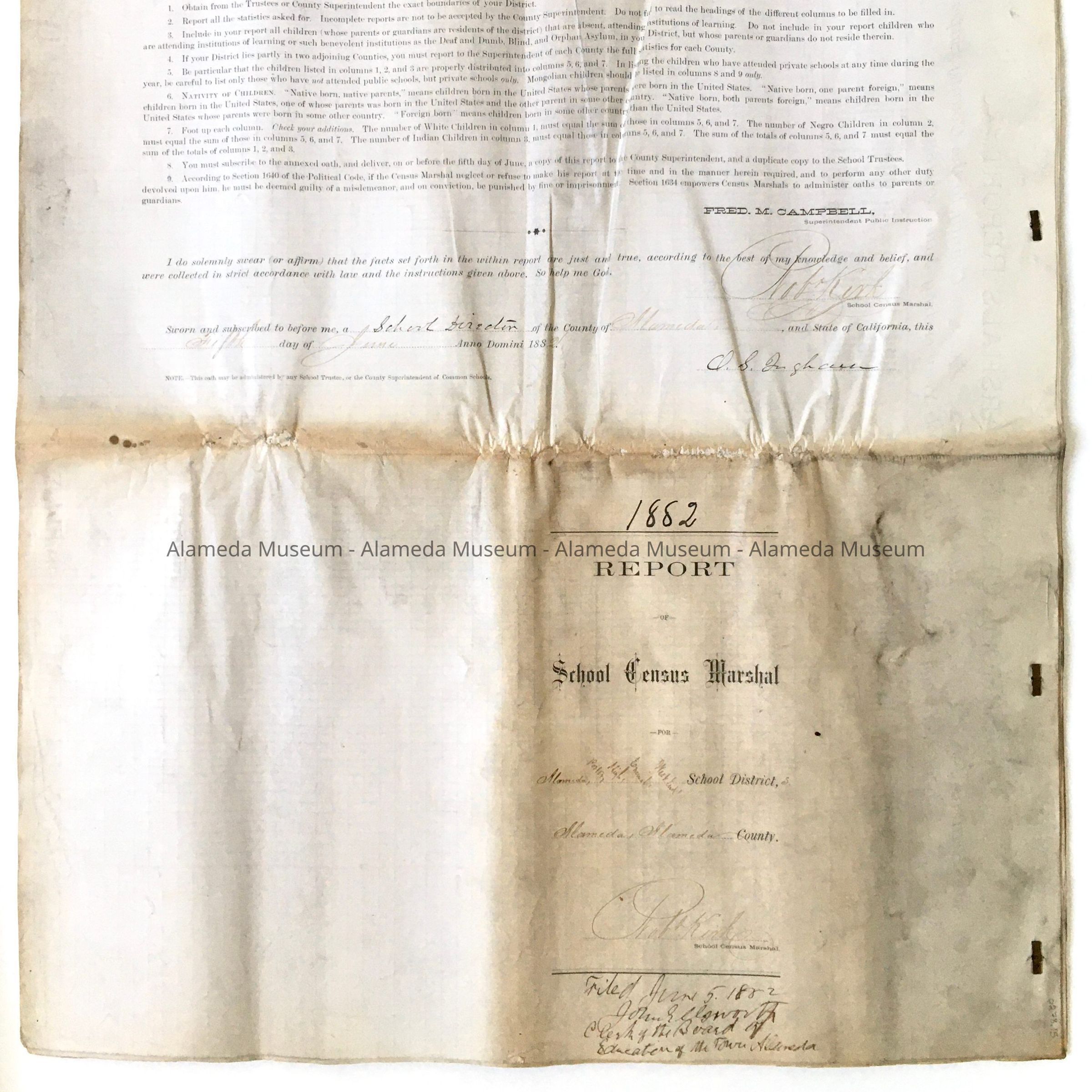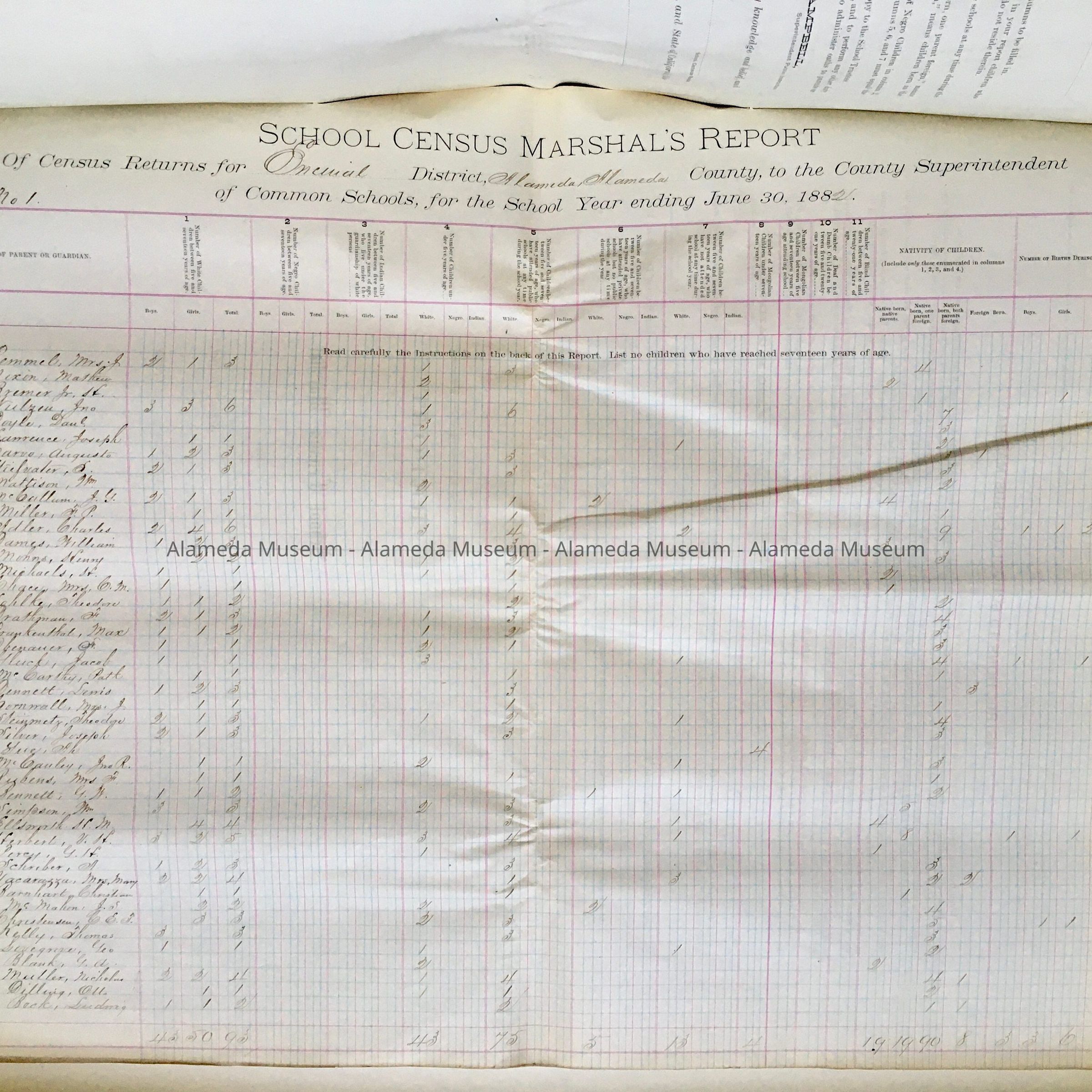 MULTI-PAGE REPORT, SECURED BY BRASS BRADS. PAGES HAVE BOLD-PRINTED CAPTION, "SCHOOLS CENSUS MARSHAL'S REPORT," IN BLACK-COLORED TYPE ON A WHITE-COLORED BACKGROUND. ACCOUNTANT'S STYLE LEDGER PAGES. COLUMNS ARE DEFINED IN LAVENDER- AND BLUE-COLORED LINES. ENTRIES ARE HANDWRITTEN IN SEPIA-COLORED INK.