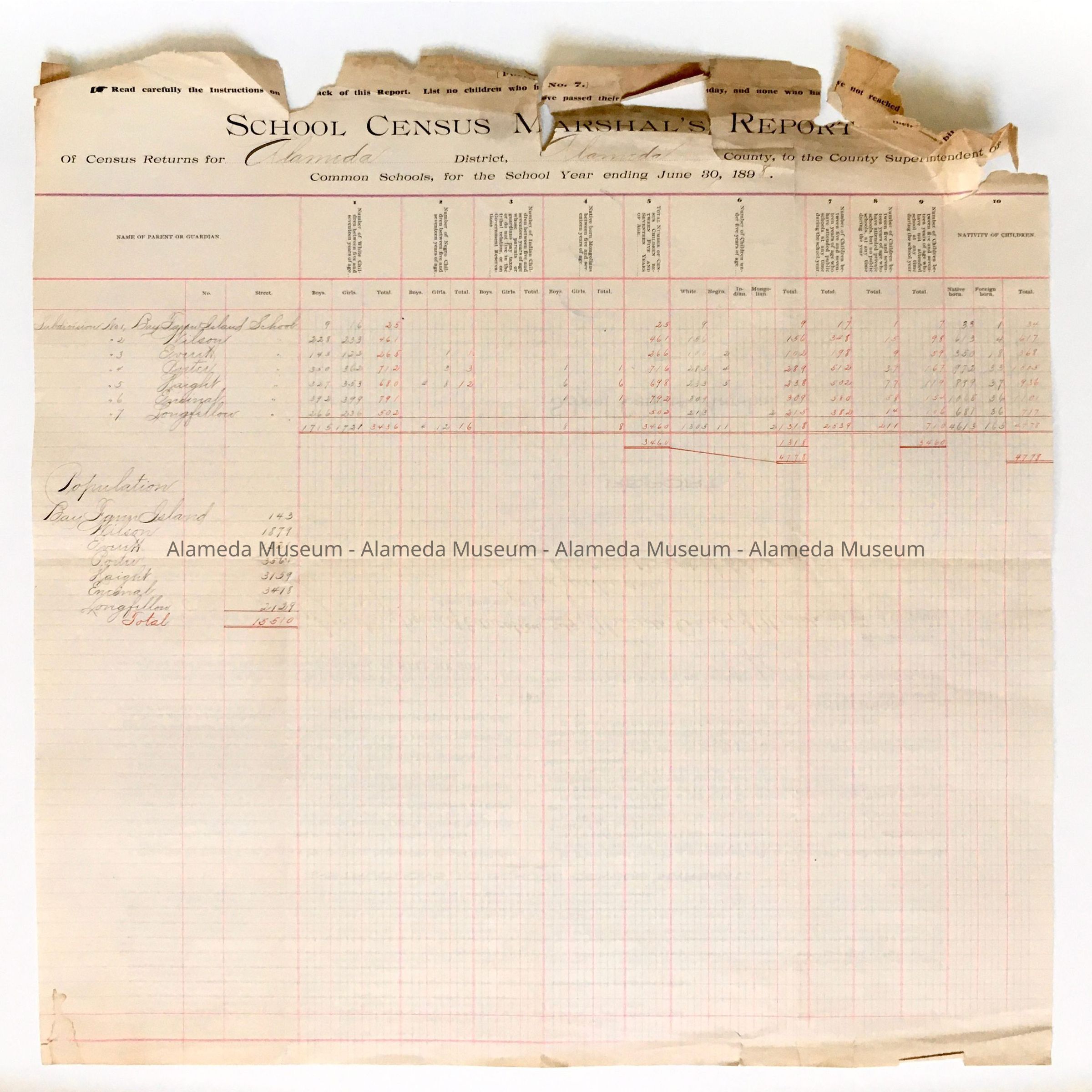SUMMARY REPORT ANNOTATING NUMBER OF STUDENTS ENROLLED IN VARIOUS ALAMEDA PUBLIC SCHOOLS. REPORT INCLUDES BREAKDOWN OF FOUR ETHNIC GROUPS: MONGOLIAN, INDIAN, NEGRO, AND WHITE.