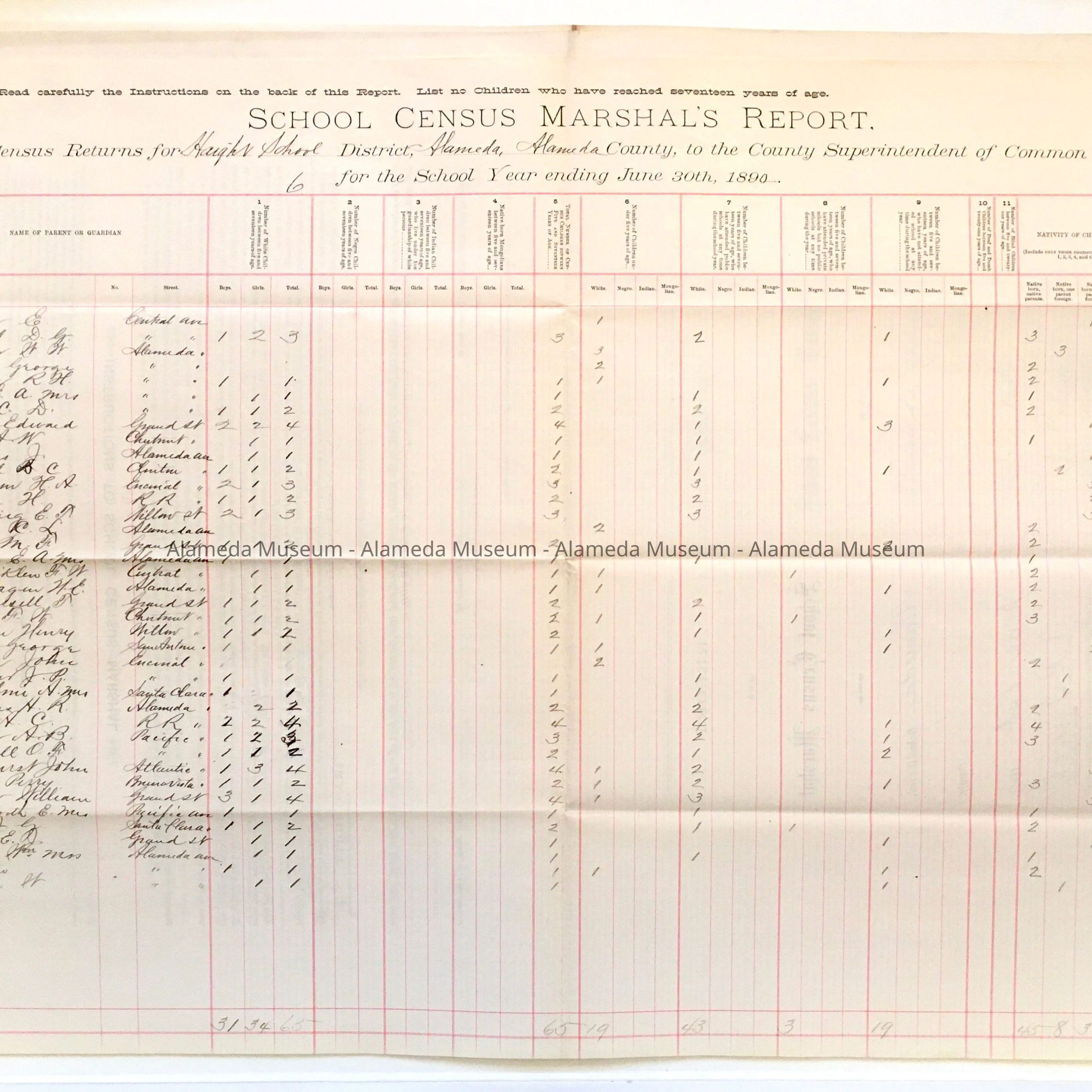 6-PAGE REPORT, WITH BOLD-PRINTED CAPTION, "SCHOOLS CENSUS MARSHAL'S REPORT," IN BLACK-COLORED TYPE ON A WHITE-COLORED BACKGROUND. ACCOUNTANT'S LEDGER STYLE; LINED IN RED- AND BLUE-COLORED COLUMNS.
