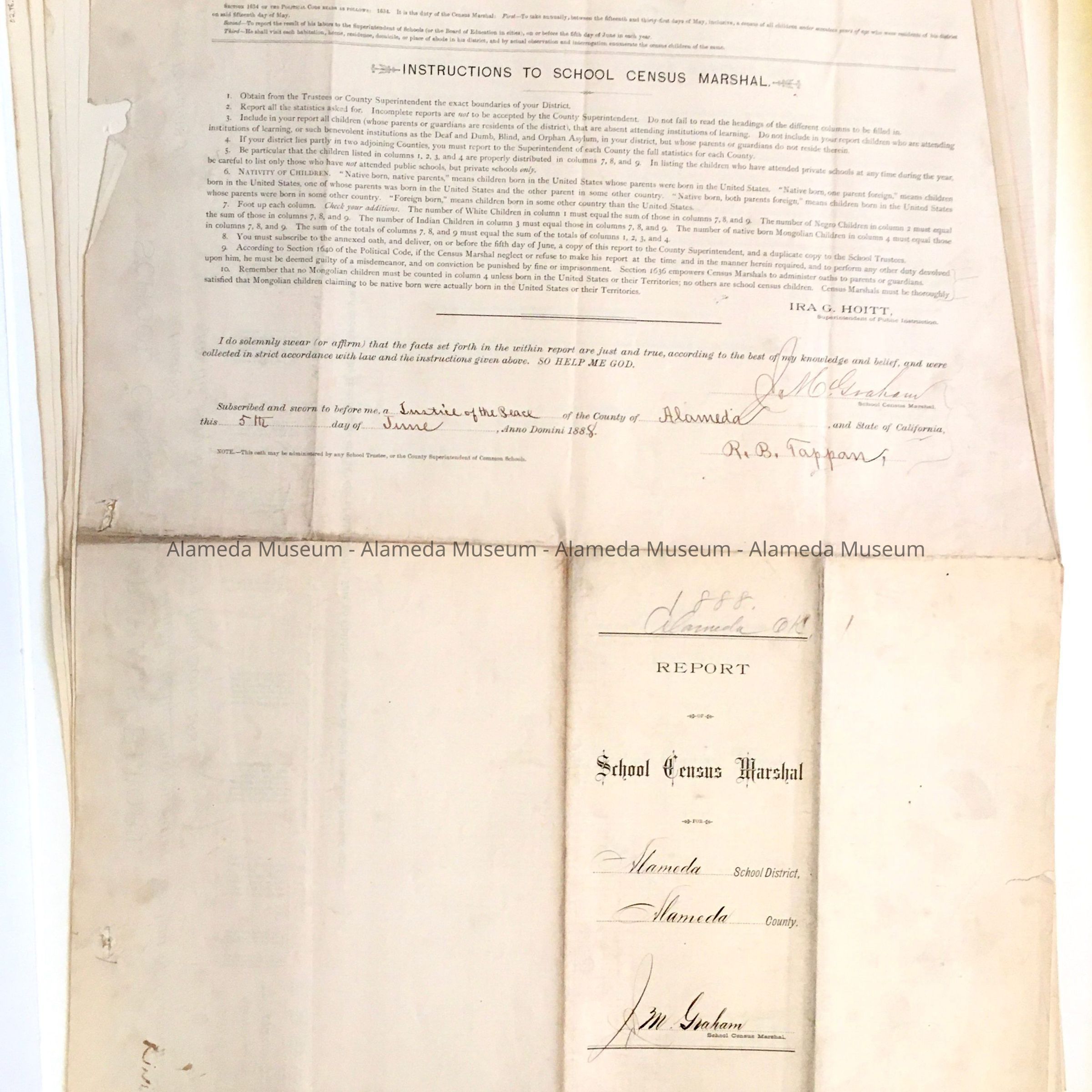 SCHOOL CENSUS 5-PAGE REPORT, WITH BOLD-PRINTED CAPTION, "SCHOOLS CENSUS MARSHAL'S REPORT," IN BLACK-COLORED INK ON A WHITE-COLORED BACKGROUND. INCLUDES NAMES OF STUDENTS ENROLLED IN HIGH SCHOOL. PERIOD ENDING JUNE 30, 1888.
