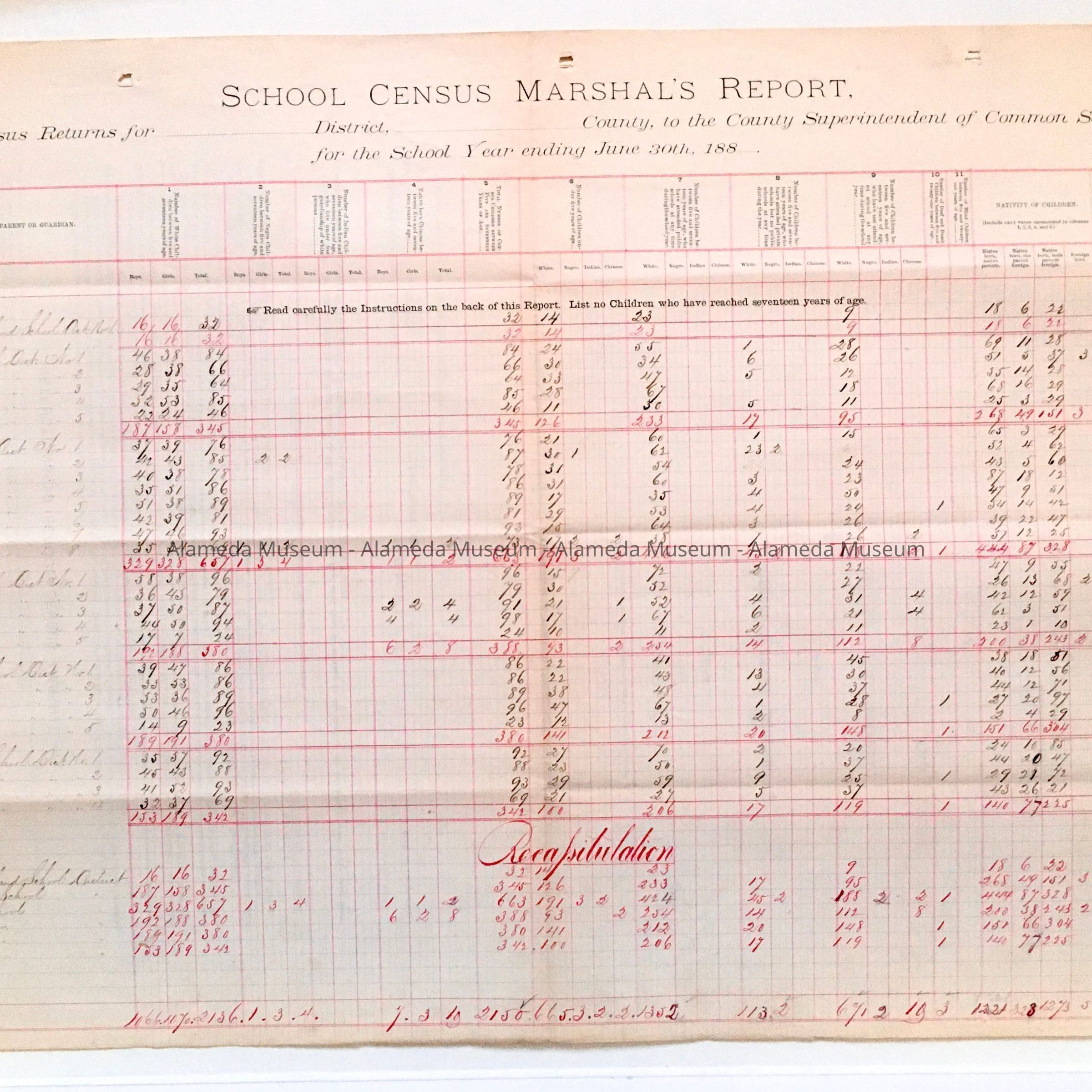 ONE-PAGE REPORT, WITH BOLD-PRINTED CAPTION, "SCHOOLS CENSUS MARSHAL'S REPORT," IN BLACK-COLORED TYPE ON A WHITE-COLORED BACKGROUND. ACCOUNTANT'S LEDGER STYLE WITH RED- AND BLUE-COLORED COLUMNS. ENTRIES IN SEPIA COLORED INK.